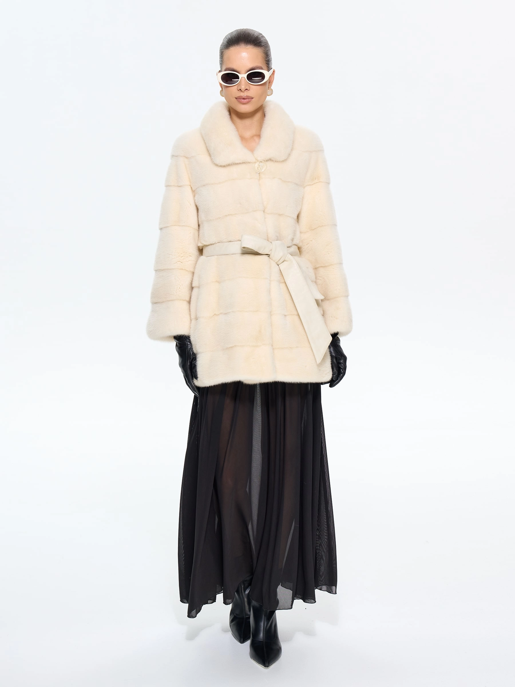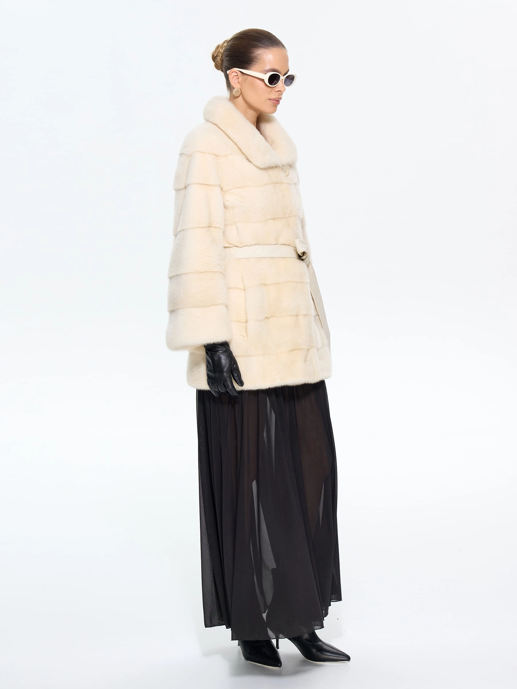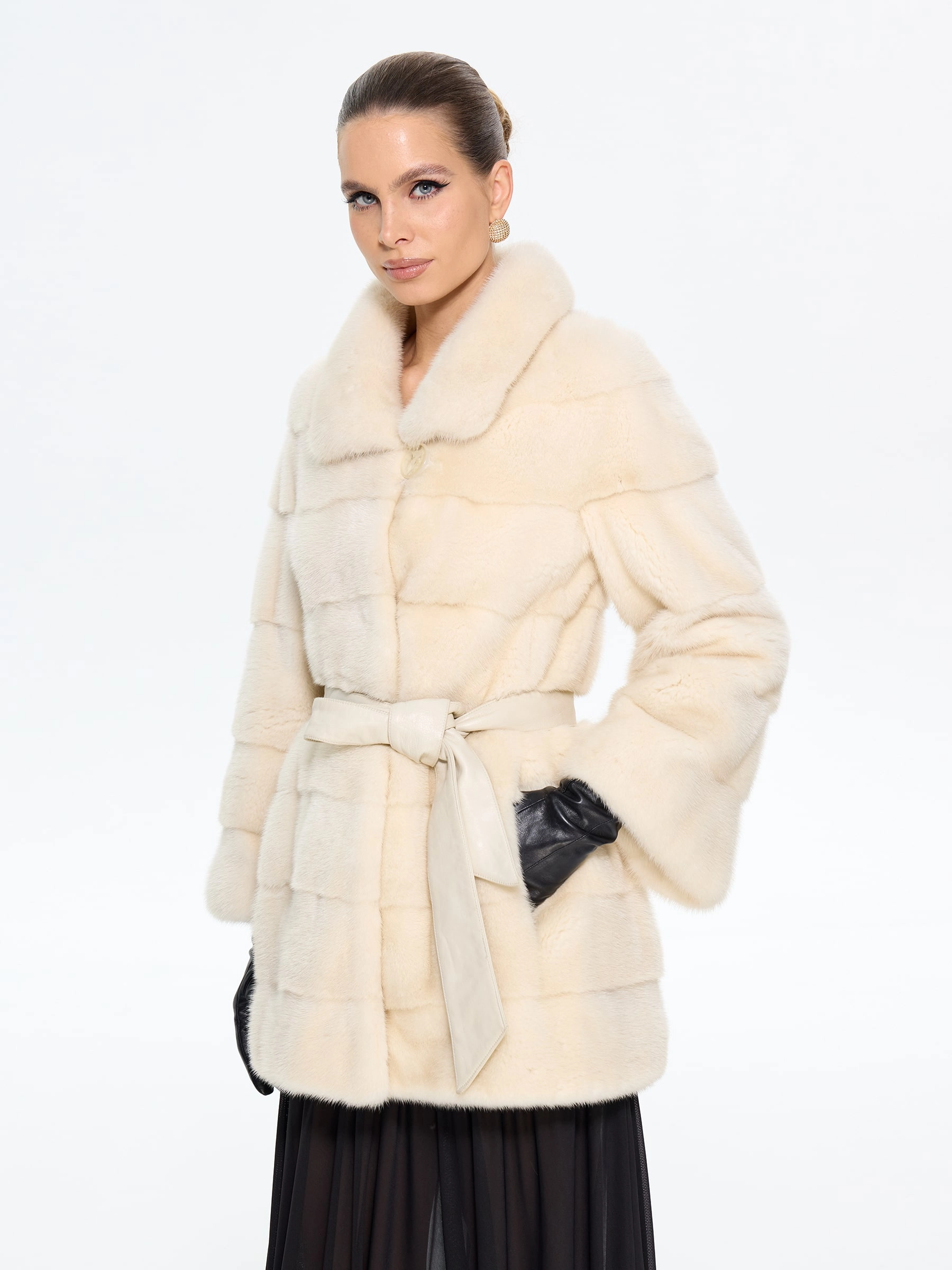 Короткую шубку в бежевом цвете выполнили из густой шелковистой норки. Поперечная раскладка шкурок придает меху глубину и игру света, повышает износостойкость. Прямой силуэт идеален для активной жизни: не сковывает движения в авто, метро, при прогулках. Укороченная длина изделия закрывает бедра. Отложной лаконичный воротник с мягкими линиями: подчёркивает шею, сочетается с шарфами и объемными аксессуарами. Вискозная подкладка – гипоаллергенная, шелковистая на ощупь, предотвращает статическое электричество и добавляет комфорта. Клипсы-застёжки – не повреждают мех, сохраняют чистоту линий, легко фиксируются даже в перчатках. Теплое и лёгкое меховое изделие с классическим кроем, прекрасно сохраняет тепло в морозную погоду- не утяжеляя образ. Модель легко комбинируется с кожаными брюками, платьями-миди, джинсами и oversize-свитерами.