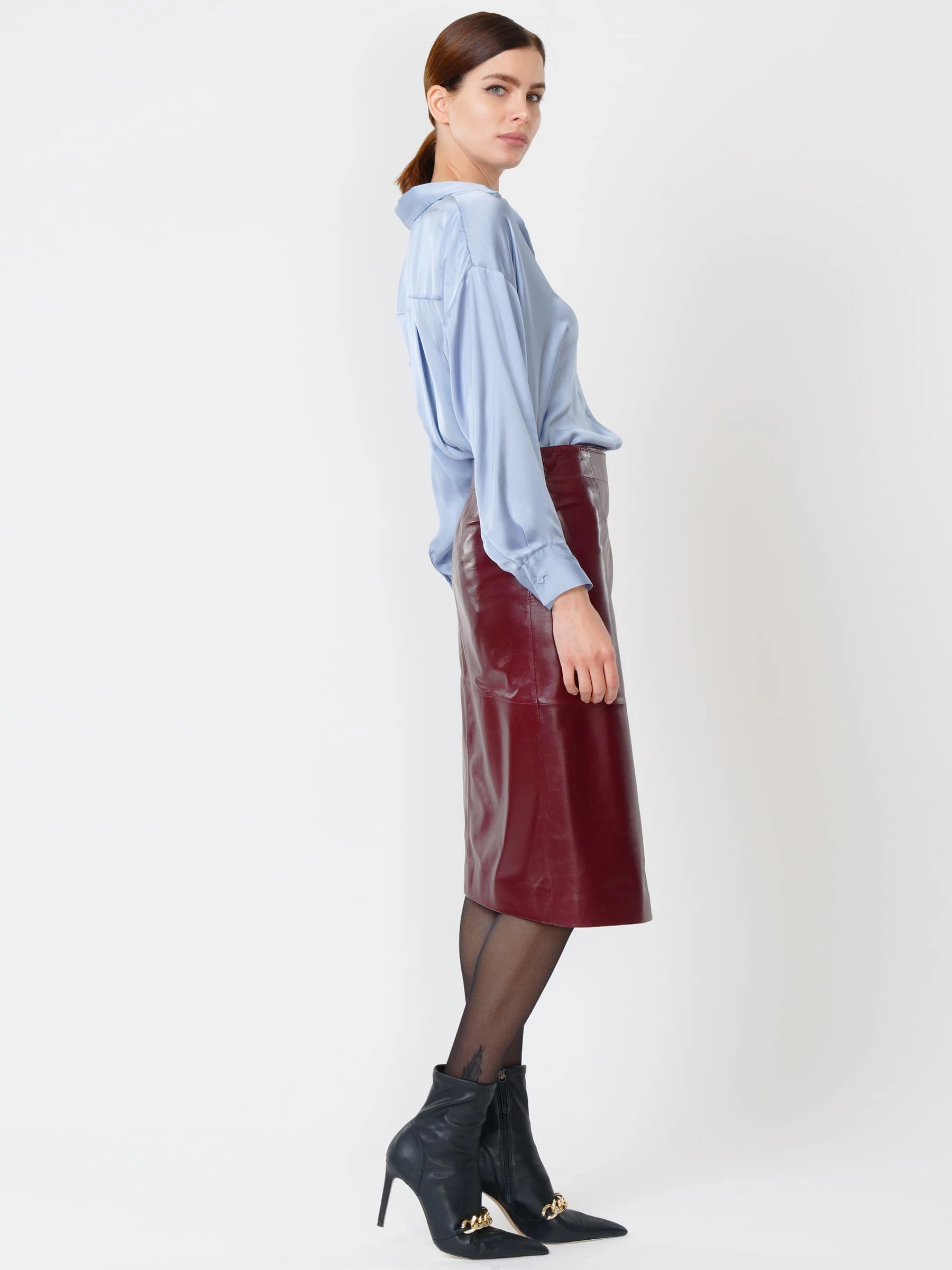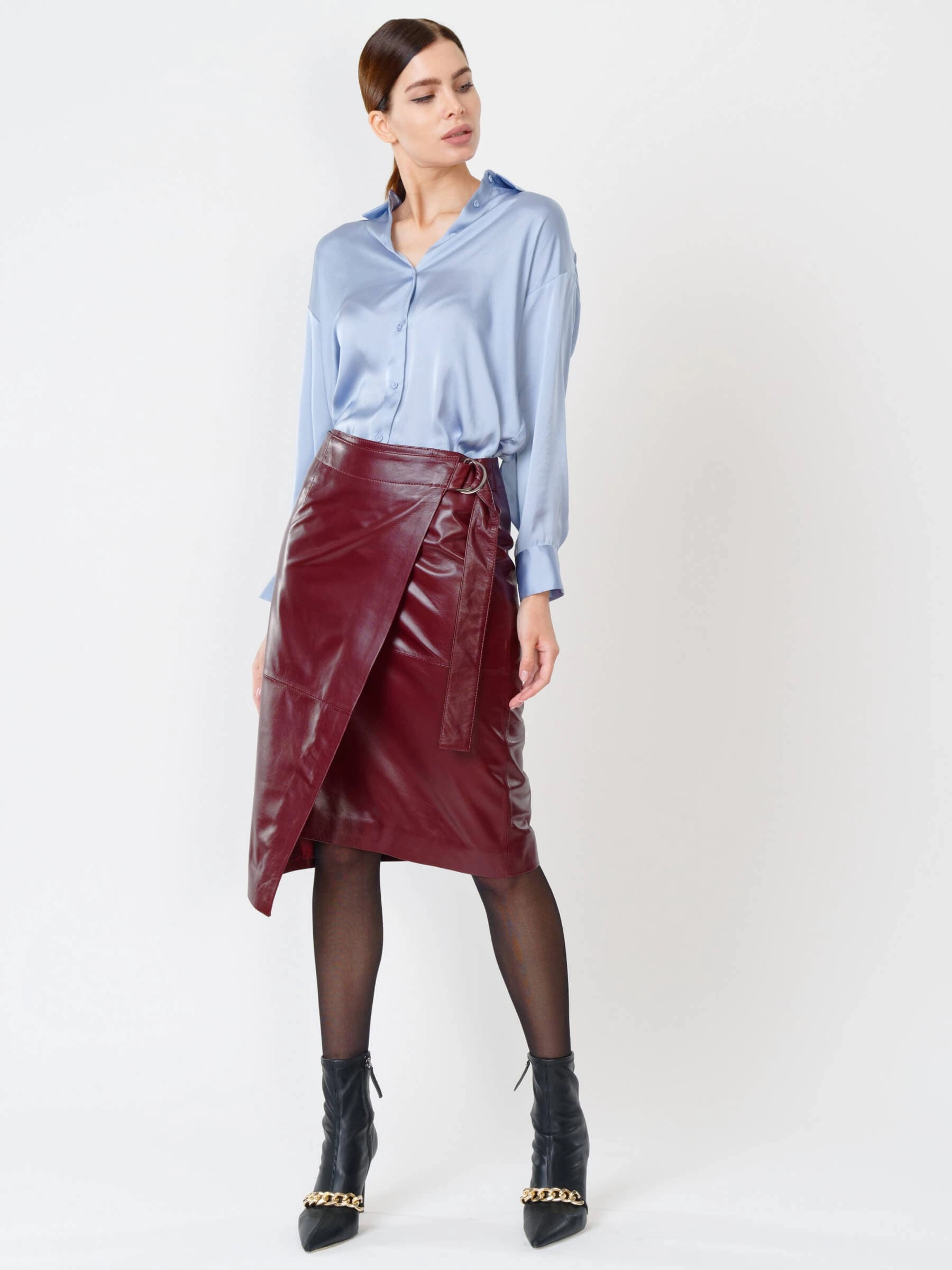 Товар бордовая кожаная юбка миди 07, размер 42, артикул 85420 выполнен из натуральной кожи с застежкой молния. Рассчитан на сезон: демисезон. Длина изделия 65 см, силуэт прямой.