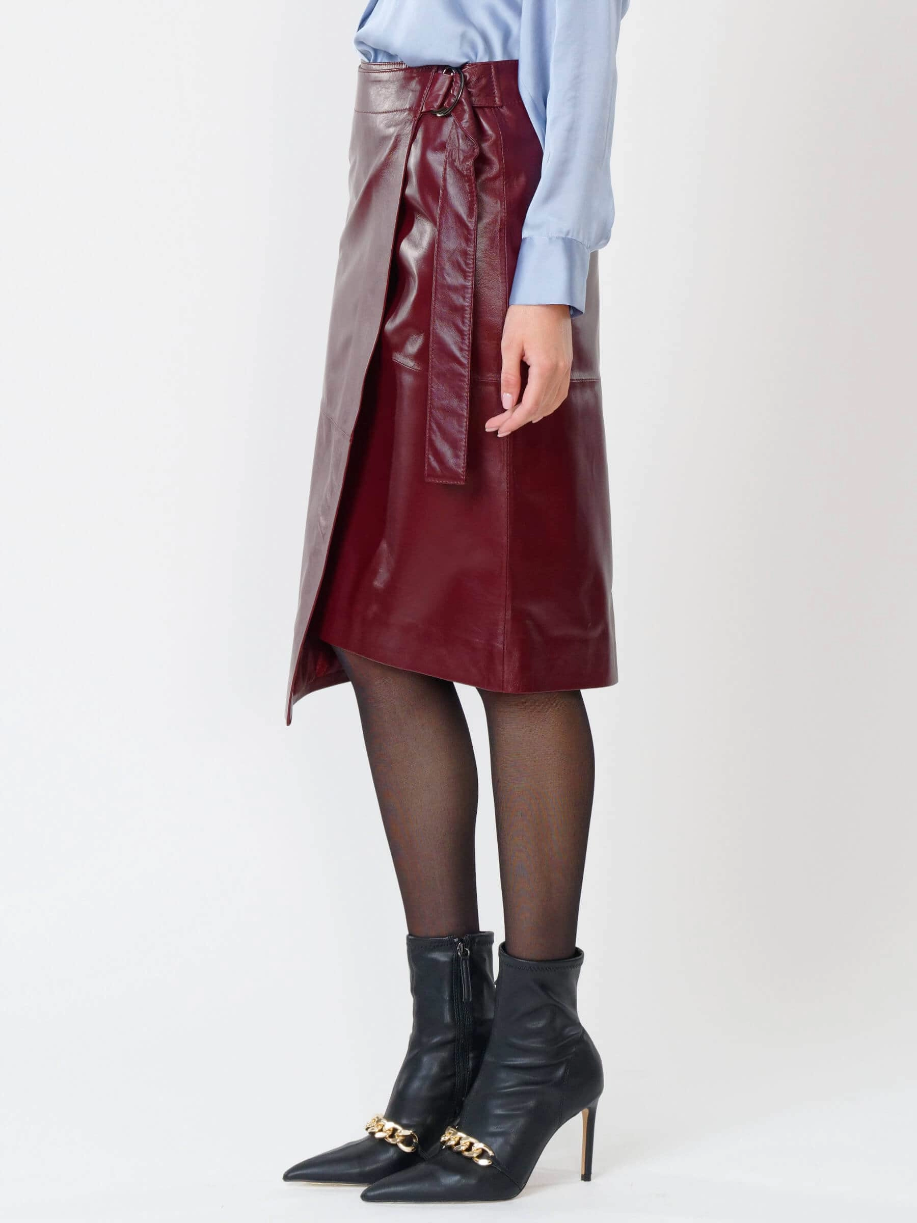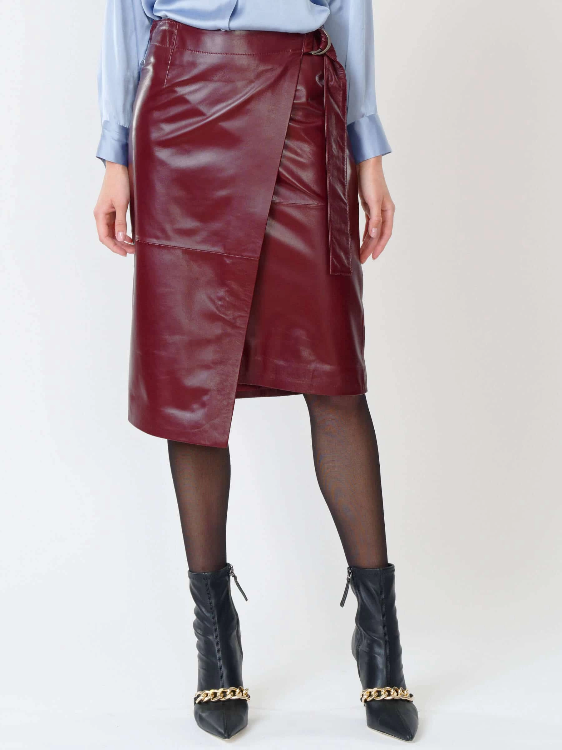 Бордовая кожаная юбка миди 07, размер 42, артикул 85420