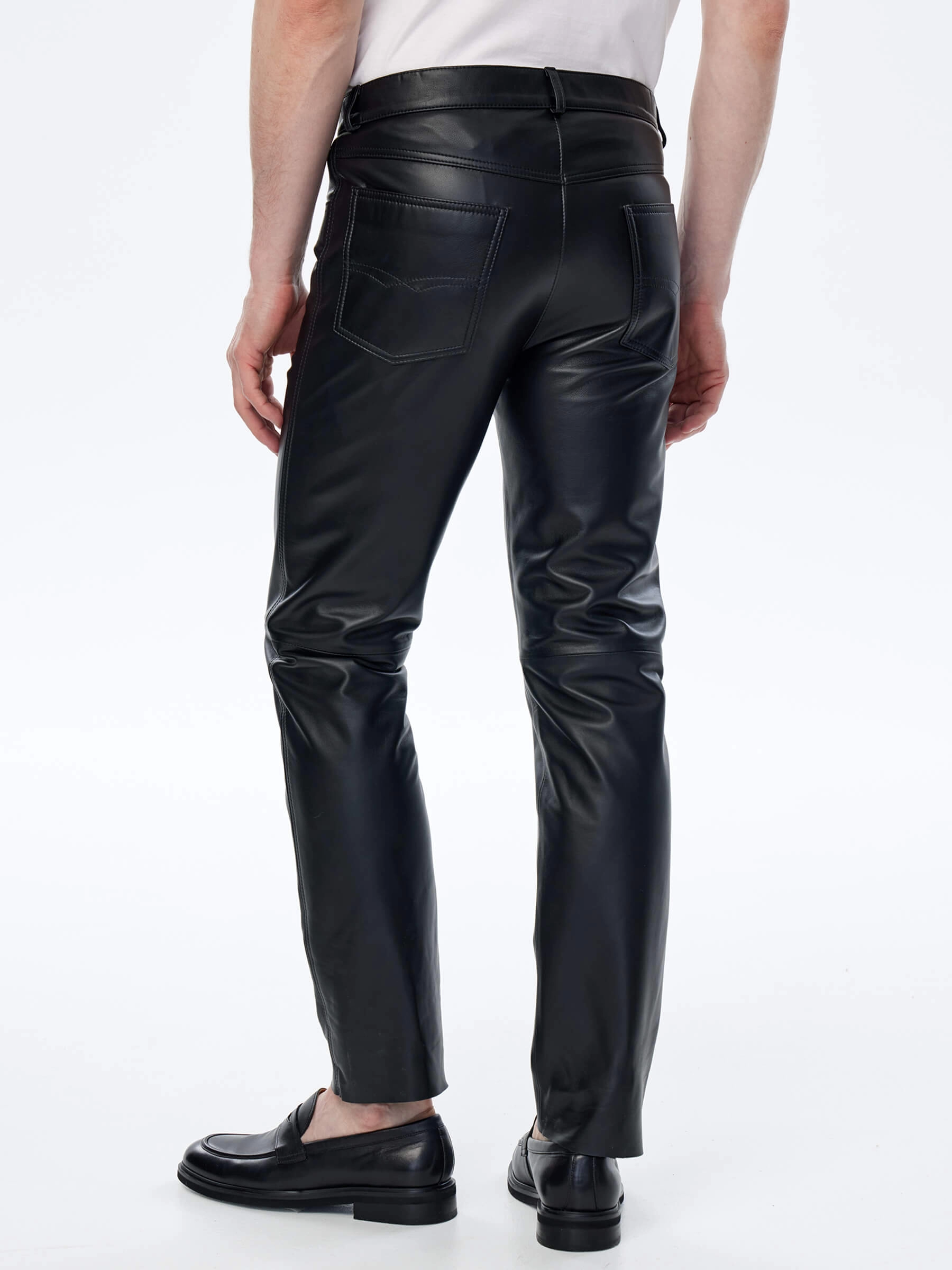 Прямые кожаные джинсы с классическим кроем. Модель поможет сформировать самые разные образы, одинаково удачно сочетаясь как с футболкой и кедами, так и с пальто и челси. Кожа особенно мягкая и слегка эластичная, поэтому вещь комфортно садится по фигуре и не сковывает движения.