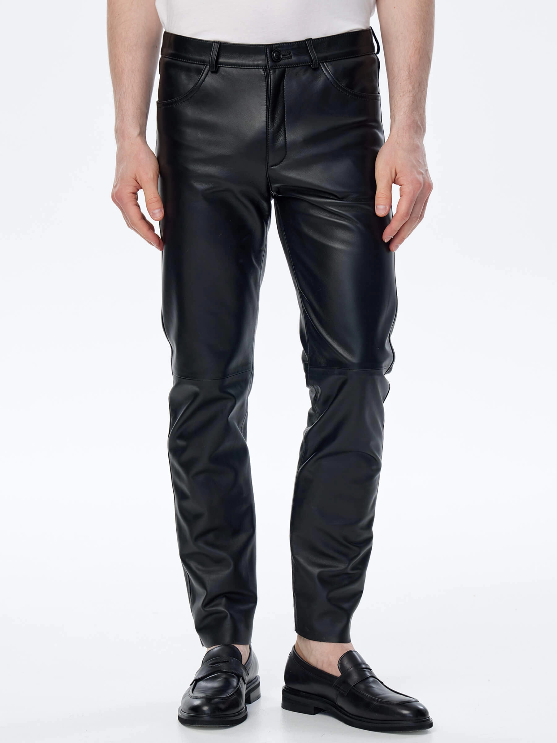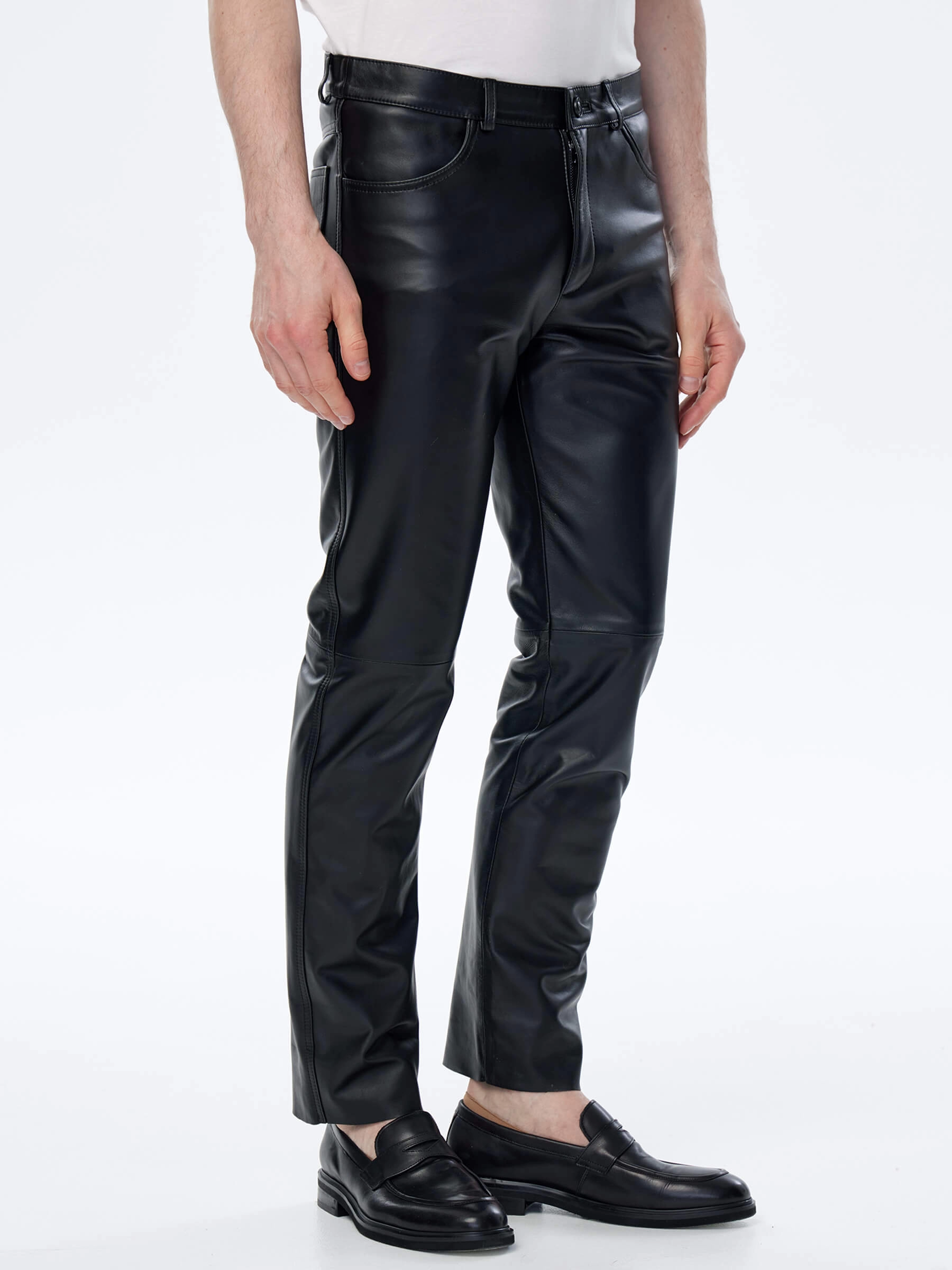 Товар мужские брюки из натуральной кожи премиум класса 01, черные, размер 48, артикул 120020 выполнен из натуральной кожи с застежкой молния. Рассчитан на сезон: демисезон. Длина изделия 103 см, силуэт прямой.
