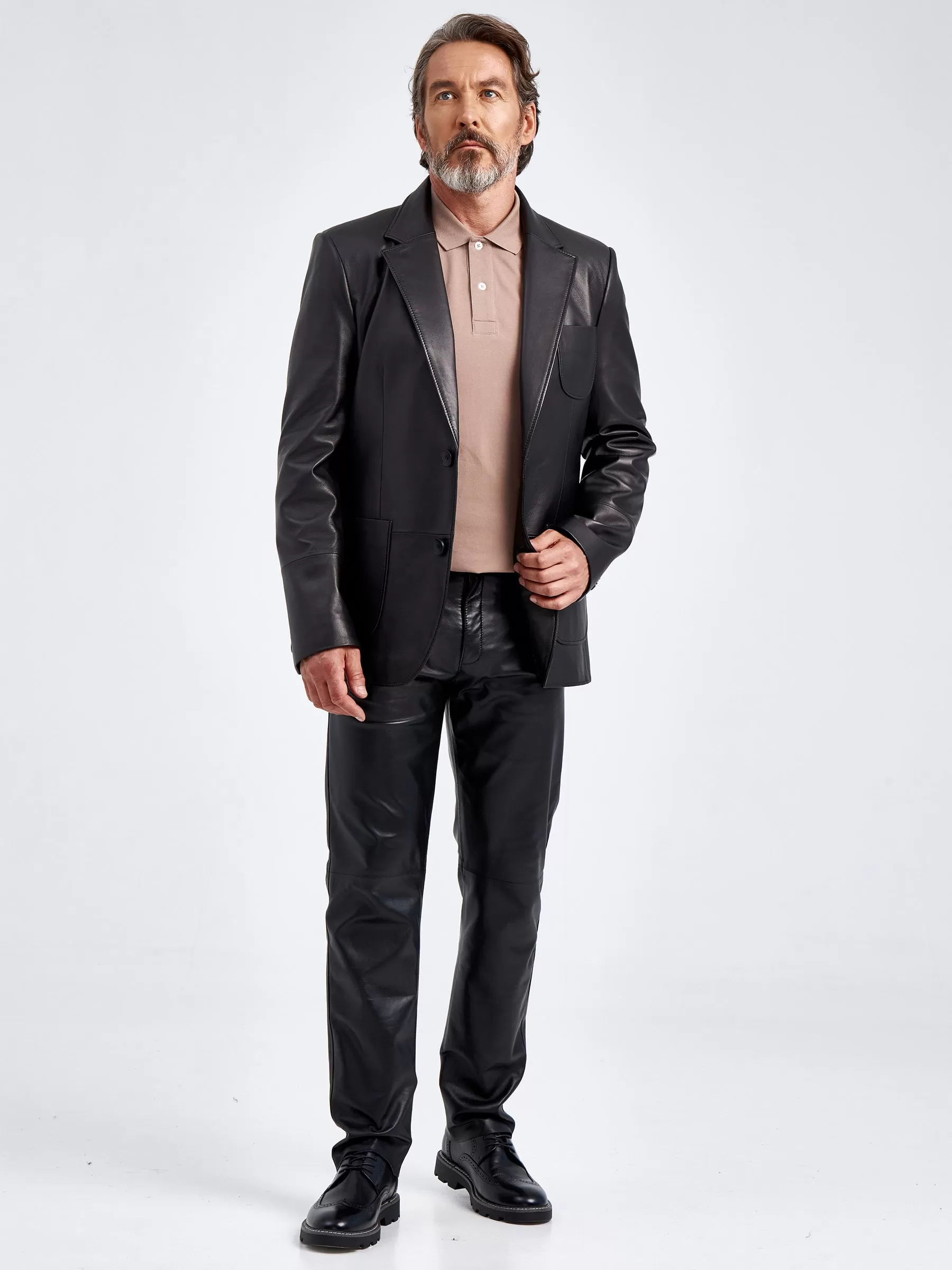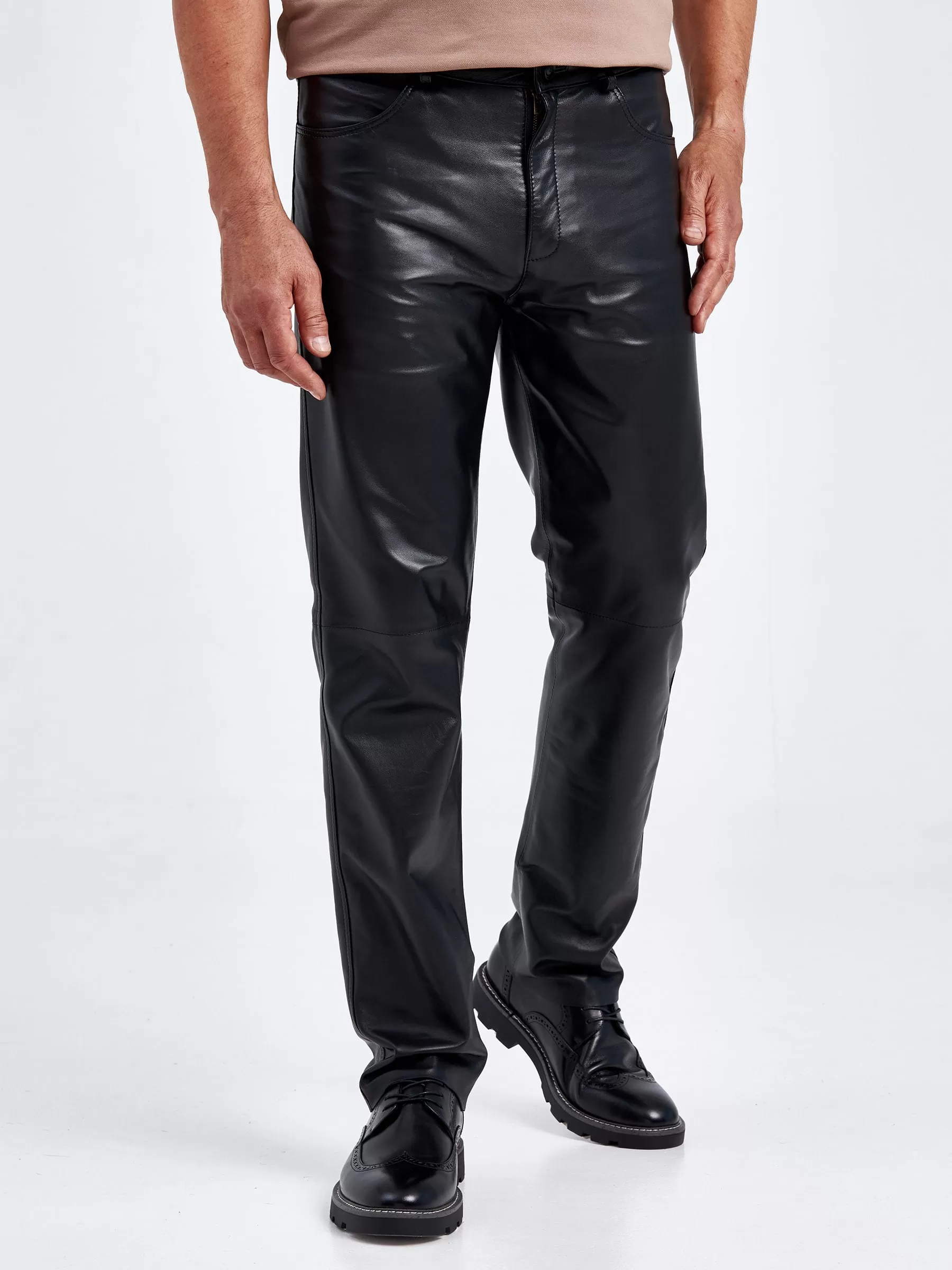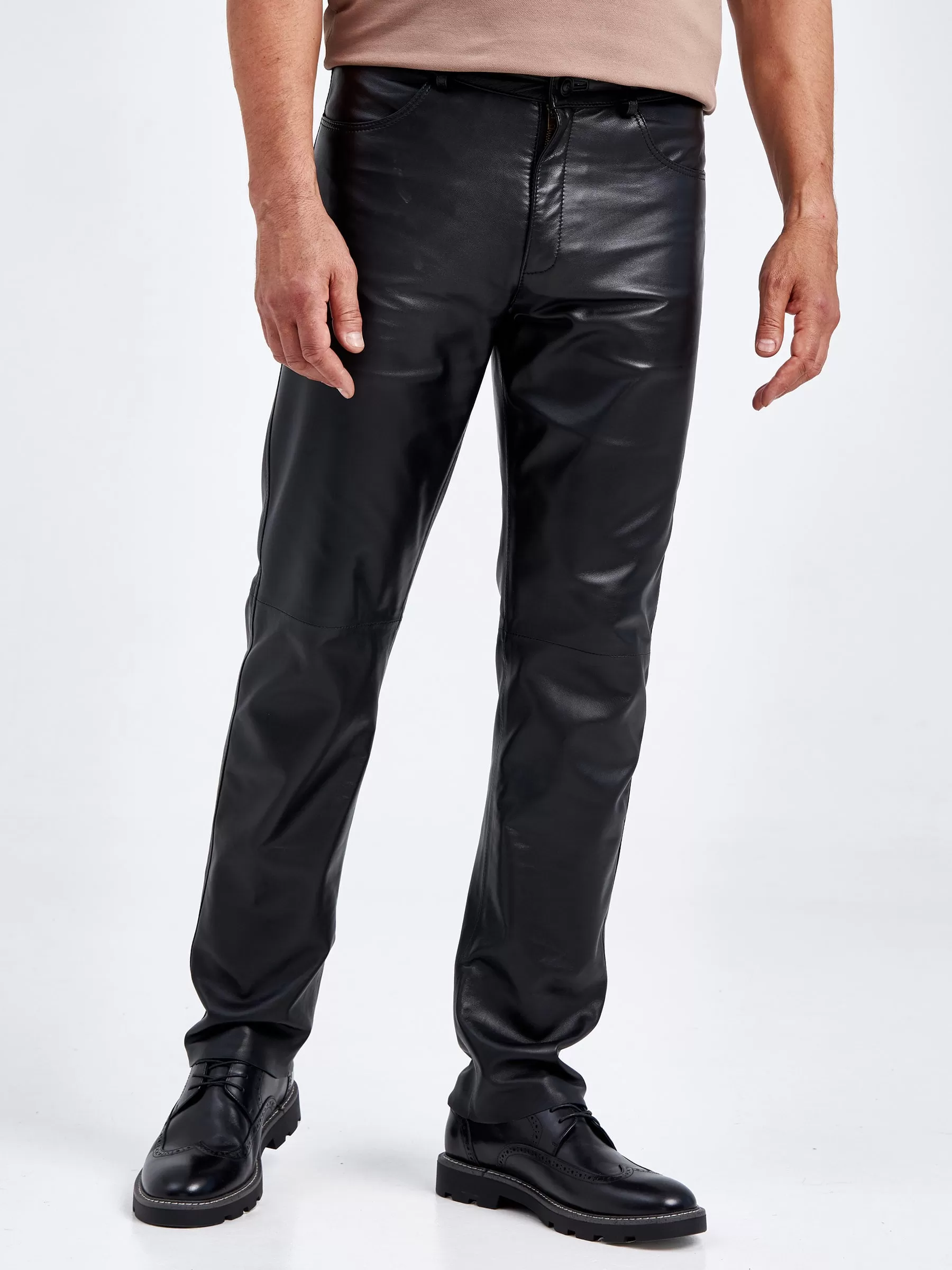 Товар мужские брюки из натуральной кожи премиум класса 01, черные, размер 48, артикул 120011 выполнен из натуральной кожи с застежкой молния. Рассчитан на сезон: демисезон. Длина изделия 103 см, силуэт прямой.