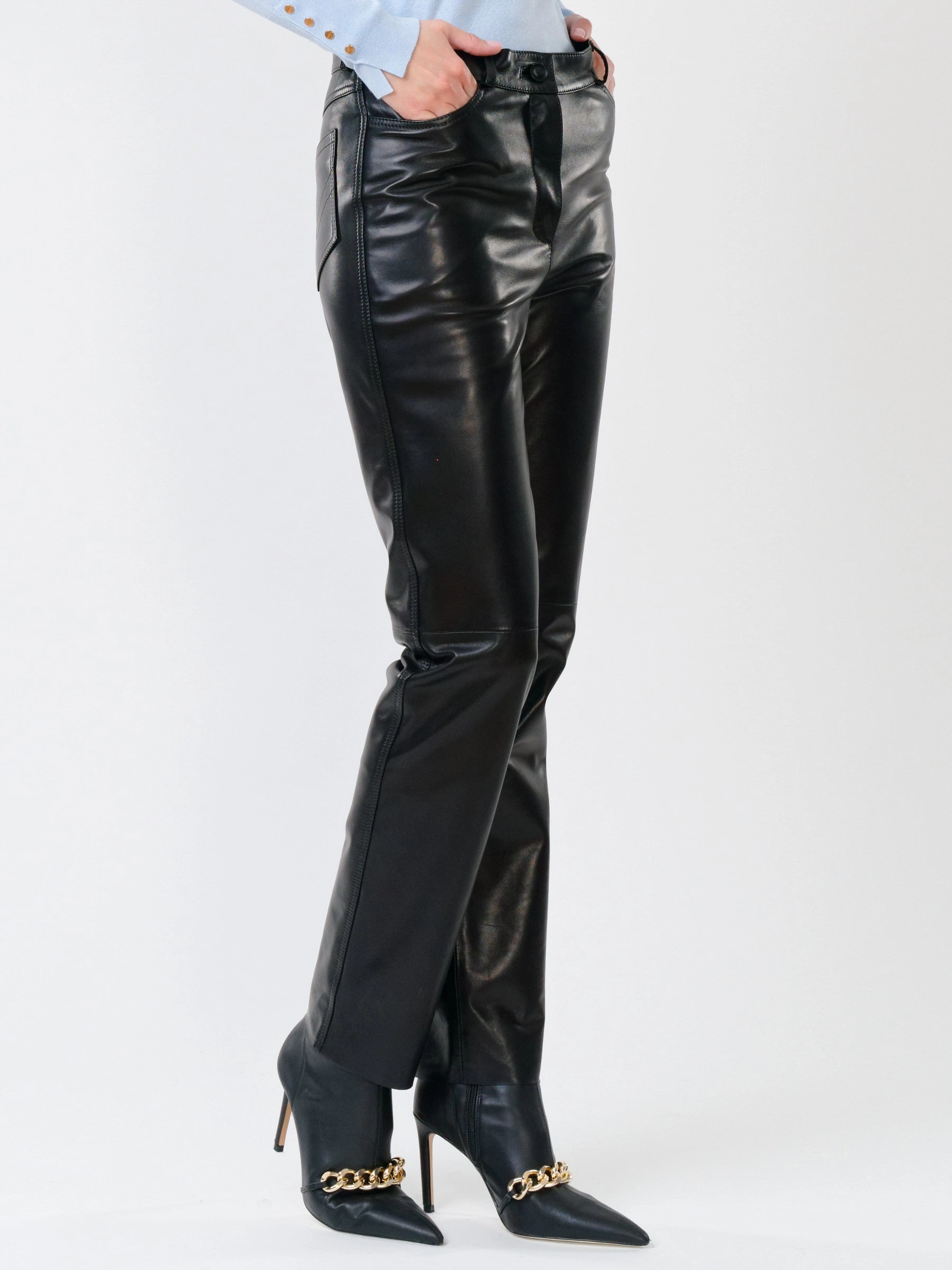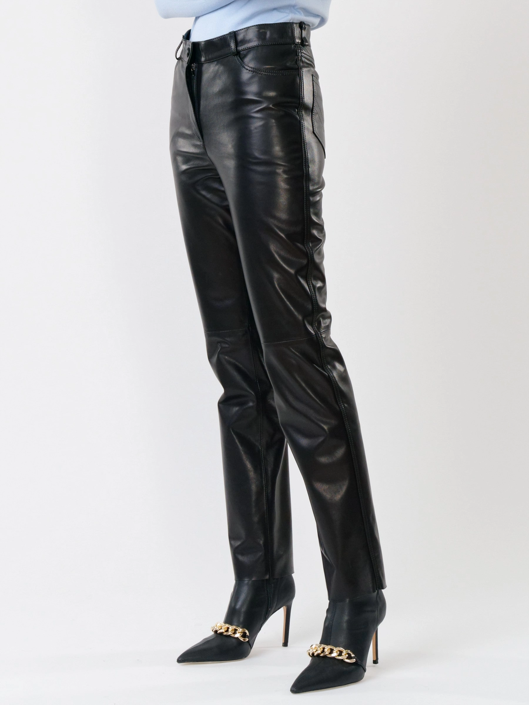 Товар кожаные зауженные женские брюки 02, черные, размер 44, артикул 85230 выполнен из натуральной кожи с застежкой молния. Рассчитан на сезон: демисезон. Длина изделия 105 см, силуэт прямой.