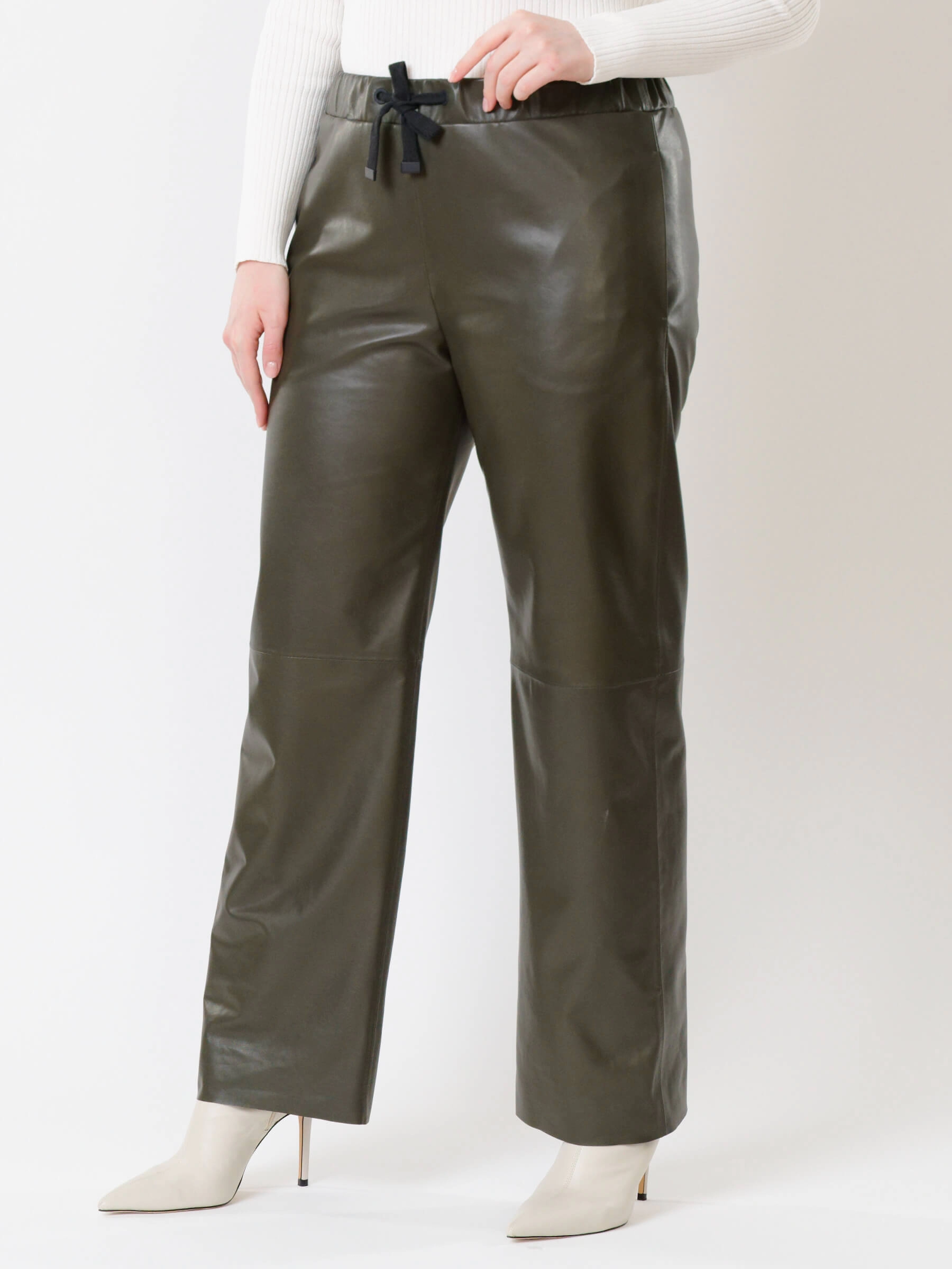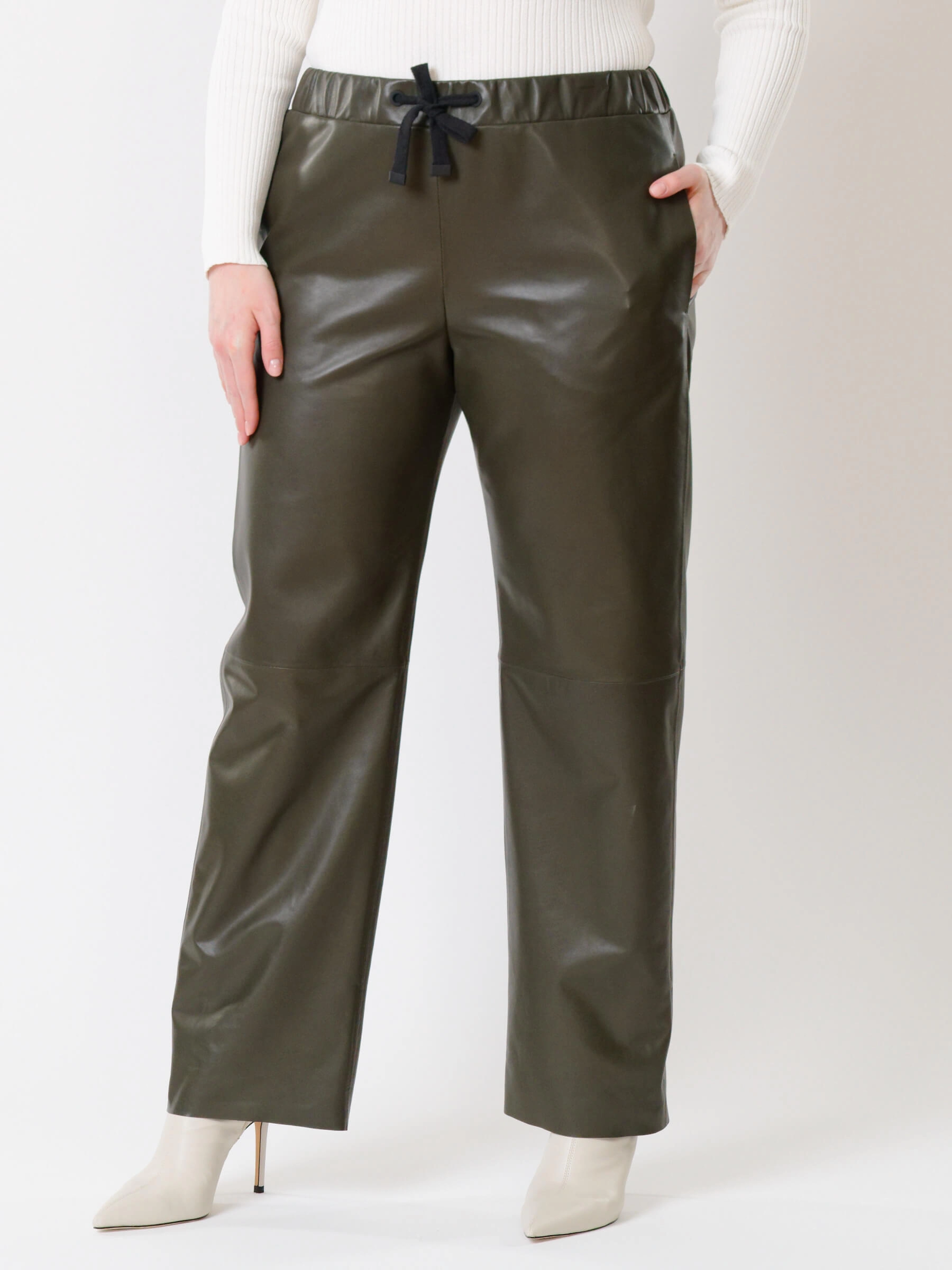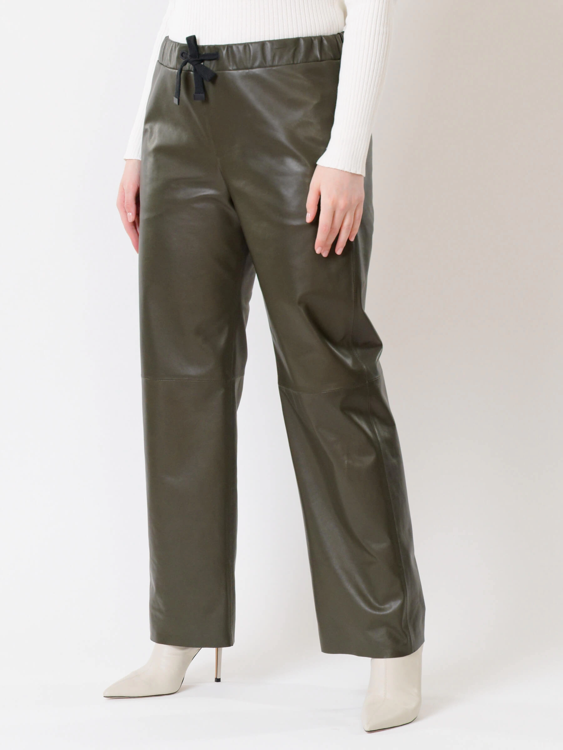 Широкие брюки из натуральной кожи оливкового цвета на эластичной кулиске. Свободный силуэт длиной 103 см обеспечивает непринужденную роскошь и максимальный комфорт. Сочетайте с объемным худи и кроссовками для уличного образа или с каблуками и шелковым топом — для дерзкого контраста.