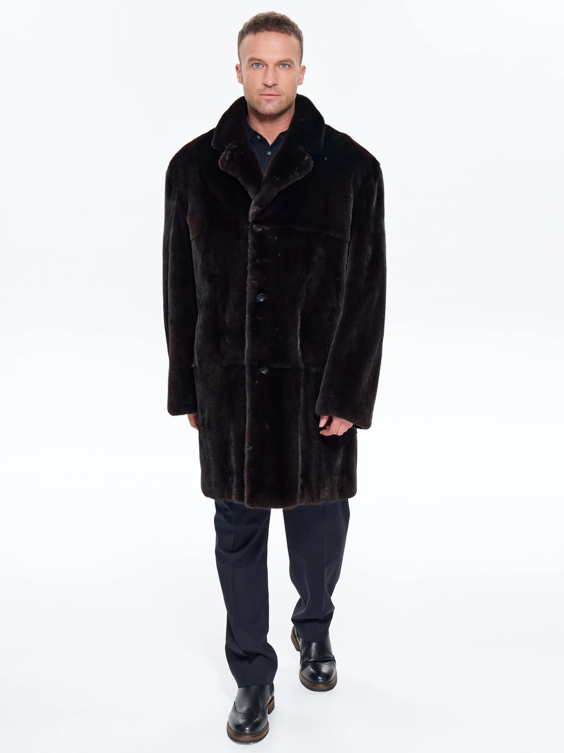 Классическую мужскую шубу пошили из густого меха норки премиум-класса. Строгий английский воротник - подчеркивает аристократизм, совместим с галстуком и шарфами, а прямой крой подчеркивает мужественную строгость».Универсальная длина - закрывает бедра, баланс тепла и мобильности. Полное отсутствие декора акцентирует качество меха. Не высокая шлица сзади улучшает подвижность при ходьбе. Изделие отлично сохраняет тепло в морозную погоду. Модель дополнили двумя внутренними и двумя боковыми карманами. Застежка: пуговицы.
