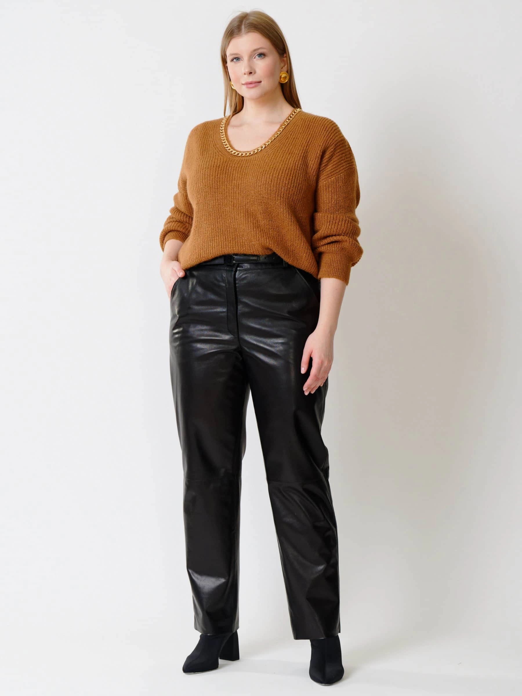 Эксклюзивные женские брюки свободного кроя из натуральной кожи сочетают в себе инновационные технологии и традиционное кожевенное искусство, предлагая прямой крой длиной 105 см с едва заметным расширением к низу для создания идеальной вертикали. Модель отличается авторской технологией обработки кожи, сохраняющей мягкость и пластичность без заломов, эргономичными карманами с системой скрытых швов для незаметной вместительности, эксклюзивной подкладкой из вискозы, а также усовершенствованной застежкой с двойной молнией и магнитной фиксацией для идеального прилегания. Эти брюки станут инвестицией в безупречный стиль, легко сочетаясь с объемными свитерами, строгими пиджаками или кожаными косухами для создания разнообразных образов.