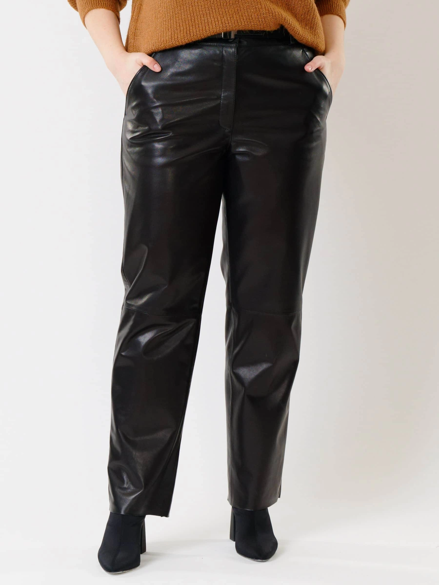 Товар черные прямые женские кожаные брюки 04, размер 46, артикул 85392 выполнен из натуральной кожи с застежкой молния. Рассчитан на сезон: демисезон. Длина изделия 105 см, силуэт свободный.