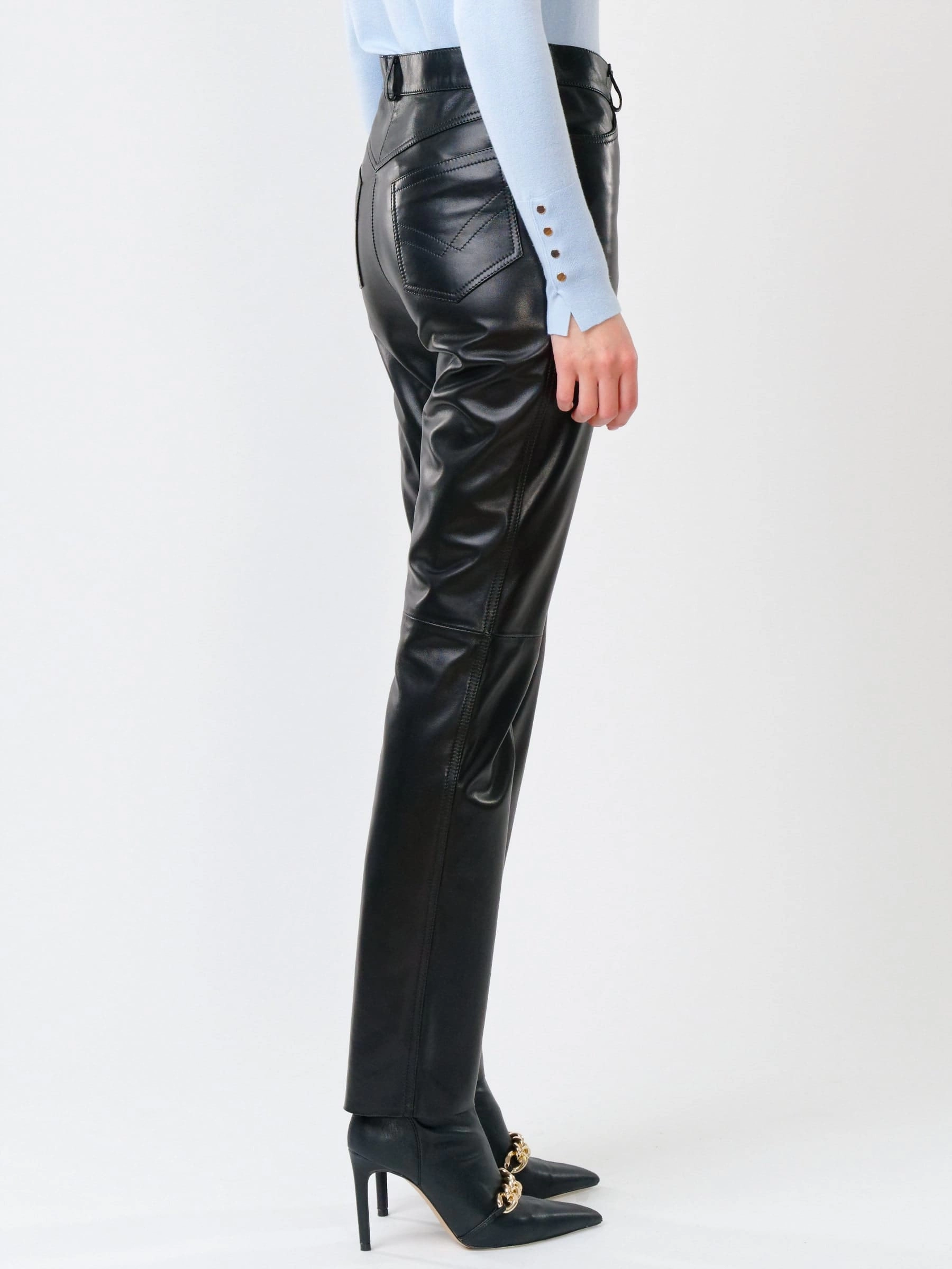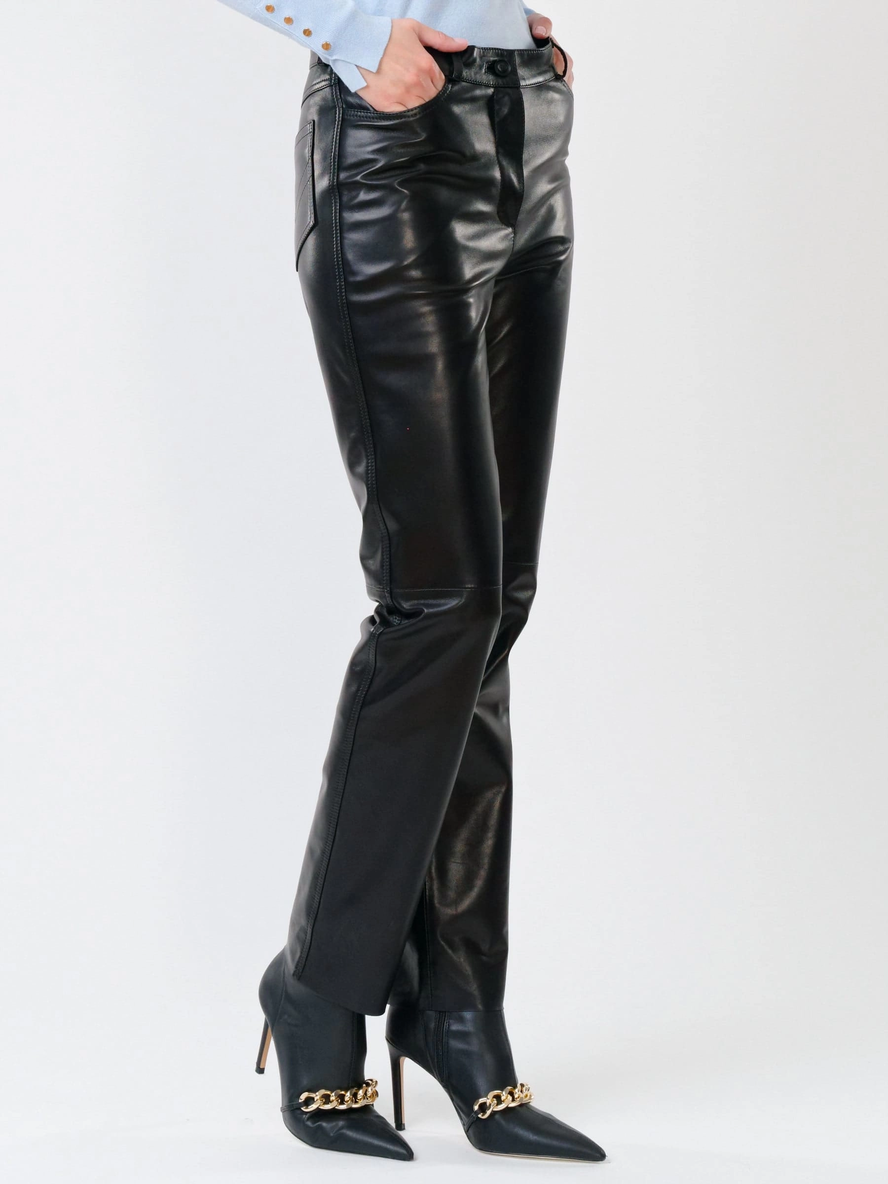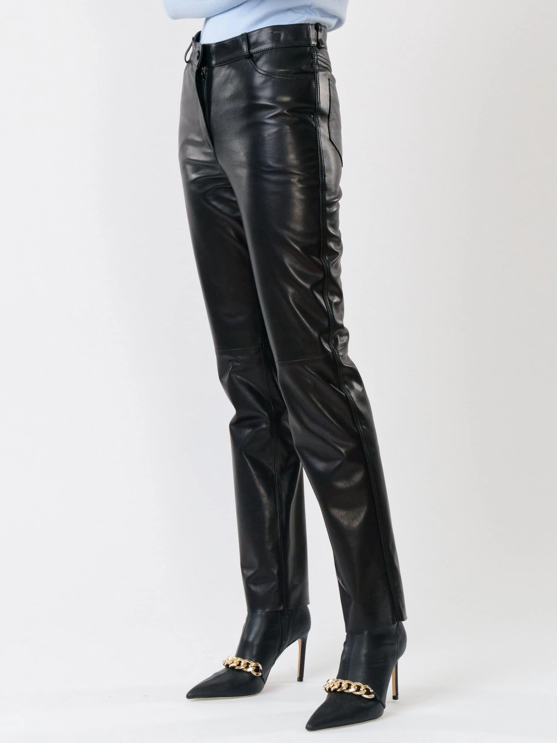 Товар черные зауженные женские кожаные брюки 02, размер 44, артикул 85232 выполнен из натуральной кожи с застежкой молния. Рассчитан на сезон: демисезон. Длина изделия 105 см, силуэт прямой.