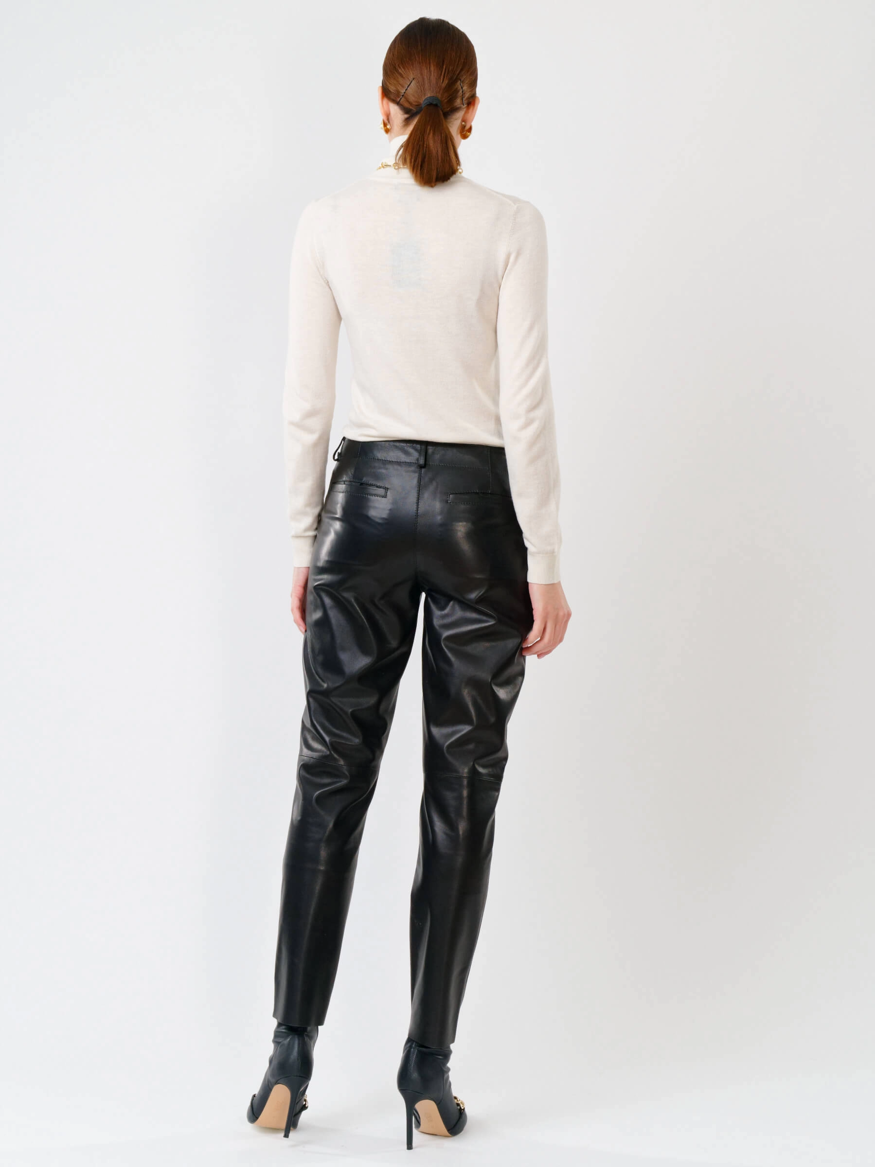 Утончённые женские брюки зауженного кроя из натуральной кожи с элегантной длиной до 98 см. Модель сдержанного дизайна дополнена удобными врезными карманами и мягкой подкладкой из вискозы для максимального комфорта. Потайная молния с аккуратной планкой придаёт образу завершённость. Эти брюки легко впишутся в деловой гардероб, сочетаясь с классической блузой, и в повседневный стиль — с объёмным свитером или кедами. Идеальный выбор для тех, кто ценит лаконичность и универсальность
