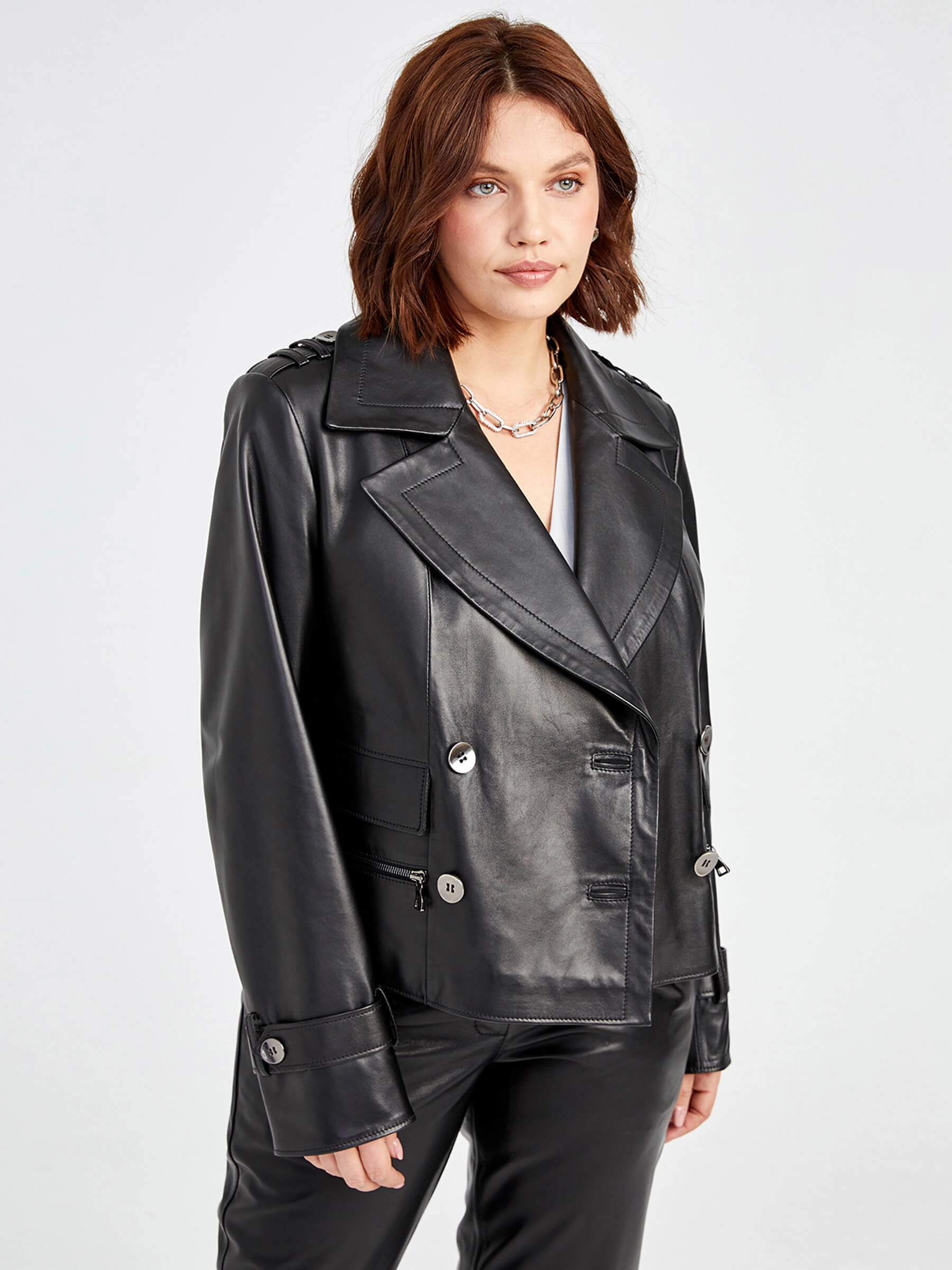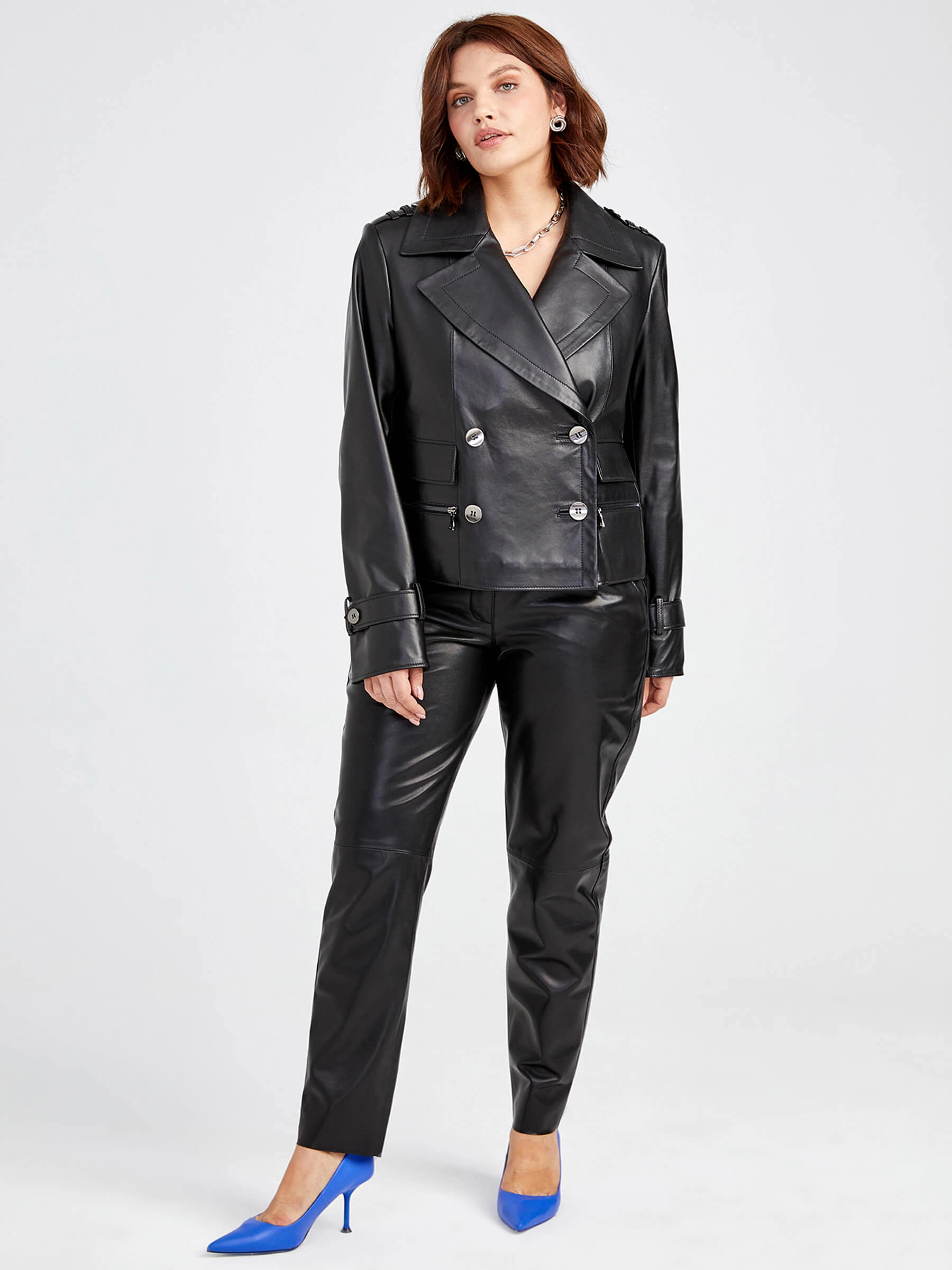 Этот женский двухбортный пиджак из глянцевой натуральной кожи — эталон безупречного кроя и дерзкой элегантности. Короткая длина (57 см) прямого силуэта с акцентированной линией плеч и классическим английским воротником подчеркивает фигуру, а двурядная застёжка на пуговицах придаёт образу строгость и динамику. Модель выполнена с удобной подкладкой из смеси вискозы и полиэстера (53%/47%) для комфорта в сезон осень-зима. Сочетайте пиджак с базовым топом, джинсами свободного кроя и высокими ботфортами, чтобы создать мощный, эффектный образ, в котором каждая деталь говорит о вашем уверенном вкусе.