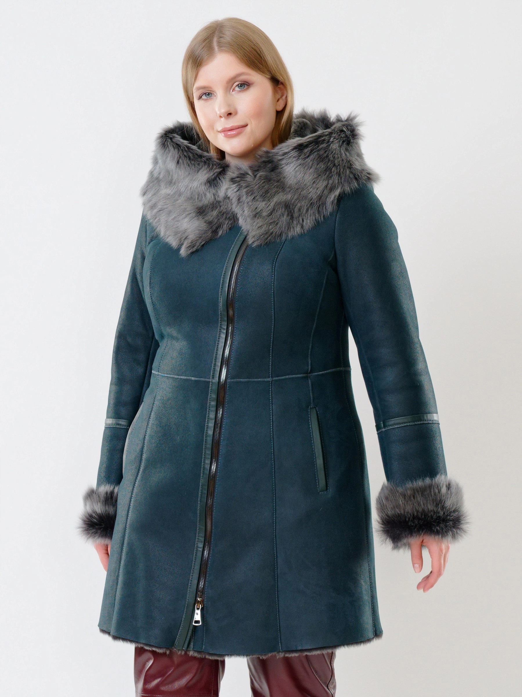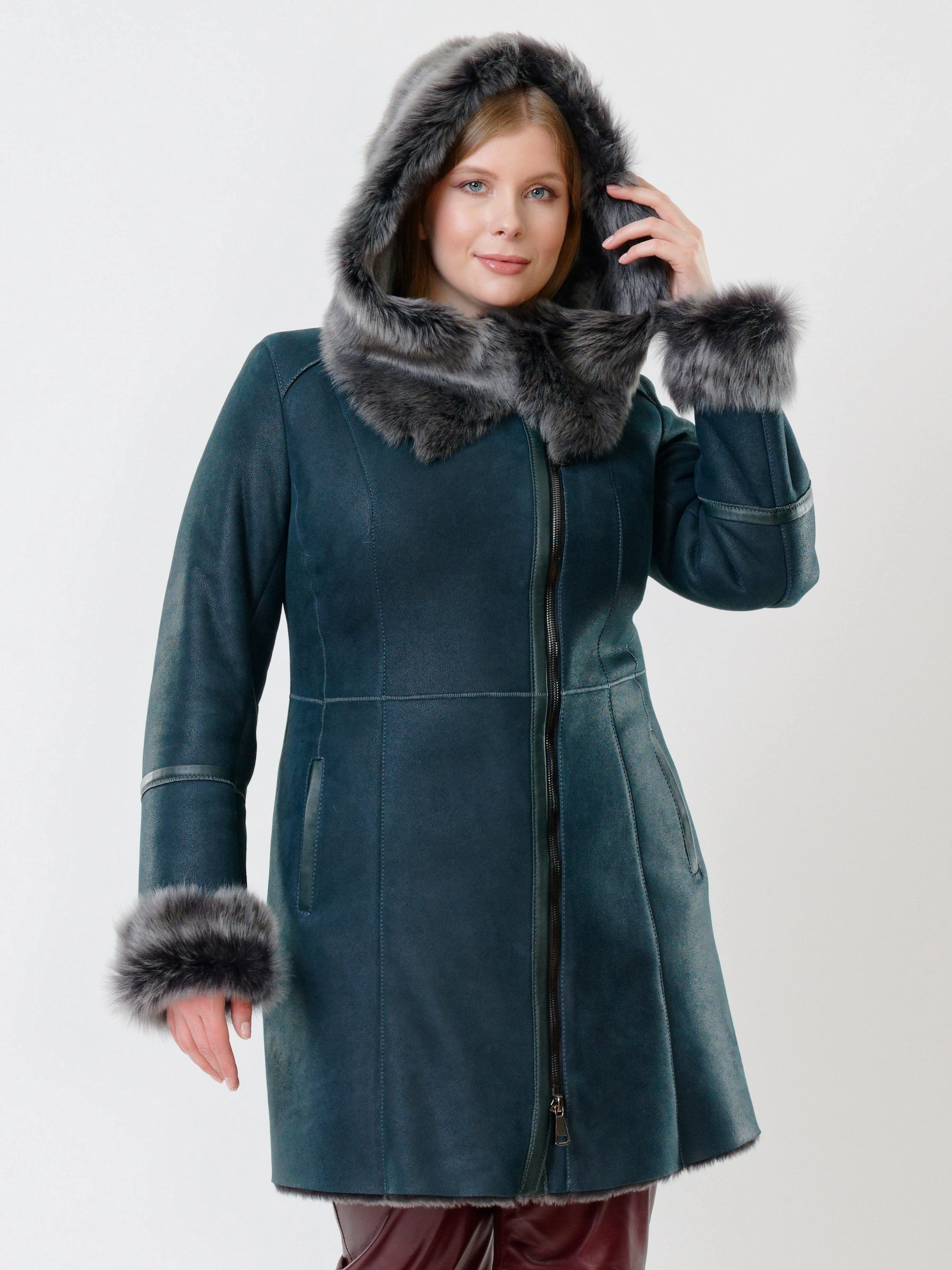 Практичная дублёнка из овчины мерино и кожаные брюки. Удобный капюшон дублёнки украшен опушью из тосканской овчины. Универсальное сочетание для холодной зимней погоды. Безупречная работа наших портных.