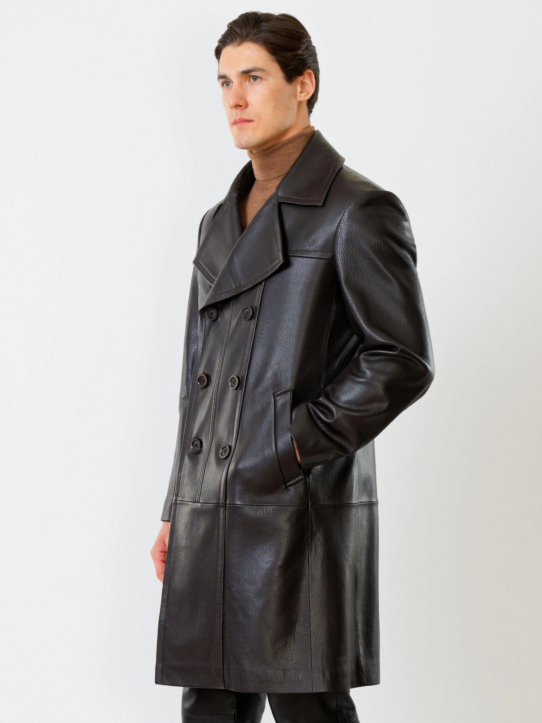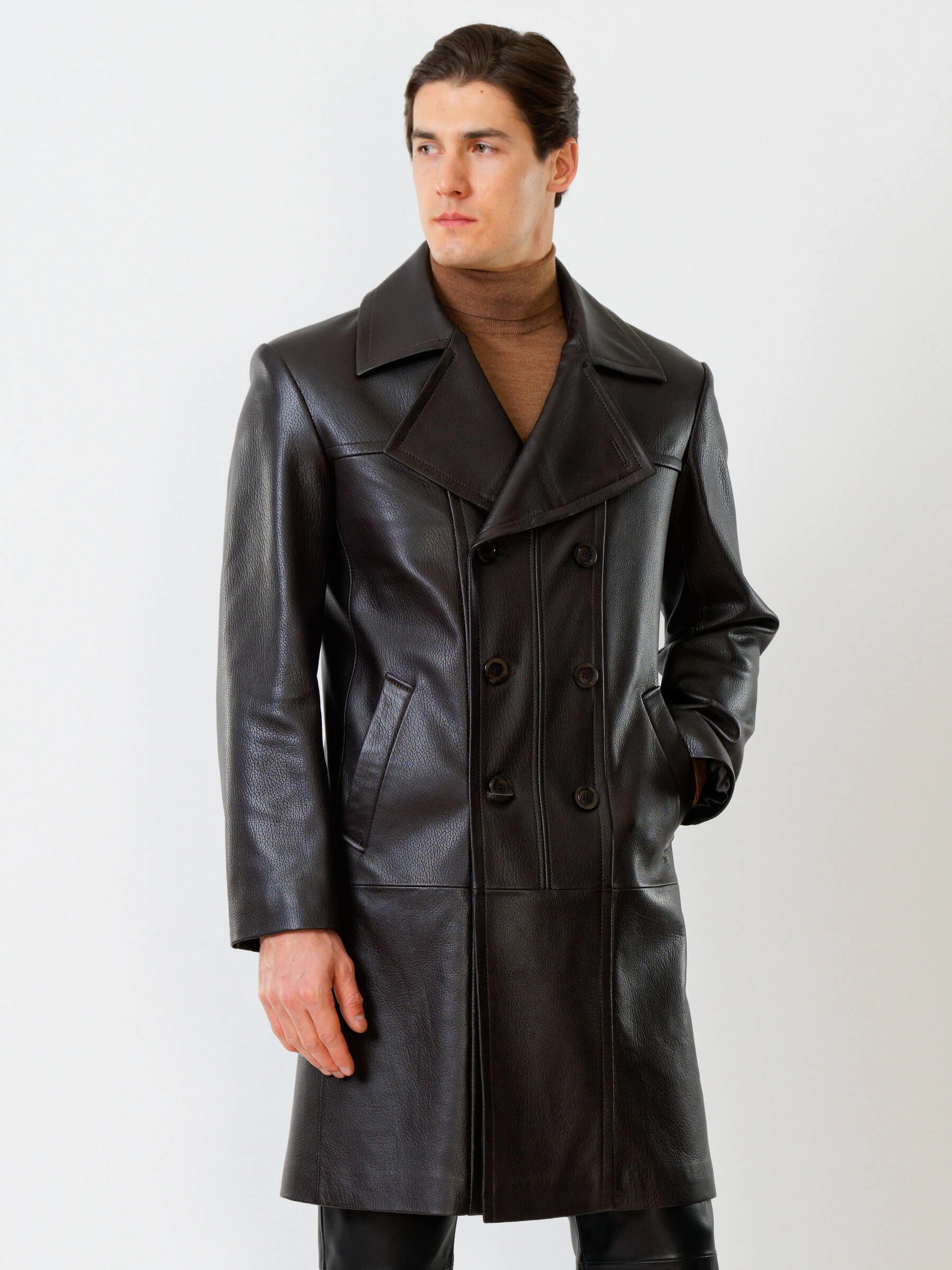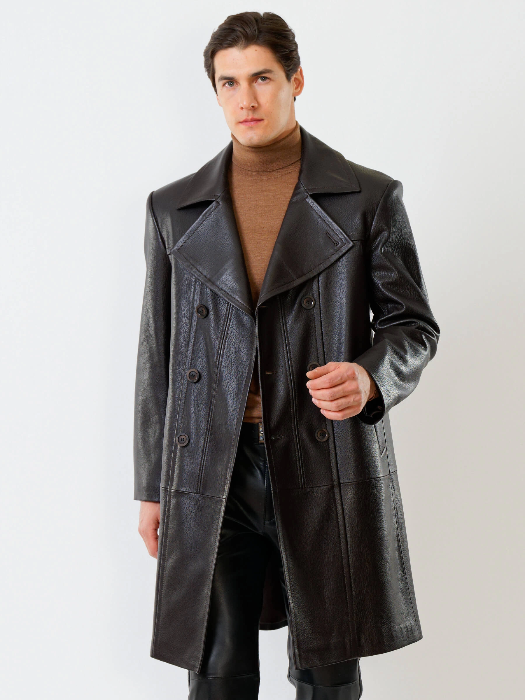 Двубортное кожаное пальто и кожаные брюки. Брутальный образ. Кожа премиального качества. Безупречная работа портных. Комфортная посадка по фигуре.
