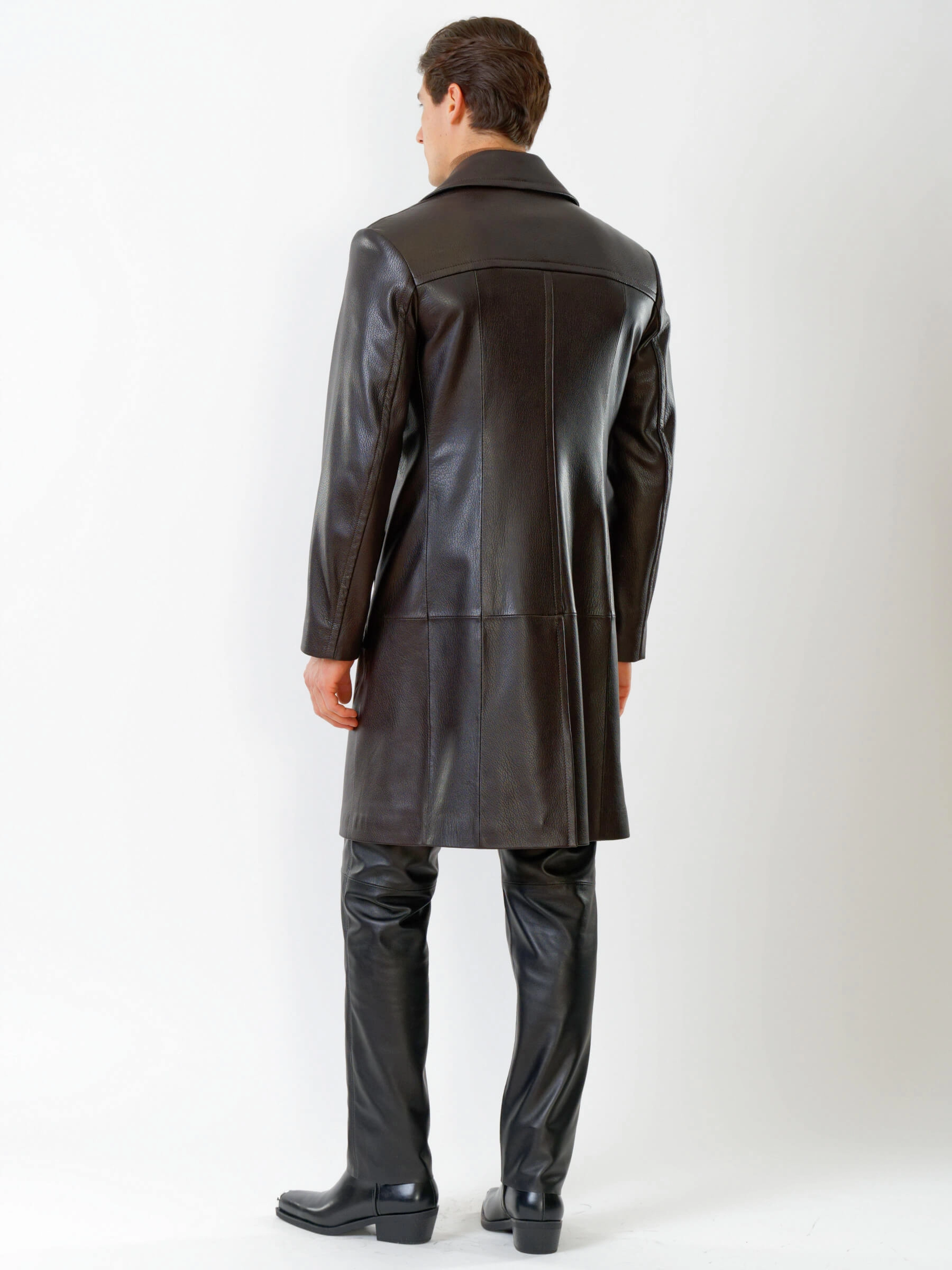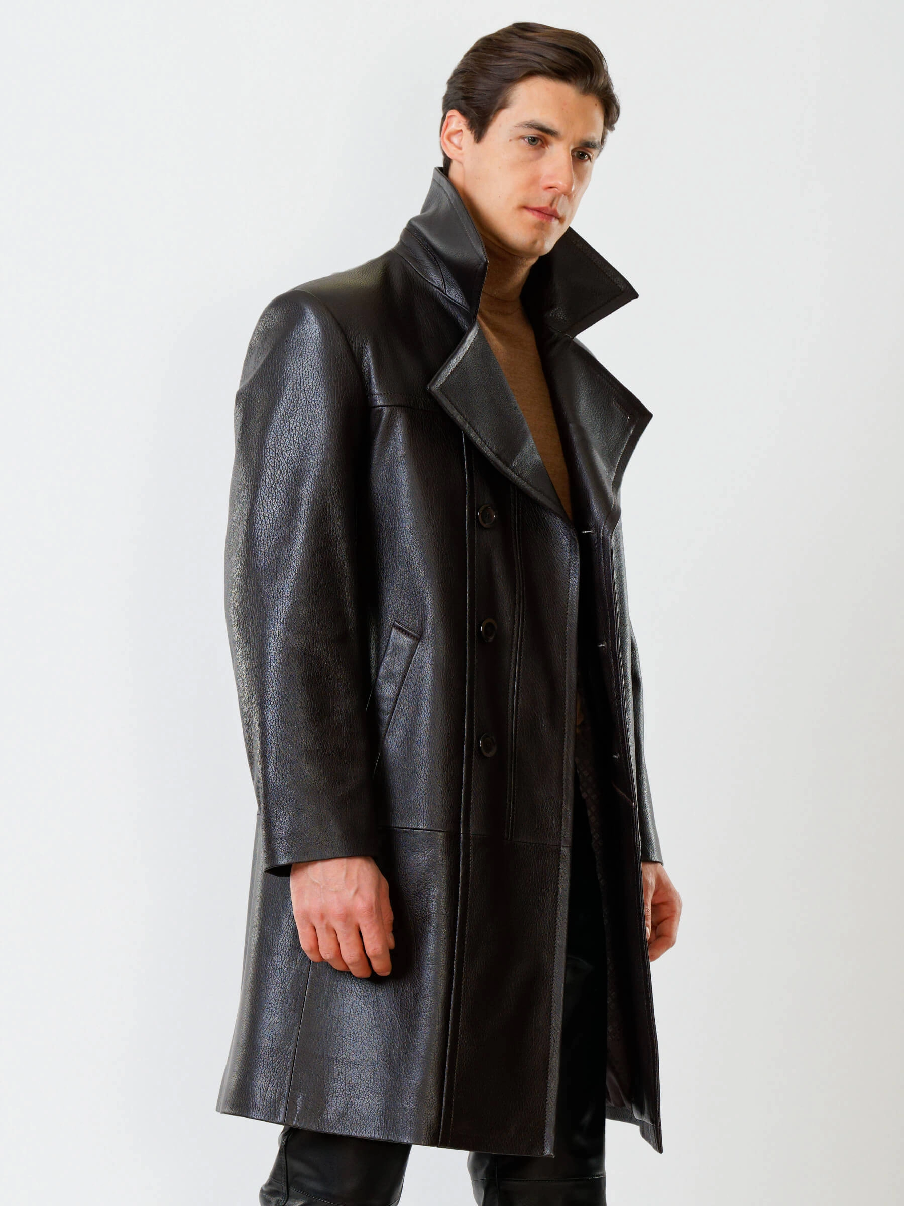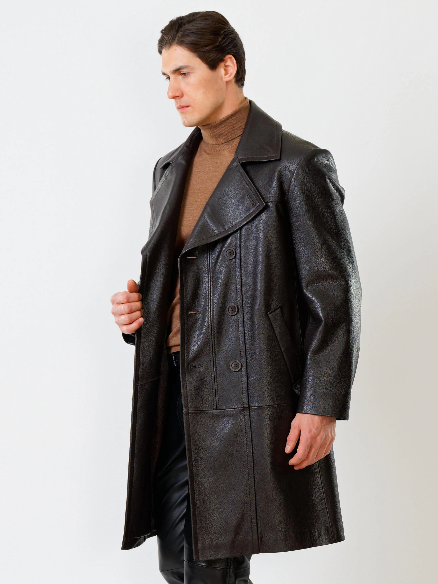 Двубортное кожаное пальто и кожаные брюки. Брутальный образ. Кожа премиального качества. Безупречная работа портных. Комфортная посадка по фигуре.