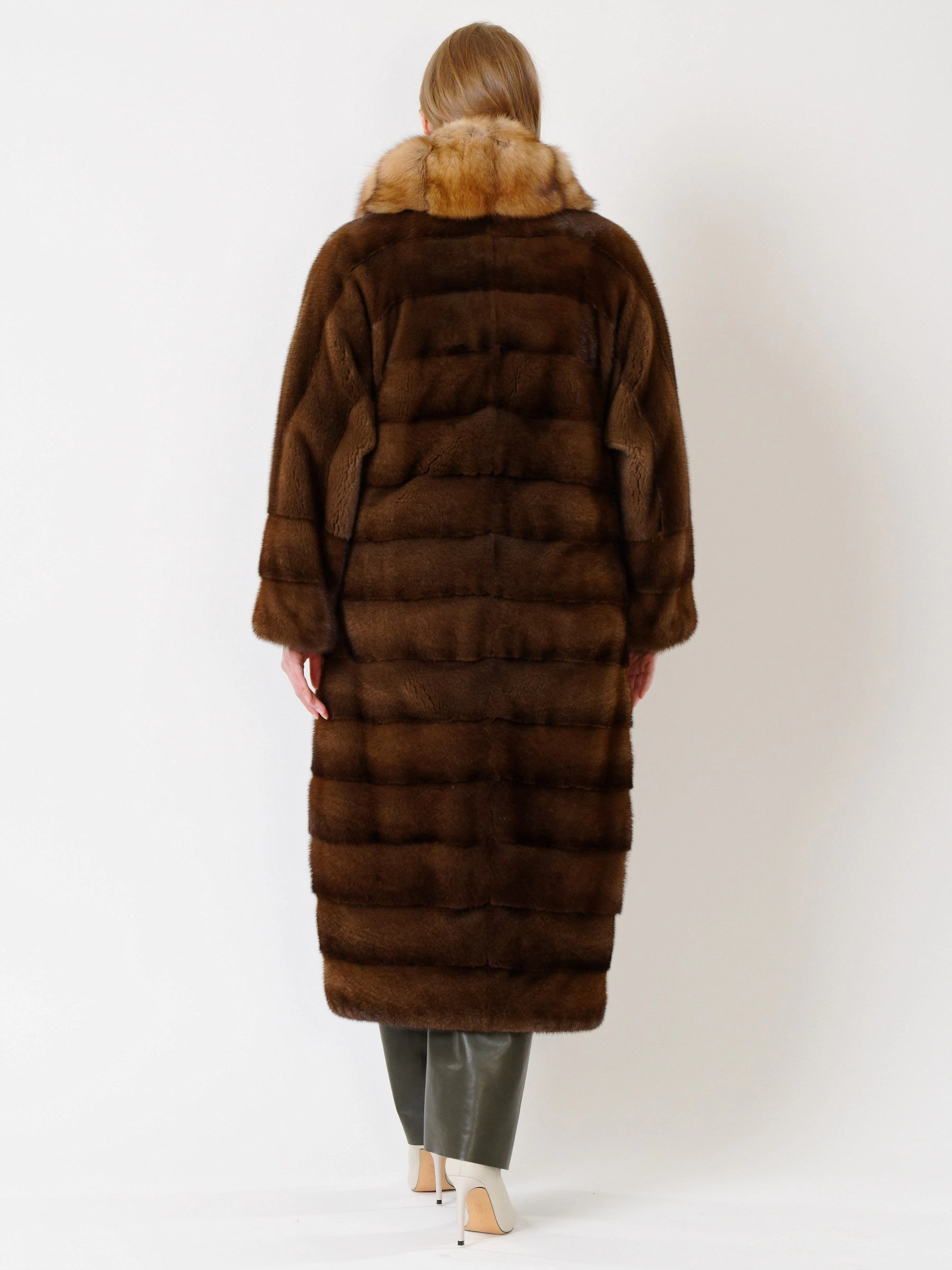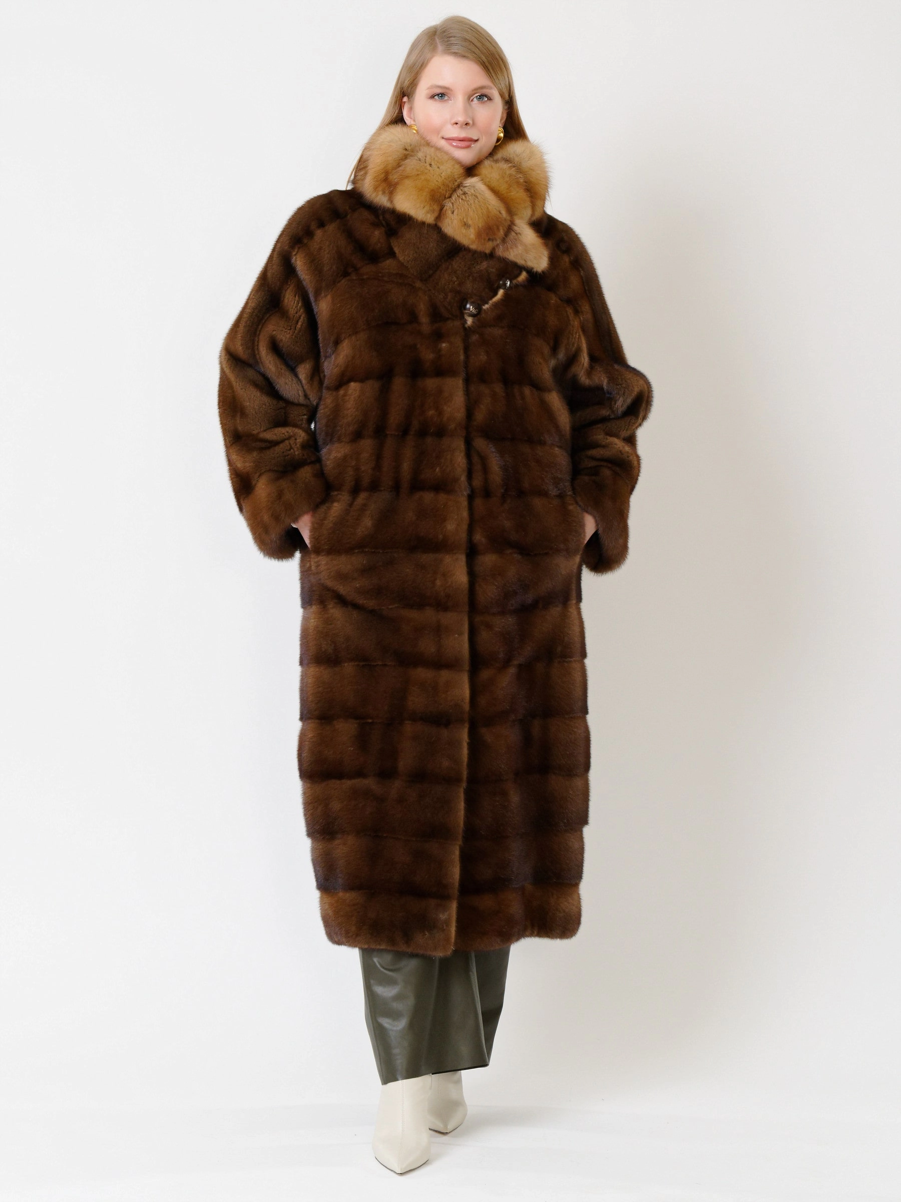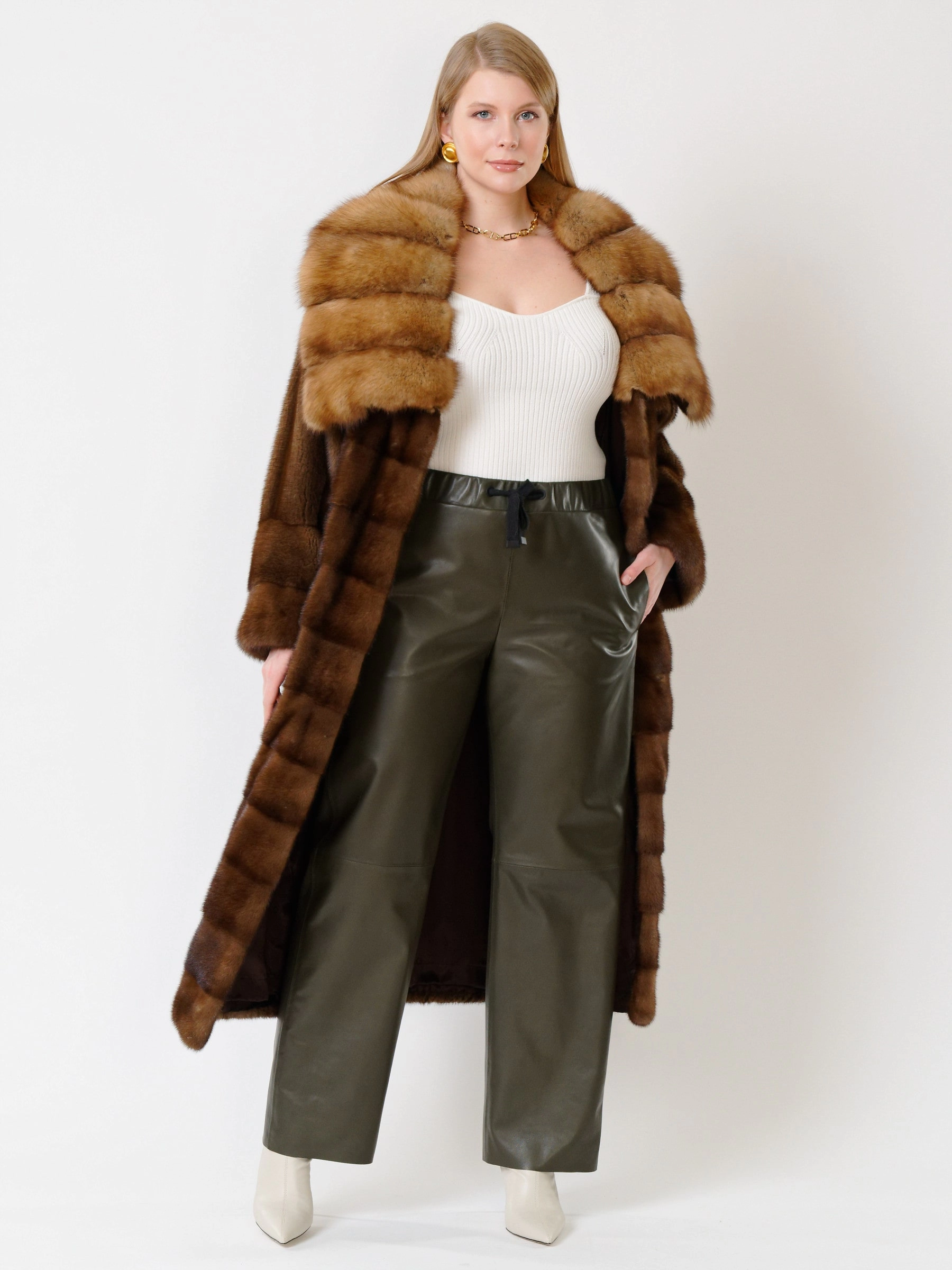 Эффектное пальто из меха норки датской селекции. Нежнейший мех, максимально густой, с коротким остевым волосом. Шикарный воротник-трансформер из меха соболя. Пальто получилось легким и теплым. Удачным сочетанием станут кожаные брюки свободного кроя премиум-класса.