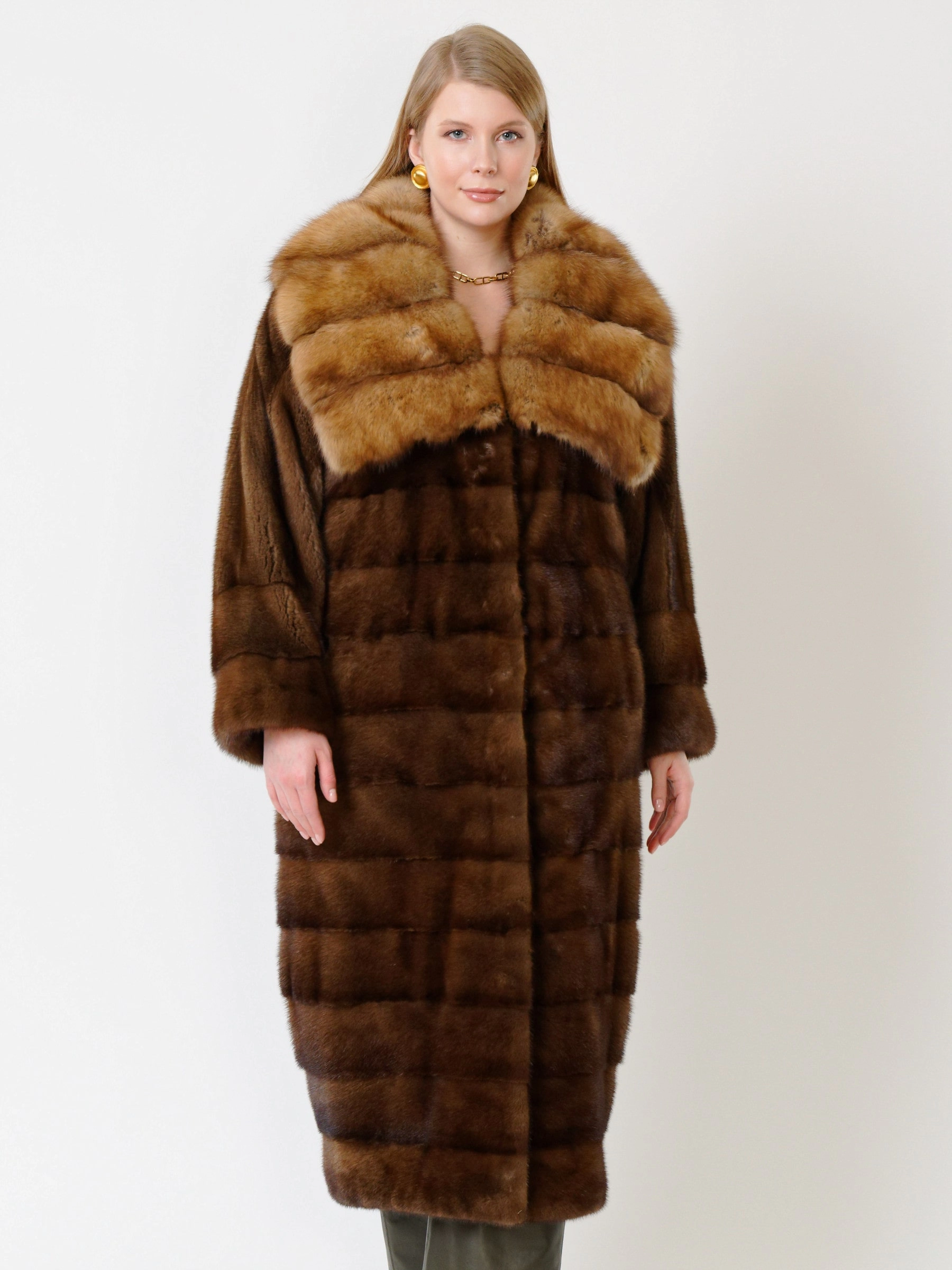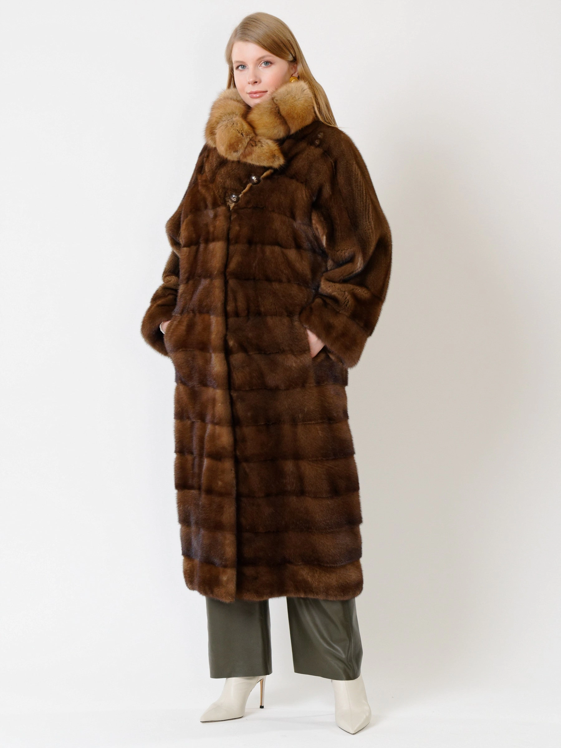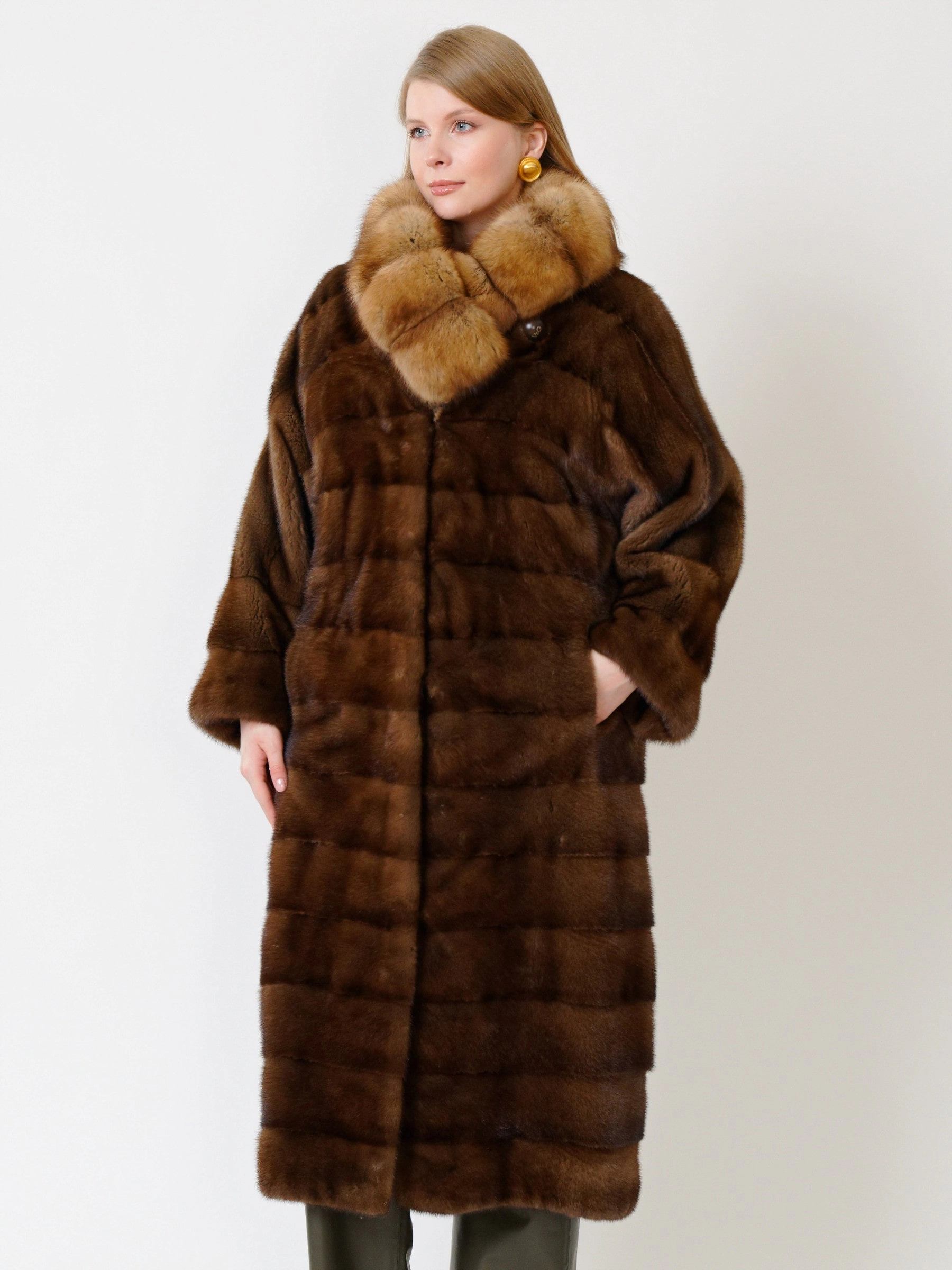 Эффектное пальто из меха норки датской селекции. Нежнейший мех, максимально густой, с коротким остевым волосом. Шикарный воротник-трансформер из меха соболя. Пальто получилось легким и теплым. Удачным сочетанием станут кожаные брюки свободного кроя премиум-класса.