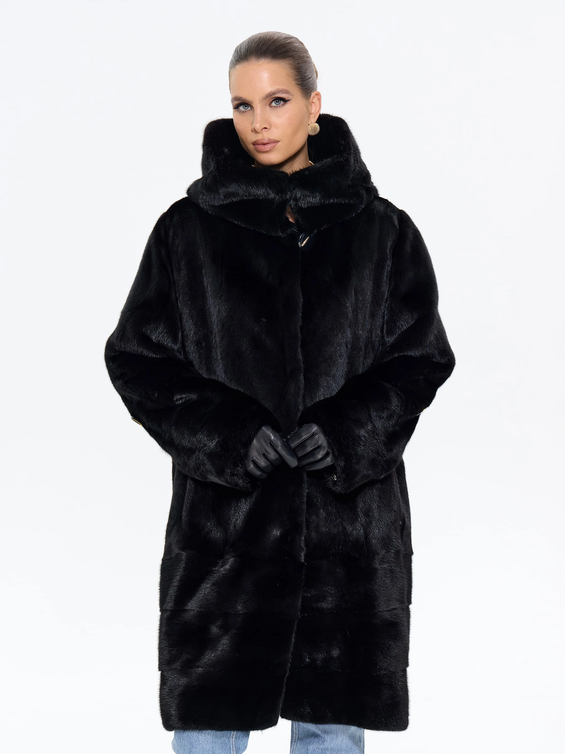 Роскошная шуба из черной норки премиум-класса с глубоким капюшоном и элегантным прямым силуэтом. Модель длиной 100 см отличается изысканной деталью — поперечной выкладкой меха по низу изделия, а также практичными втачными рукавами с регулируемой длиной. Стилисты рекомендуют носить эту утепленную шубу с джинсами, грубыми ботинками и объемным свитером для повседневного образа или с кожаными брюками и каблуками для вечернего выхода — ее универсальность и вневременная элегантность обеспечат вам безупречный вид в любую погоду.