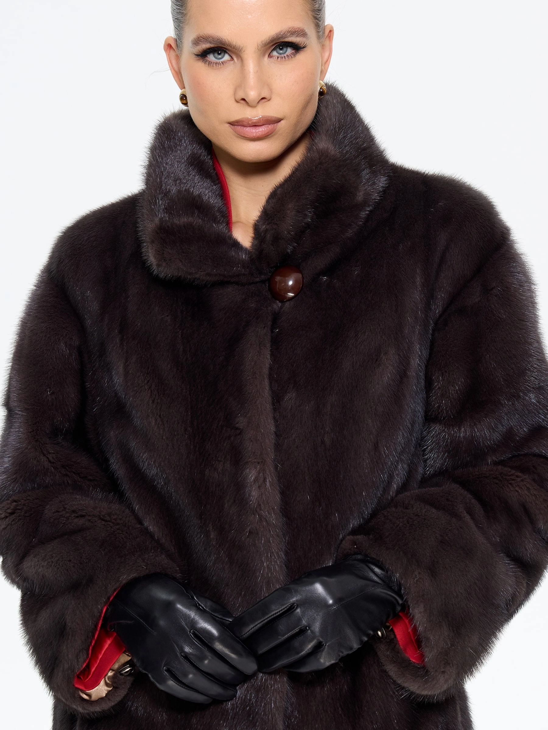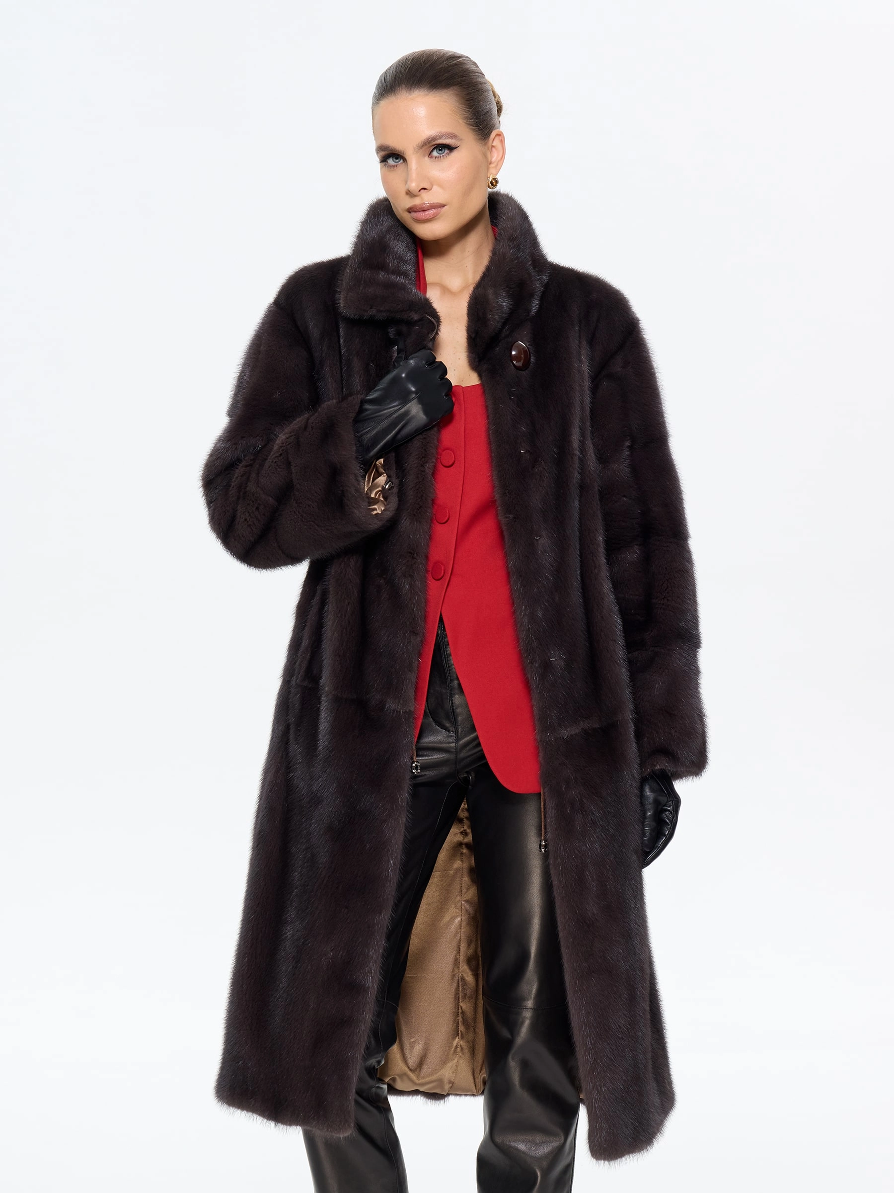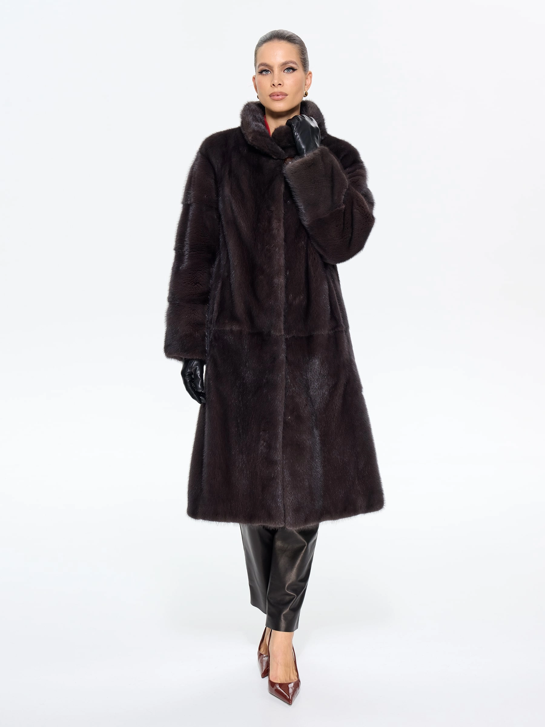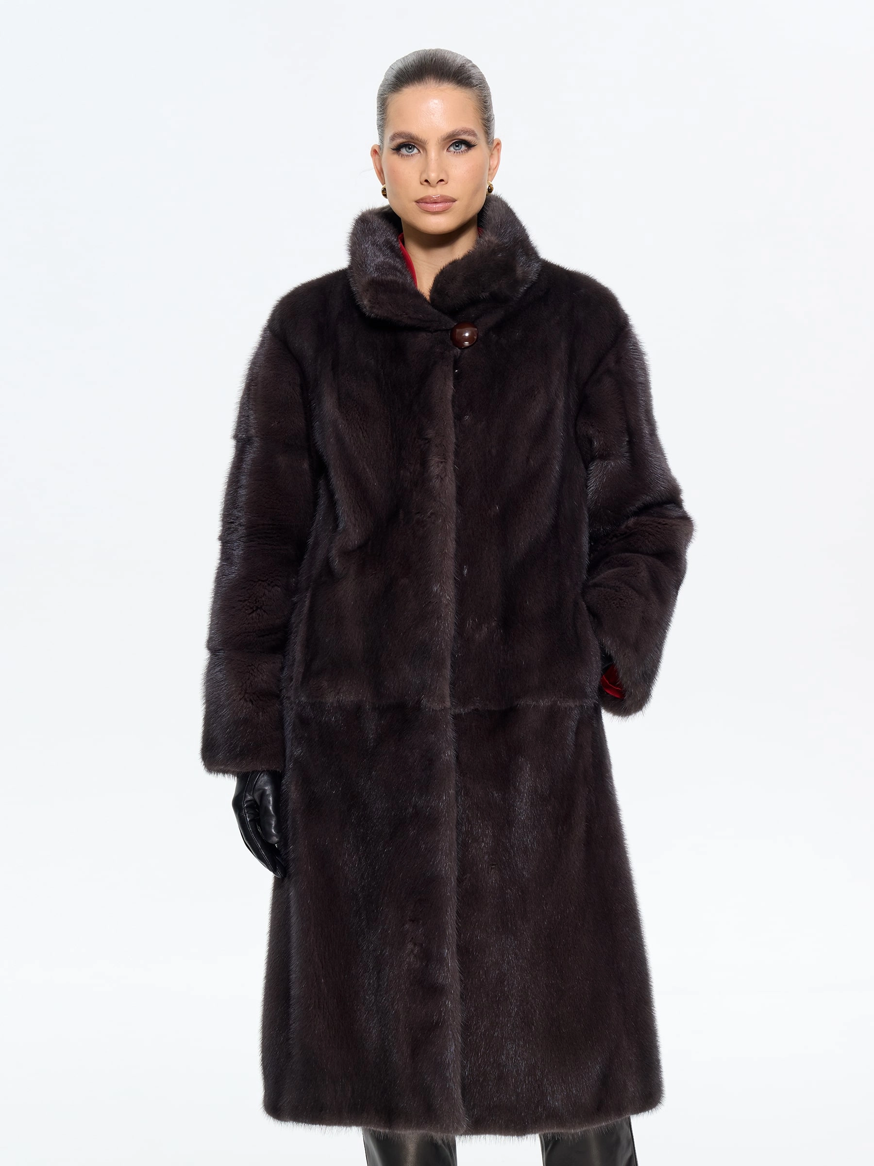 Длинная классическая шуба из меха норки премиум-класса с элегантным воротником-стойкой воплощает вневременную элегантность. Модель прямого силуэта длиной 110 см с втачными рукавами и застежкой-клипсой отличается особой деталью — поперечной раскладкой меха на рукавах, что подчеркивает роскошную текстуру меха. Практичность шубы обеспечена удобными врезными карманами и внутренней кулиской для регулировки силуэта. Стилисты рекомендуют сочетать эту модель с кожаными брюками и сапогами для дневного образа или с вечерним платьем для особых случаев — это универсальная инвестиция в ваш гардероб, где классика встречается с современной функциональностью.