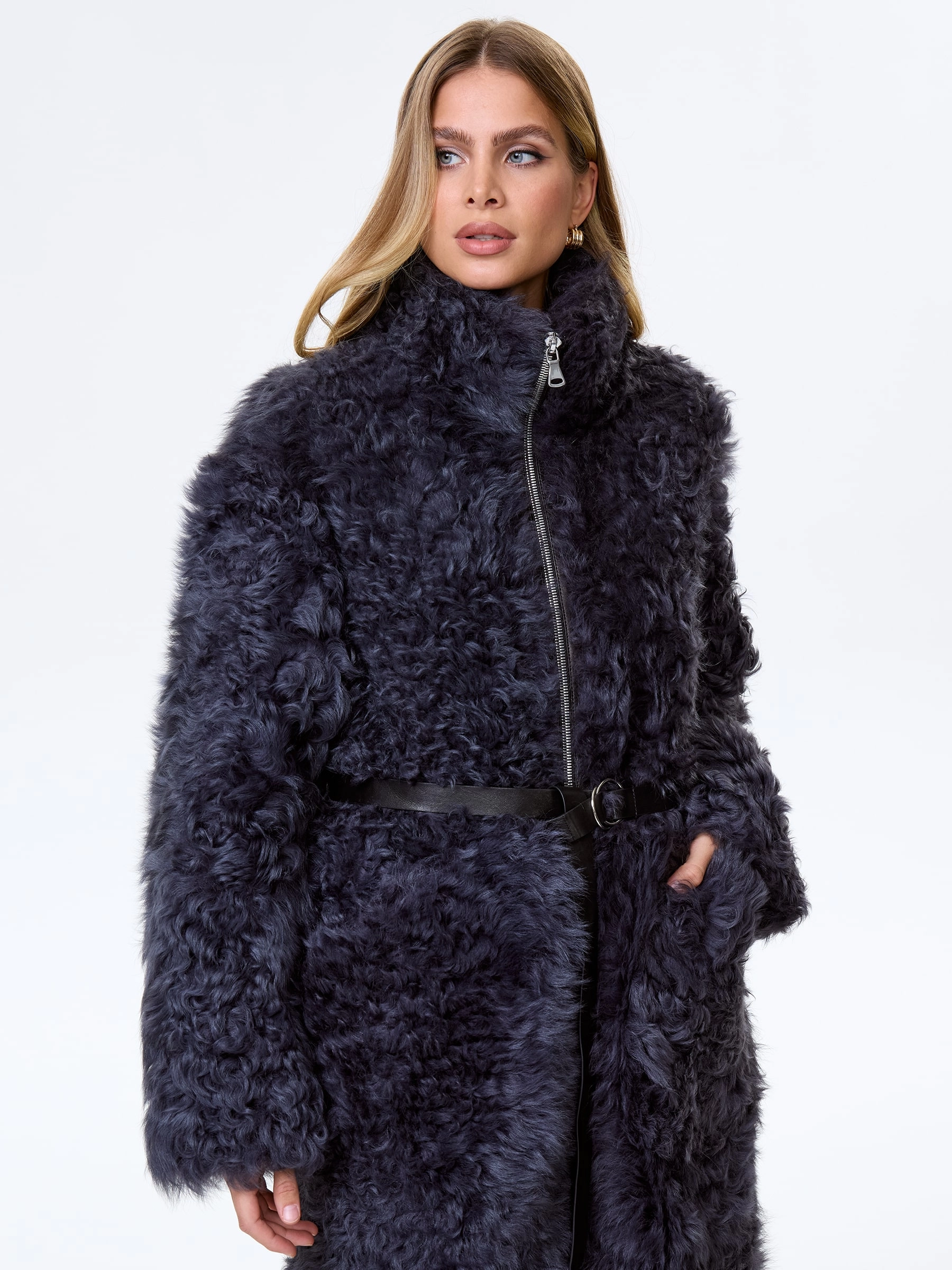 Дубленку с воротником -стойка выполнили из натуральной овчины калган снаружи и кожаной изнанкой. Свободный крой изделия дополнили боковыми карманами и поясом. Застежка-молния.