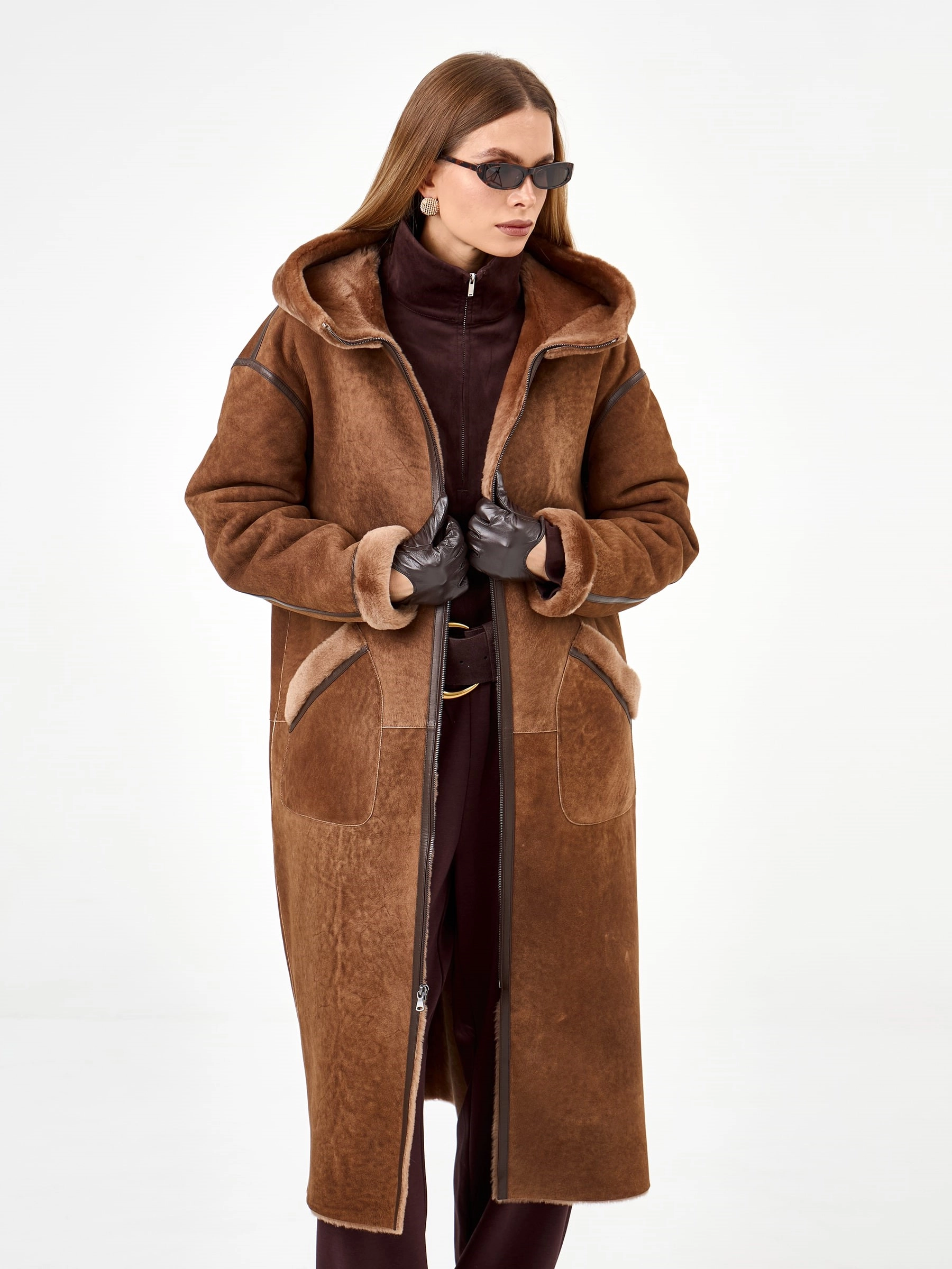 Длинная дубленка с капюшоном из элитной овчины мерино. Модель свободного кроя длиной 115 см с несъемным капюшоном и спущенным рукавом создает элегантный повседневный образ. Дополнена длинным поясом для регулирования силуэта, меховой опушкой капюшона и стильными кожаными кантами. Стилисты рекомендуют носить с объемными свитерами, удлиненными платьями и высокими сапогами — такой ансамбль подчеркнет вашу элегантность и подарит ощущение комфорта в холодные дни. Идеальное сочетание роскоши, тепла и непревзойденного стиля.