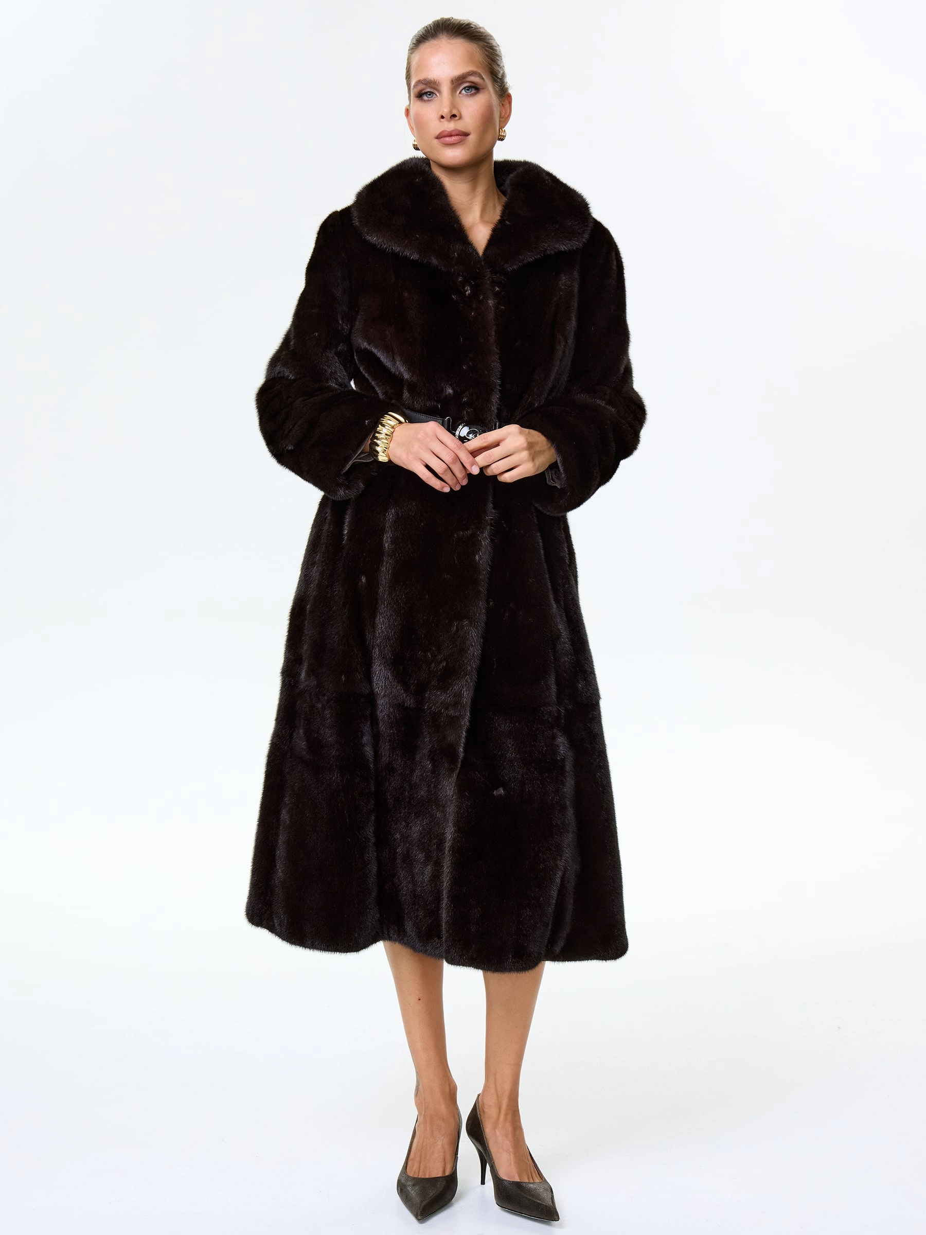 Товар длинная женская норковая шуба премиум класса белла(в), черная, размер 52, артикул 34050 выполнен из норка с застежкой клипсы. Рассчитан на сезон: зима. Длина изделия 120 см, силуэт полуприлегающий.