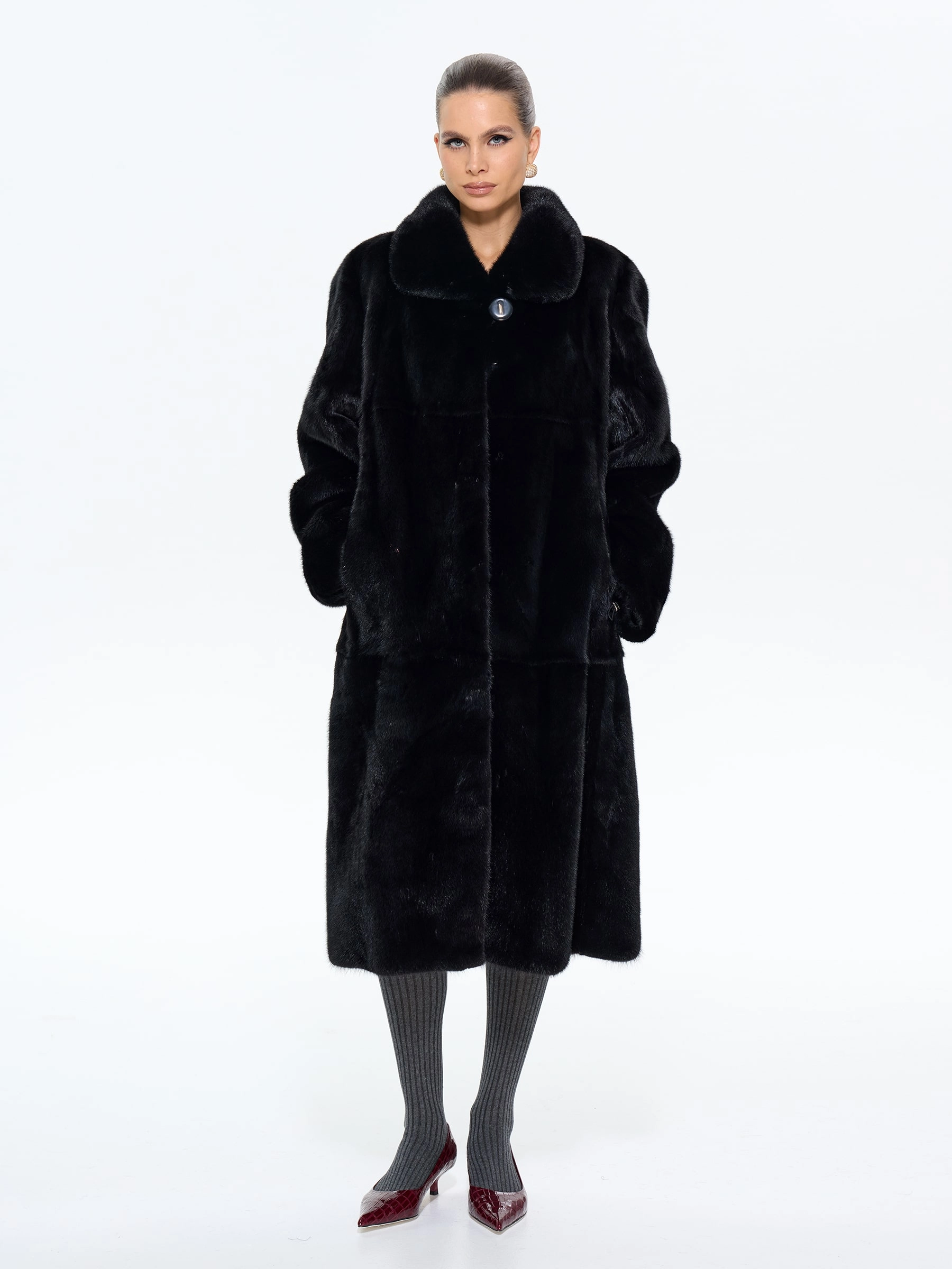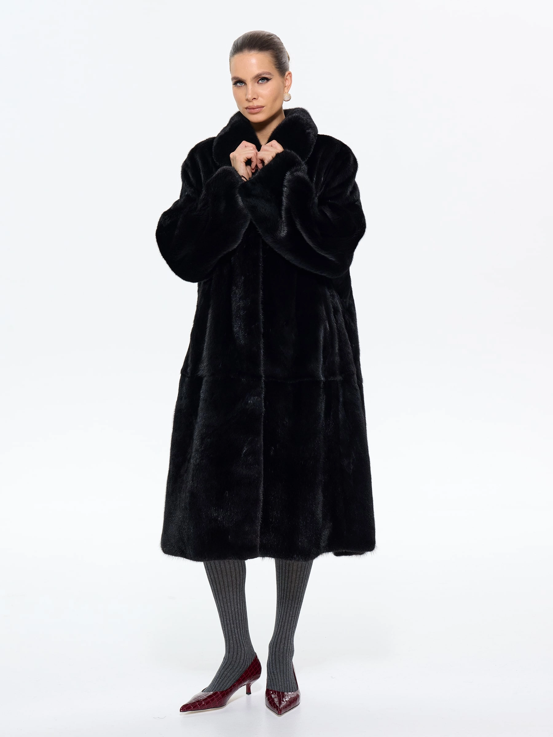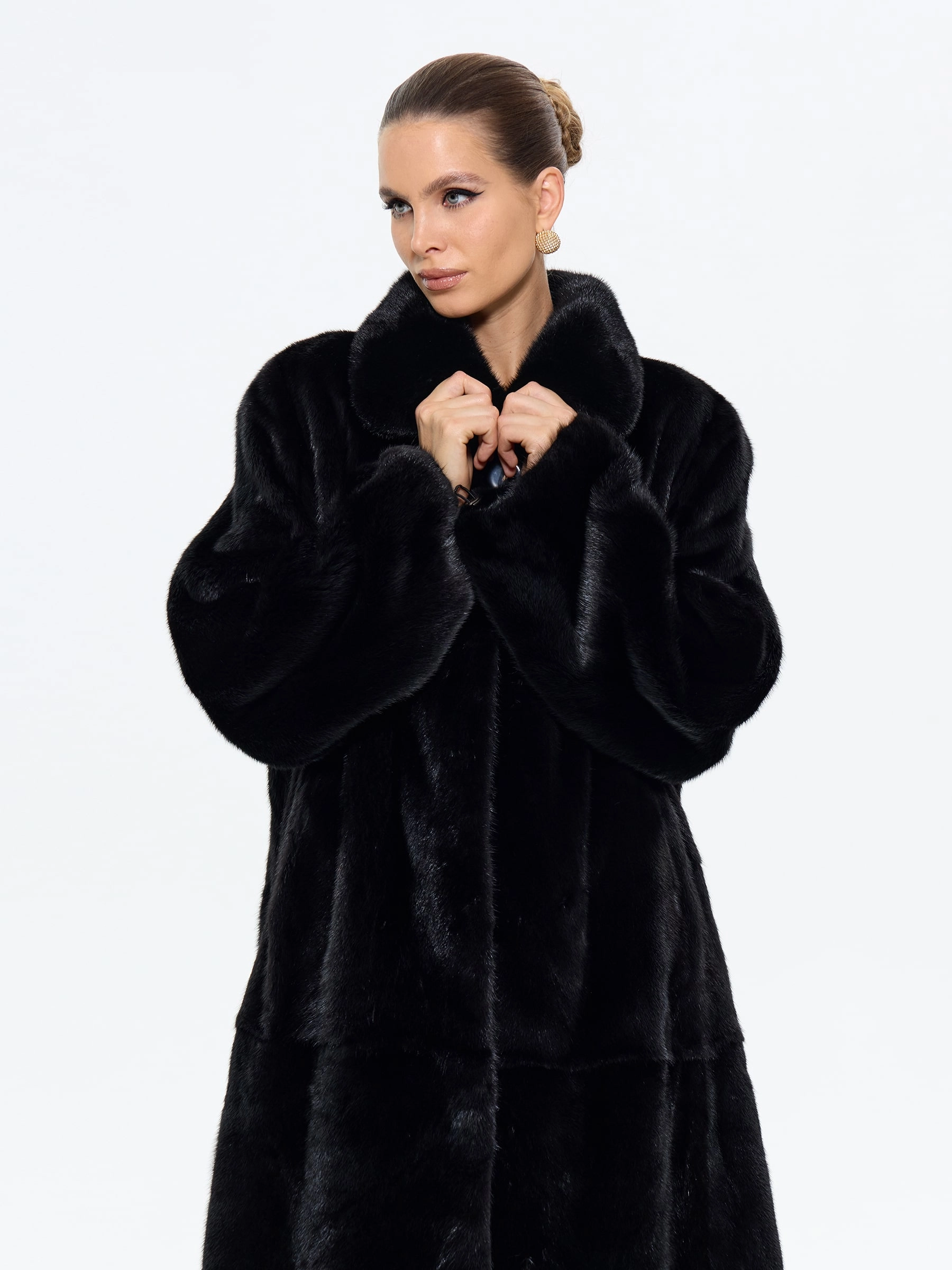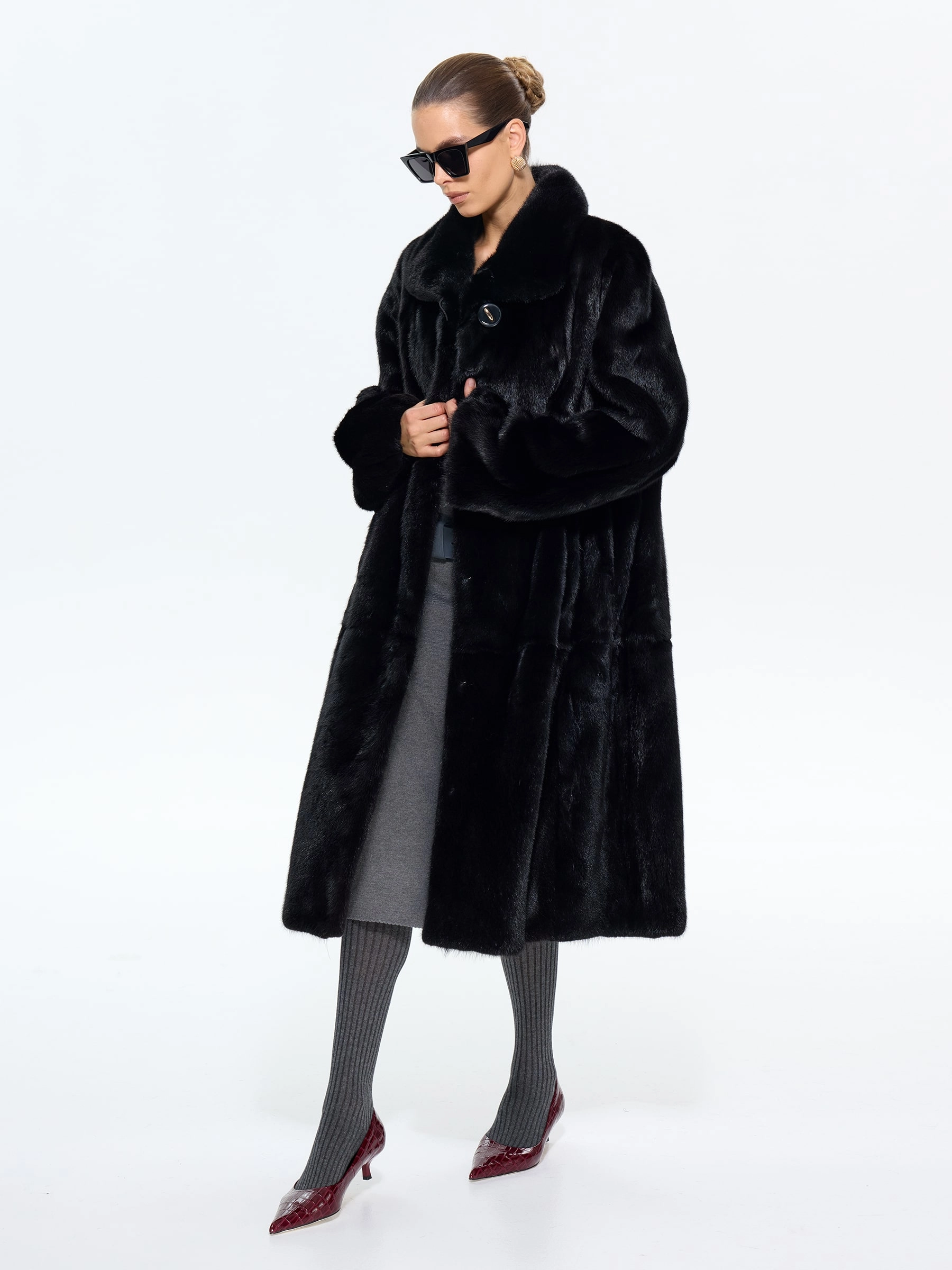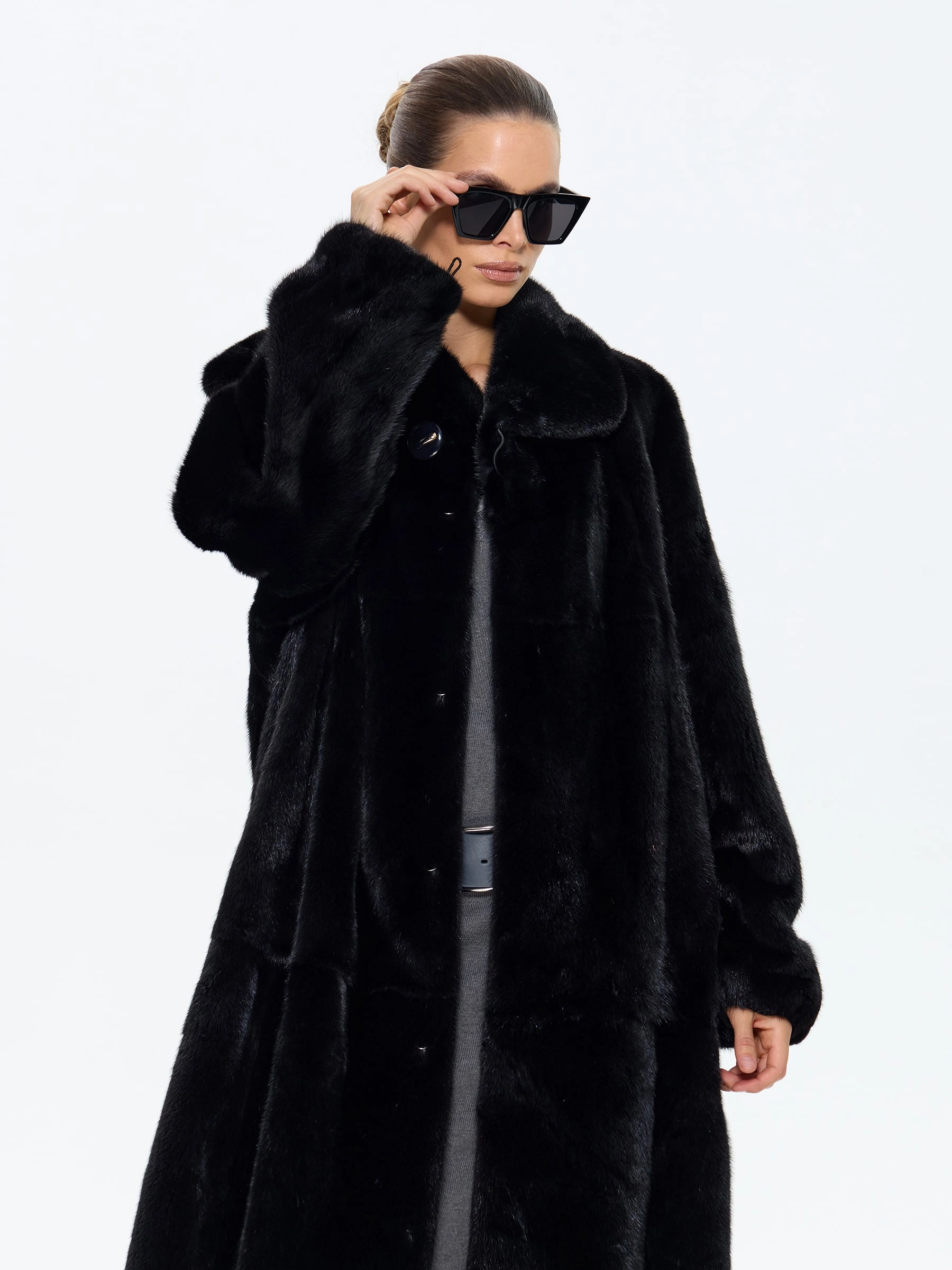 Черная норка. Силуэт «трапеция». Длина 110 см. Эта шуба — олицетворение чистой элегантности. Ее плавные, расширяющиеся книзу линии дарят фигуре изящество и скрывают все, что нужно, а глубокий черный цвет заставляет мех сиять по-особенному. Мягкий воротник «апаш» и удобные клипсы делают ее не только роскошной, но и невероятно комфортной для повседневной носки. Главный аксессуар: пусть это будет ваша шуба. Дополните образ минималистичными украшениями и качественной кожаной сумкой, чтобы не перегружать лук. Позвольте черной норке говорить за вас. Шепотом, который слышен издалека.