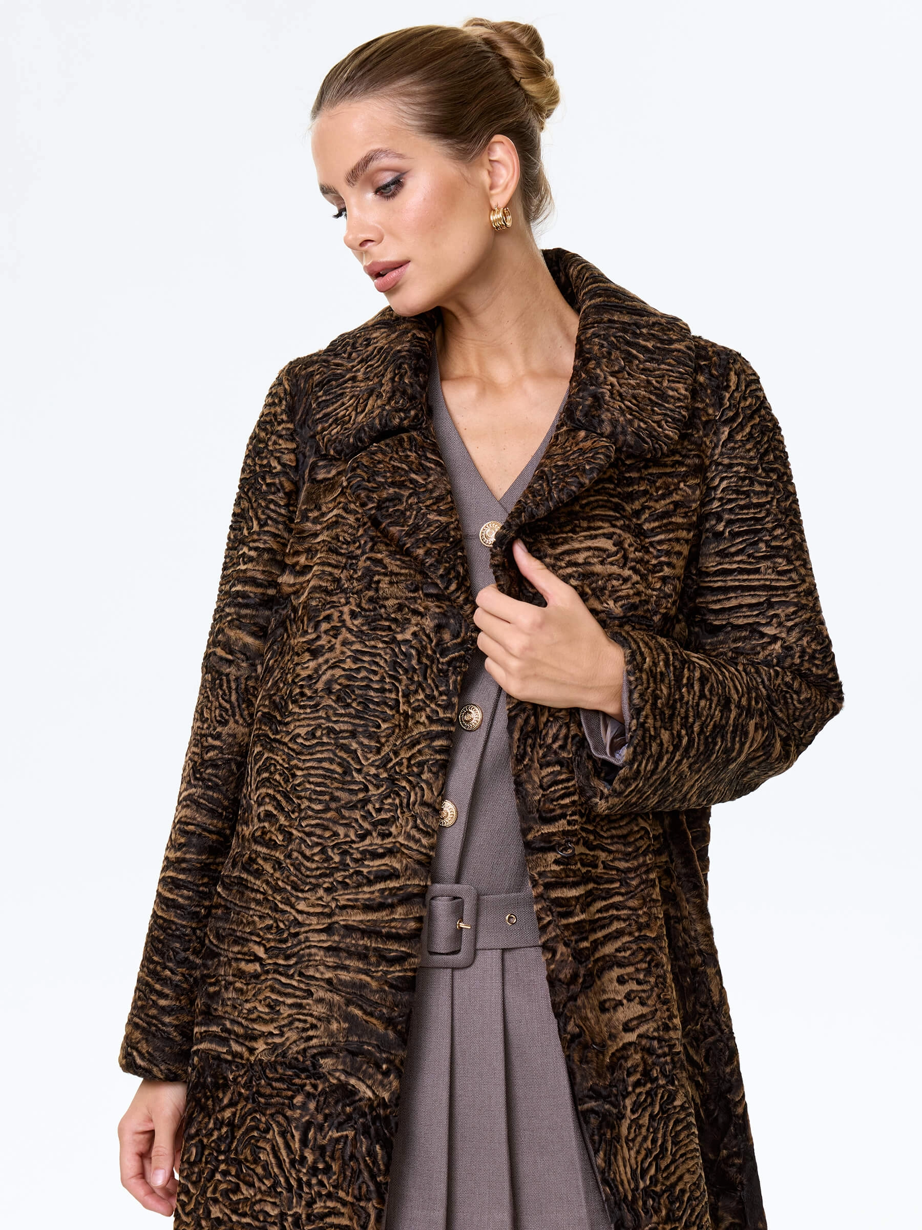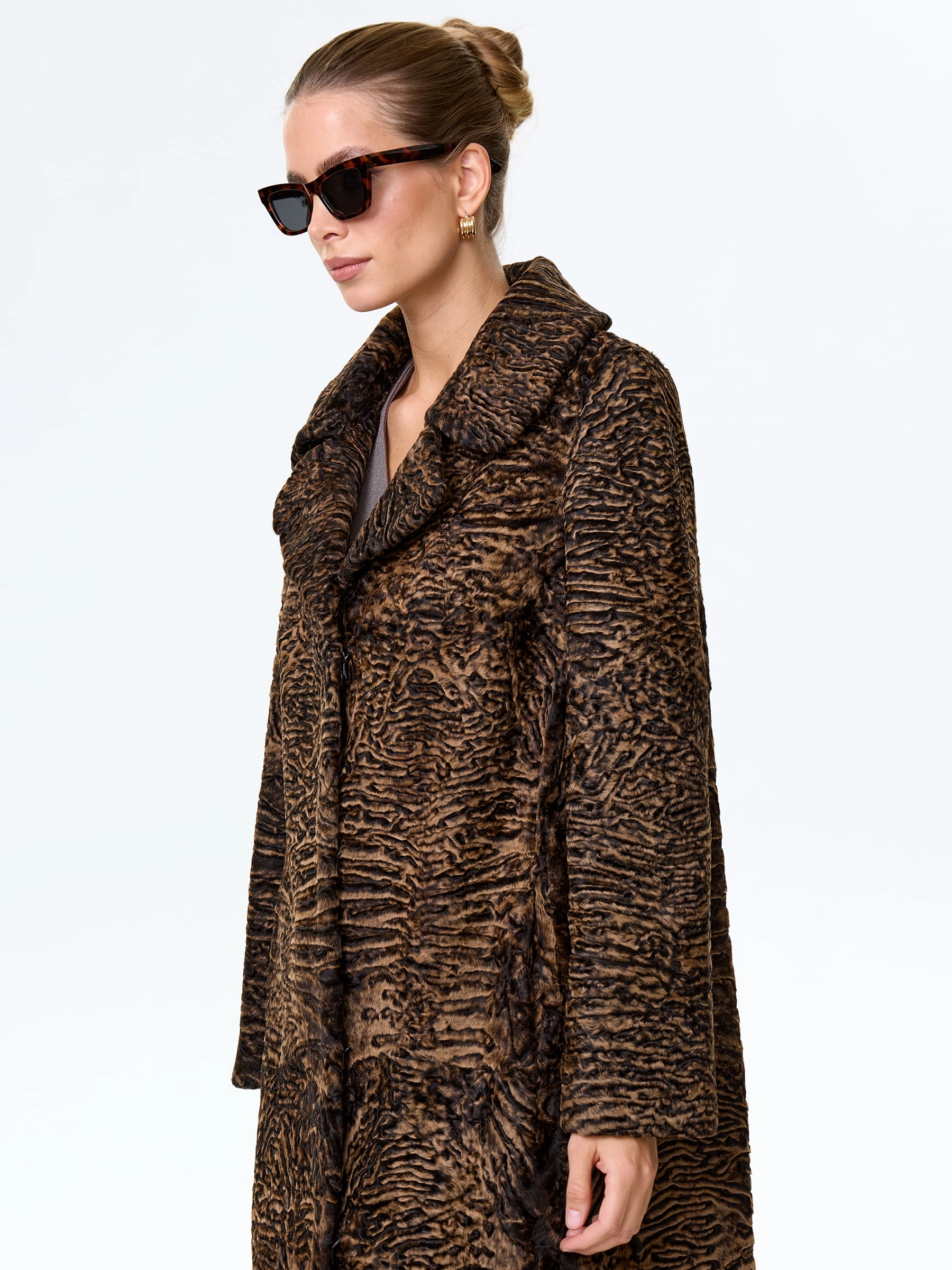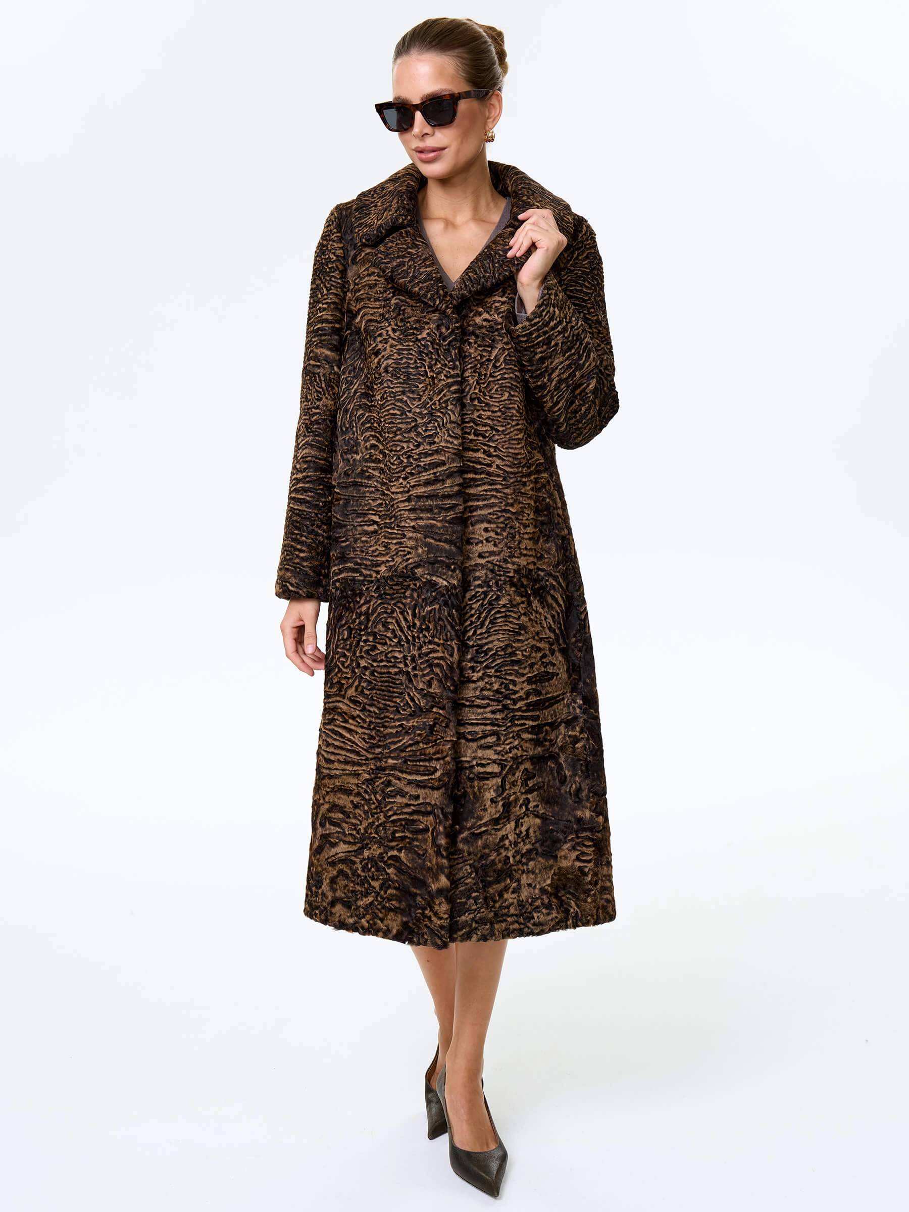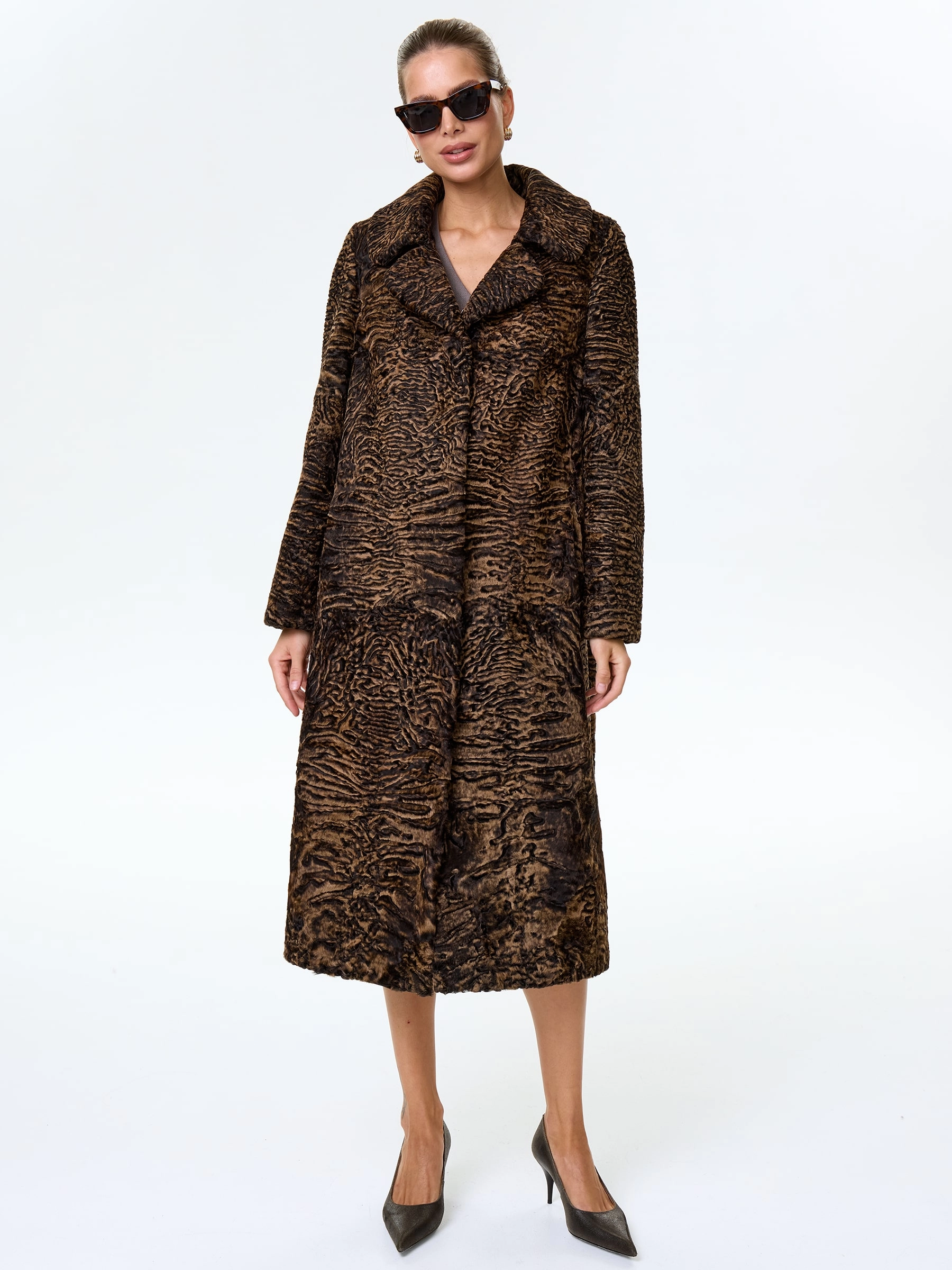Длинное пальто из афганской каракульчи в благородном натуральном цвете. Английский воротник. Идеальный подбор шкурок по оттенку и структуре. Аккуратная работа портных. Премиальное качество меха и комфортная посадка по фигуре.