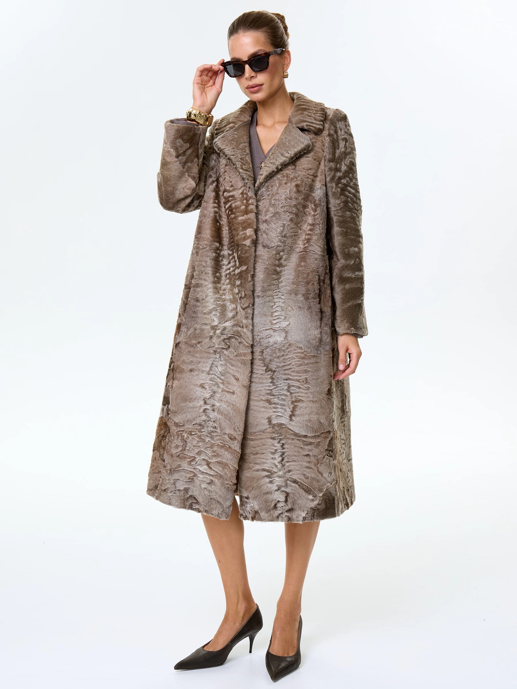 Длинное пальто из афганской каракульчи в благородном натуральном цвете. Английский воротник. Идеальный подбор шкурок по оттенку и структуре. Аккуратная работа портных. Премиальное качество меха и комфортная посадка по фигуре.