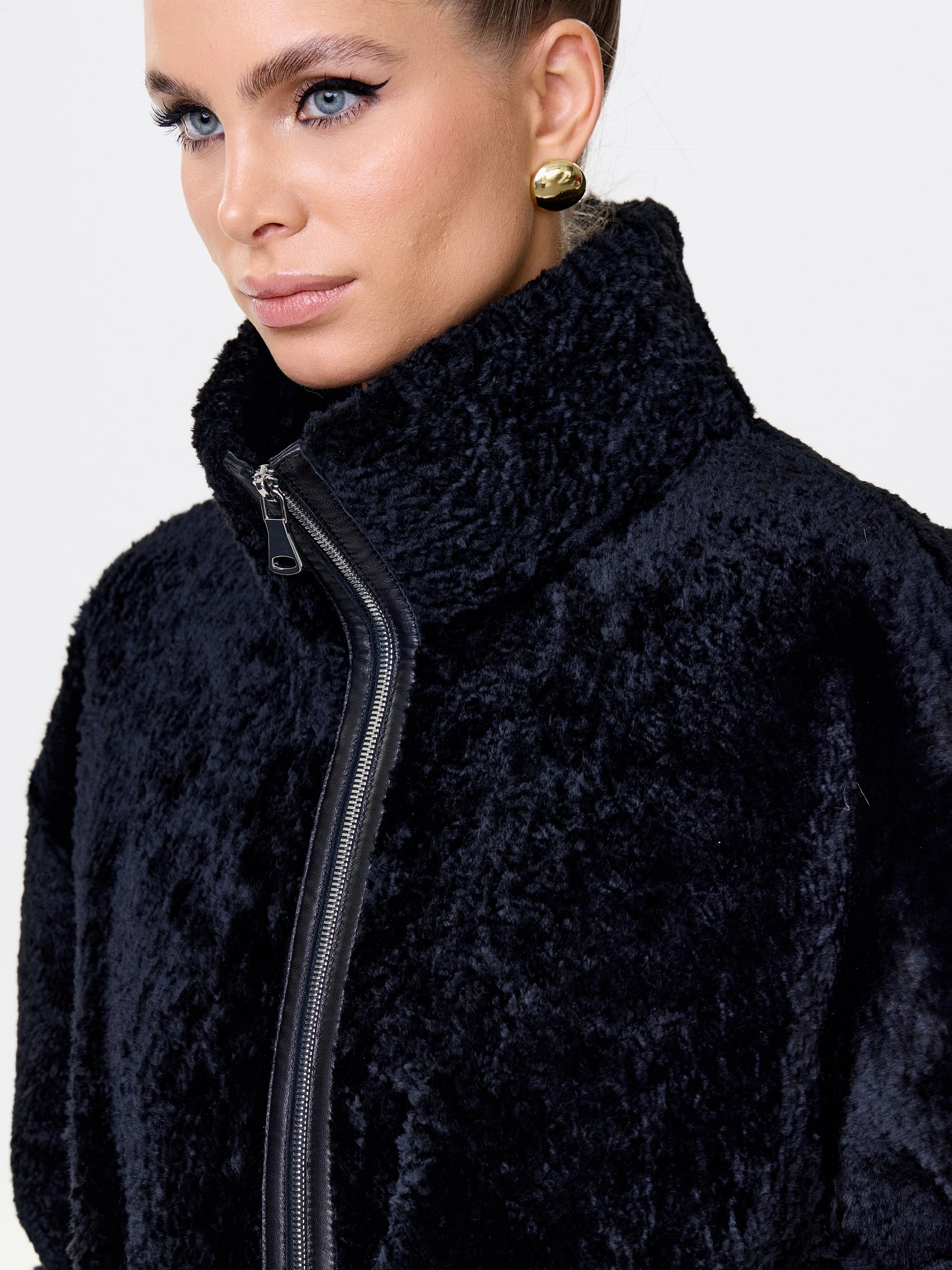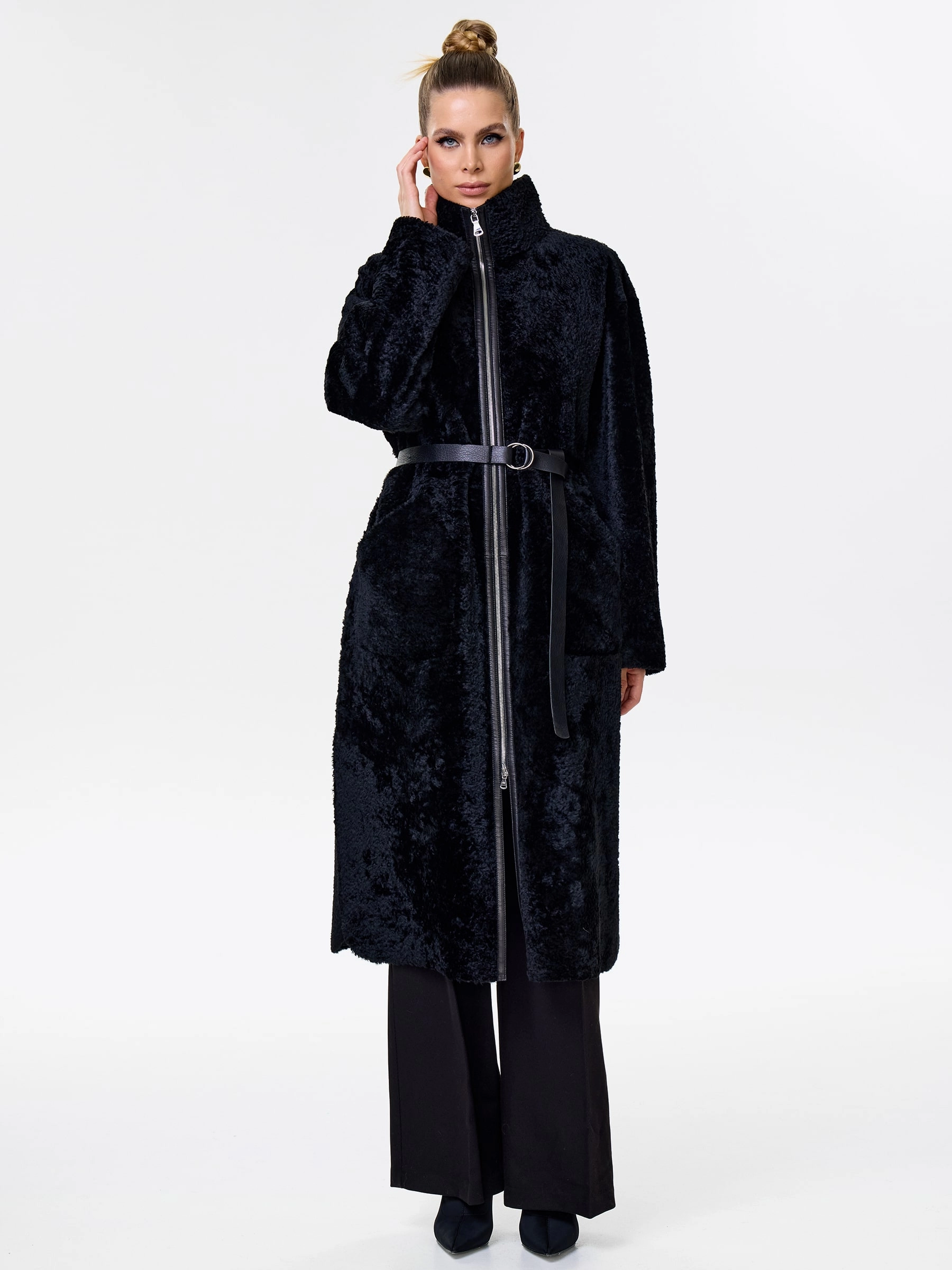 Товар длинное женское пальто из натуральной овчины астрагана премиум класса 2060, черное, размер 46, артикул 64320 выполнен из овчина "мерино" с застежкой молния. Рассчитан на сезон: осень-зима. Длина изделия 117 см, силуэт прямой.