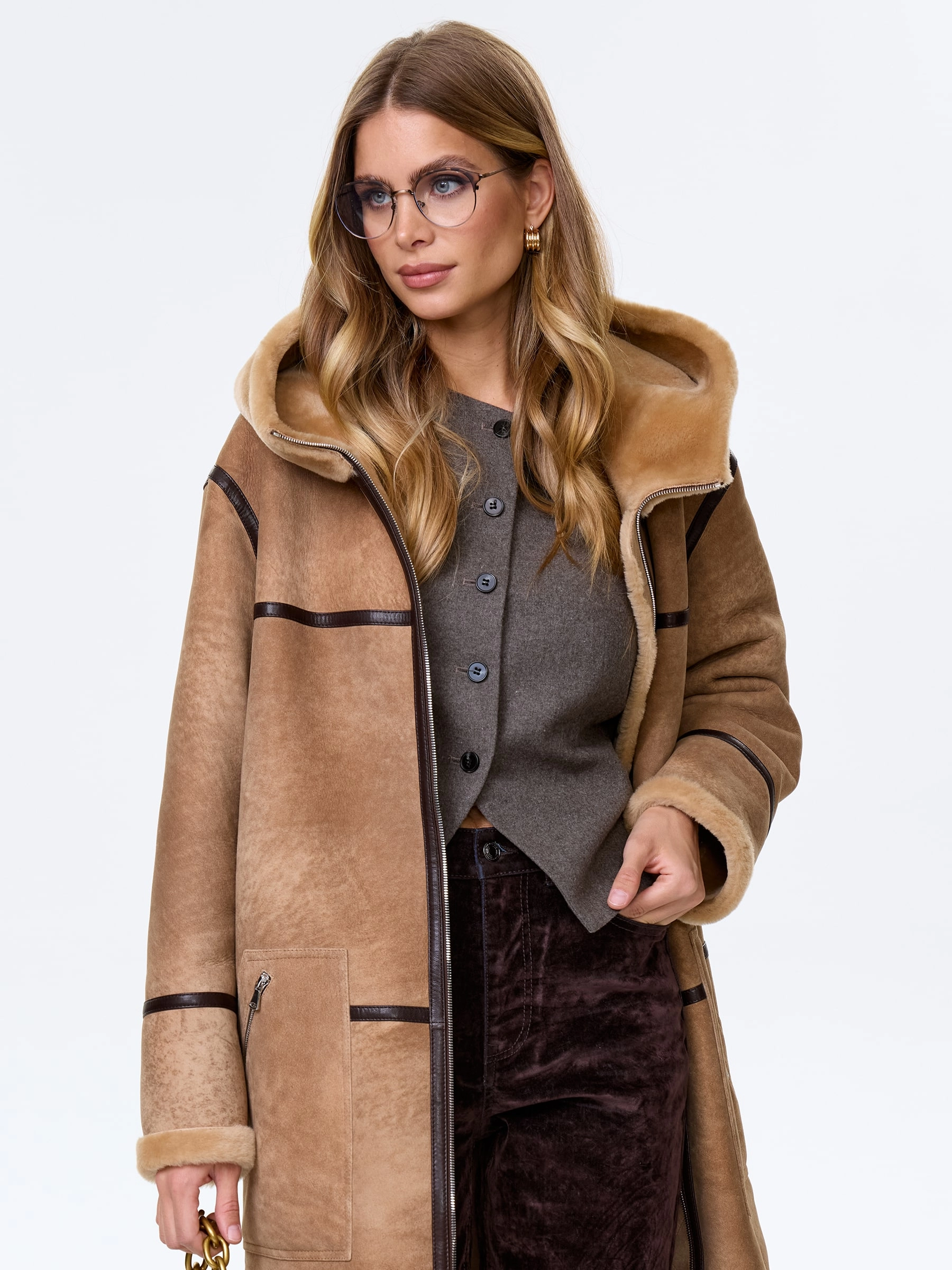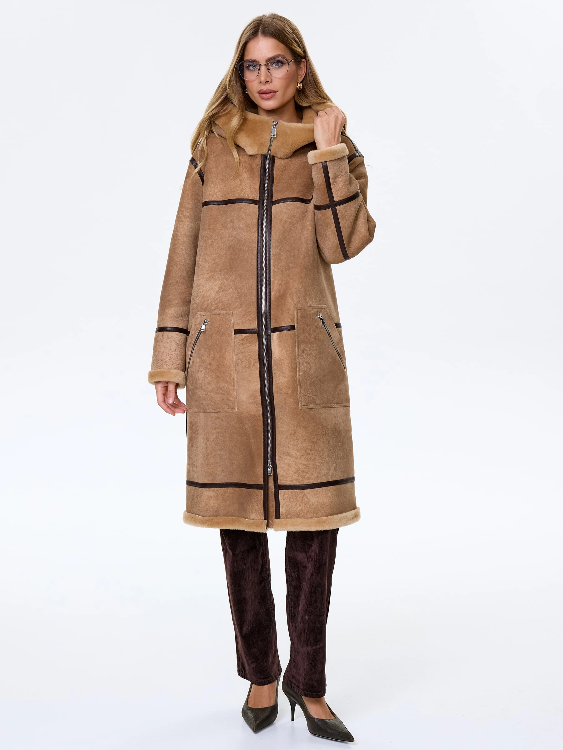 Длинное женское пальто с капюшоном из натуральной овчины премиум класса 2061, светло-коричневое, размер 44, артикул 64440