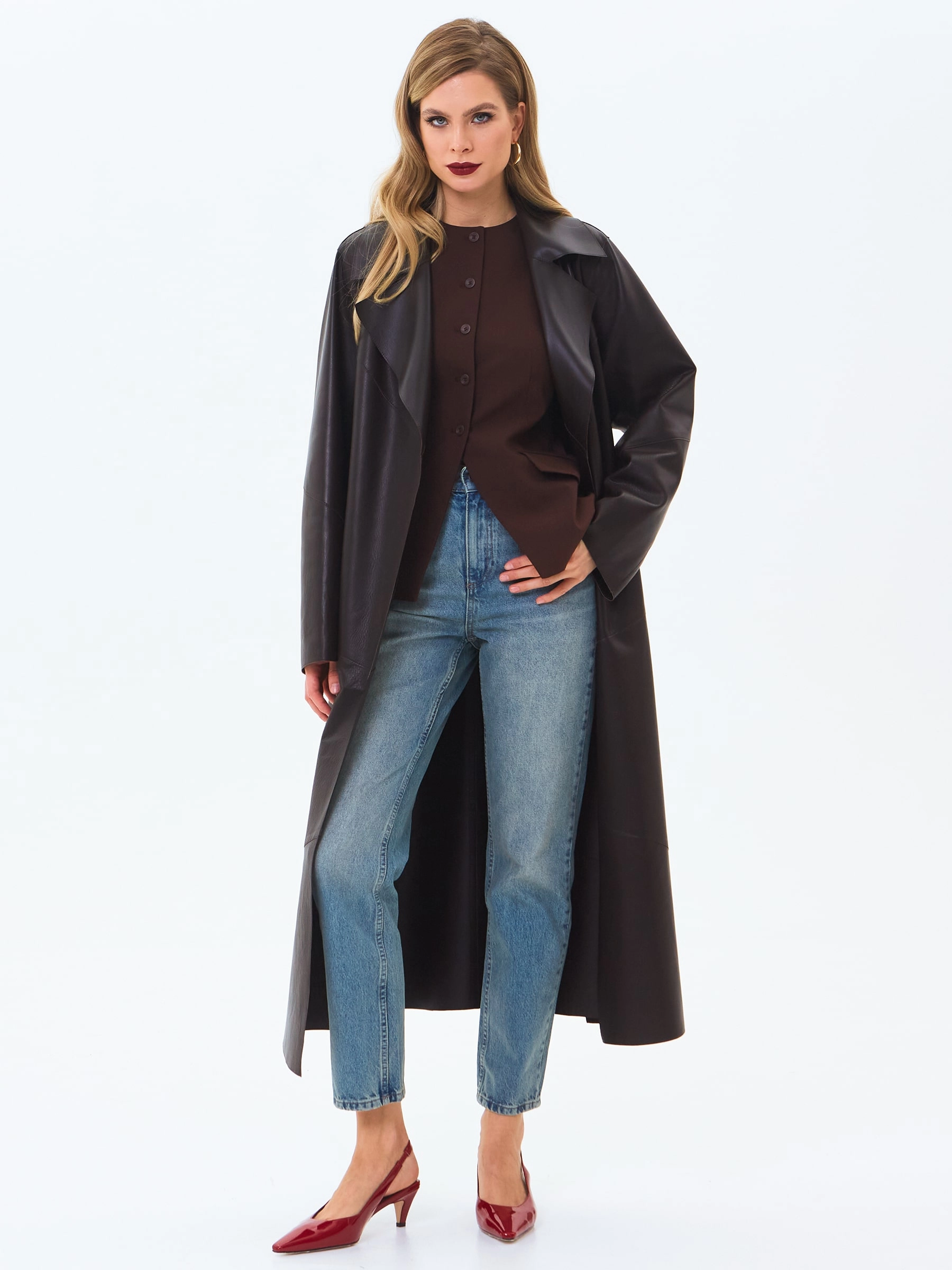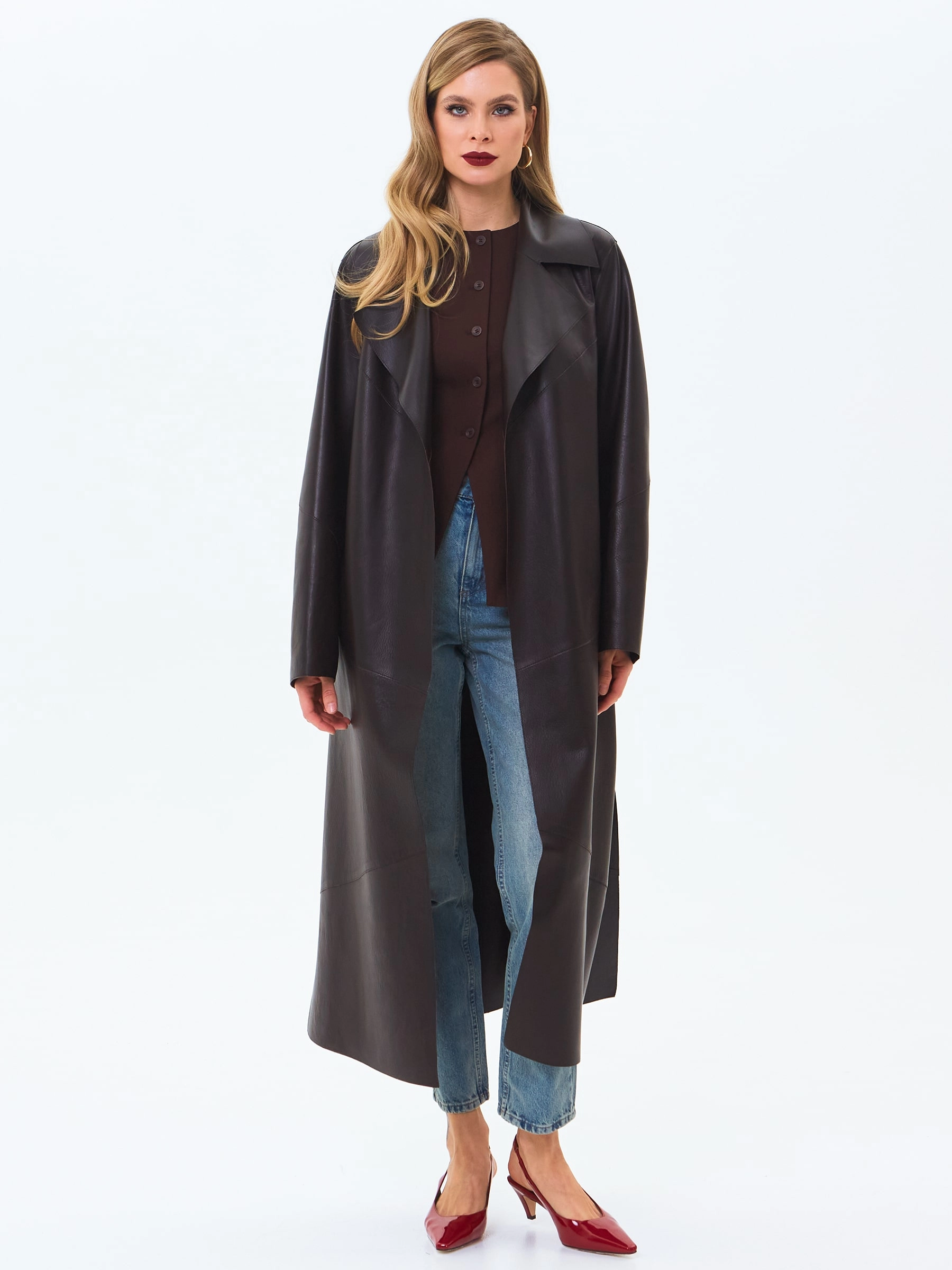 Товар длинный женский кожаный плащ премиум класса 3081, коричневый, размер 50, артикул 24660 выполнен из натуральной кожи с застежкой без застежки. Рассчитан на сезон: весна-лето. Длина изделия 125 см, силуэт прямой.