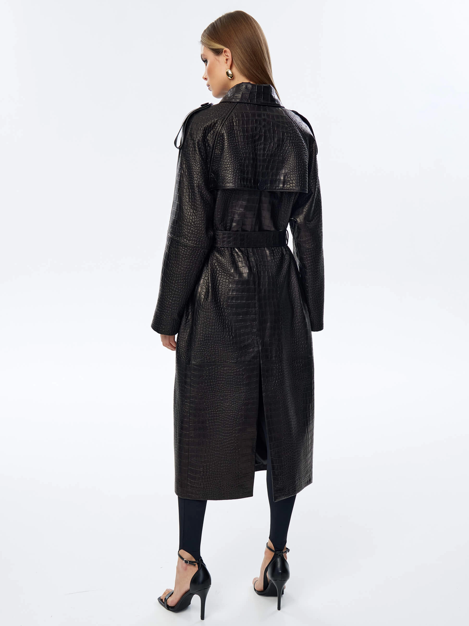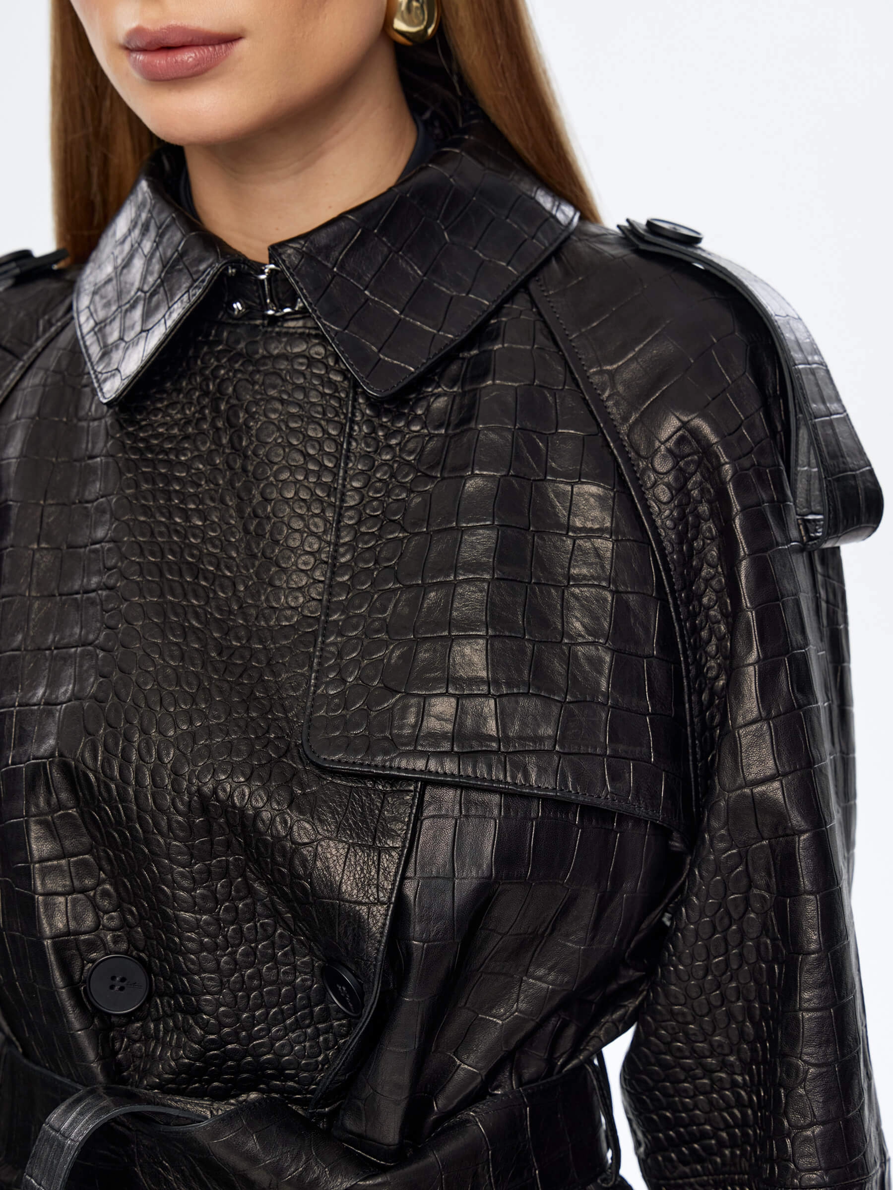 Длинный двубортный плащ выполнили из фактурной кожи премиум класса. Прямой крой, английский воротник, врезные боковые карманы. Изделие дарит не только комфорт, но и подчеркивает женственность. Модель с отлетной кокеткой и погонами дополнили широким кожаным поясом в тон.