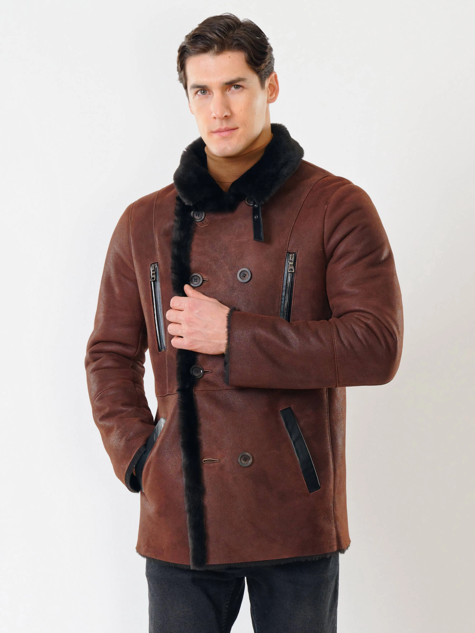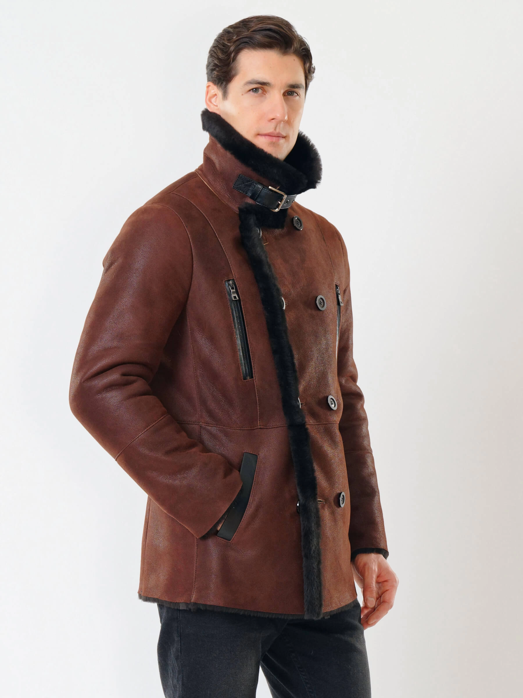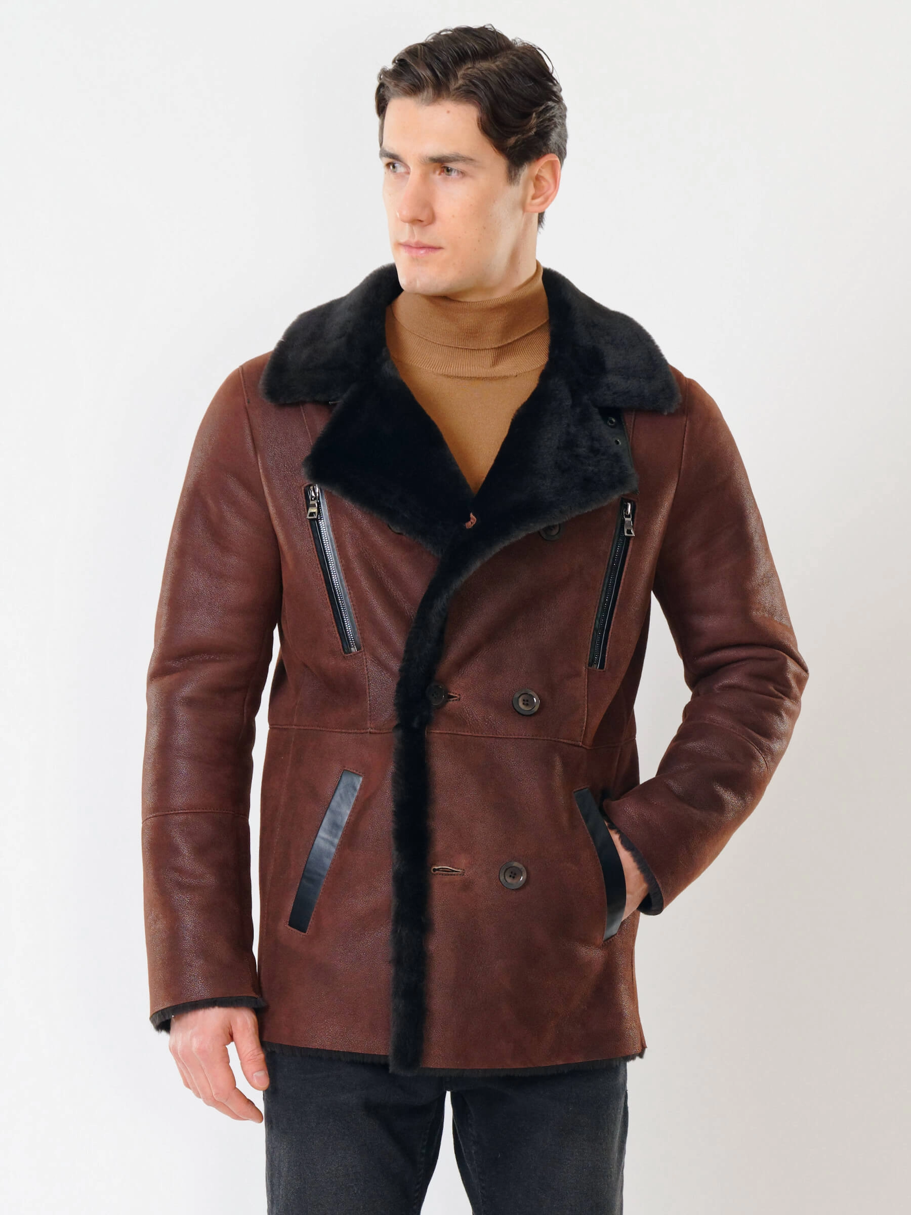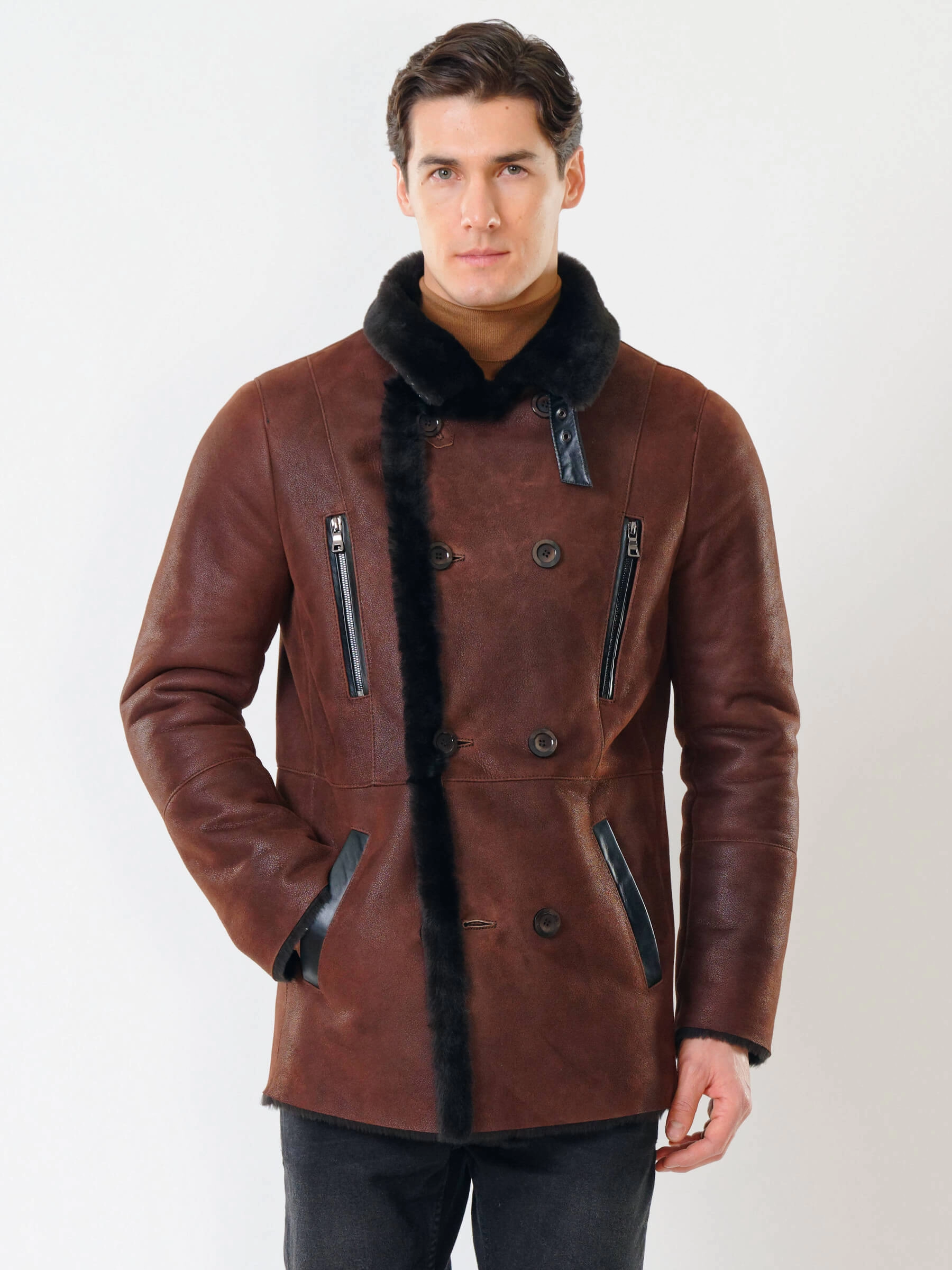 Стильная двубортная мужская дублёнка. Максимально густой мех прекрасно защитит от любого мороза. Новейшее устойчивое защитное покрытие. Длина рукавов регулируется манжетами-отворотами. Предусмотрены внутренние карманы для документов. Чёткая, выверенная посадка по фигуре. Минимальный вес. Безупречная работа наших портных. Премиальный уровень.