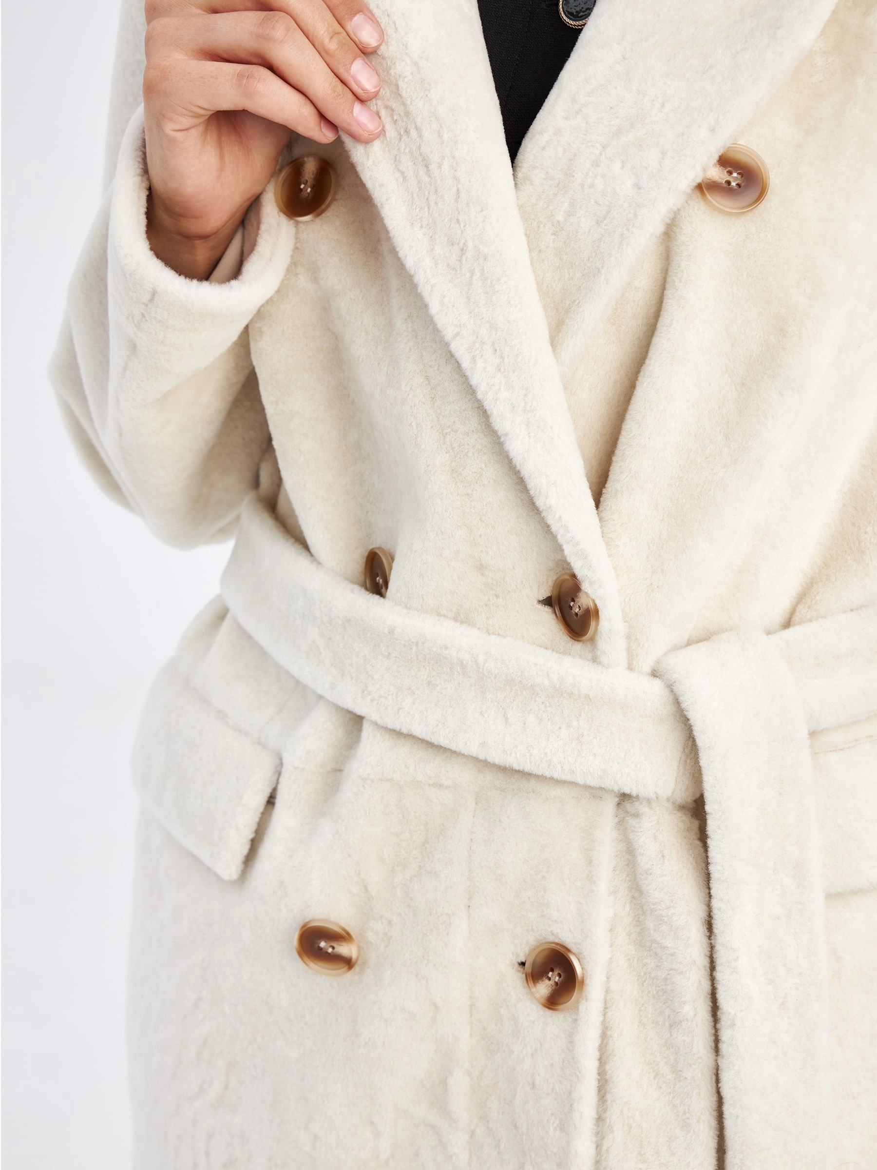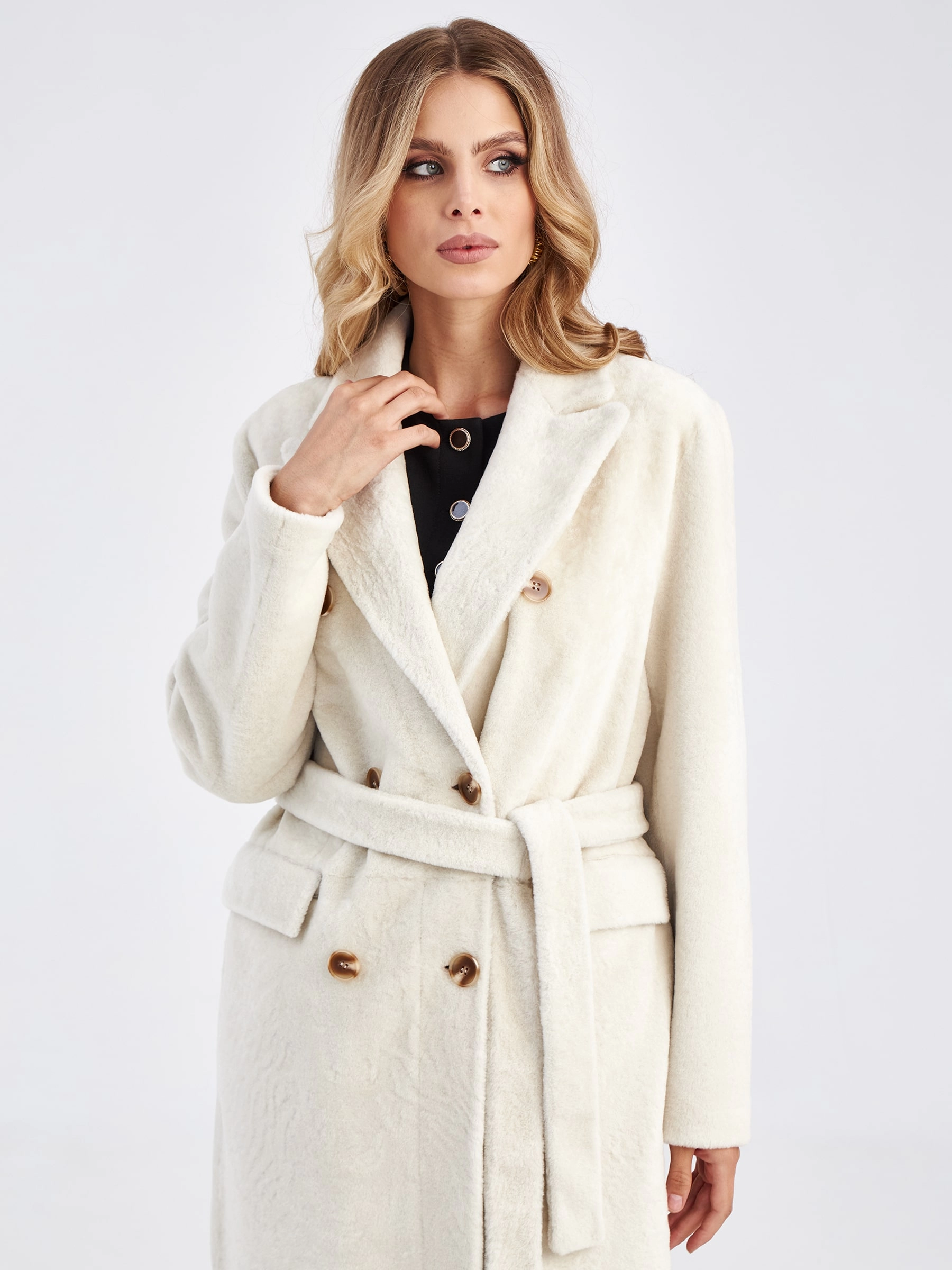 Длинная двубортная женская дубленка из астрагана премиум класса 2047, белая, размер 48, артикул 63220