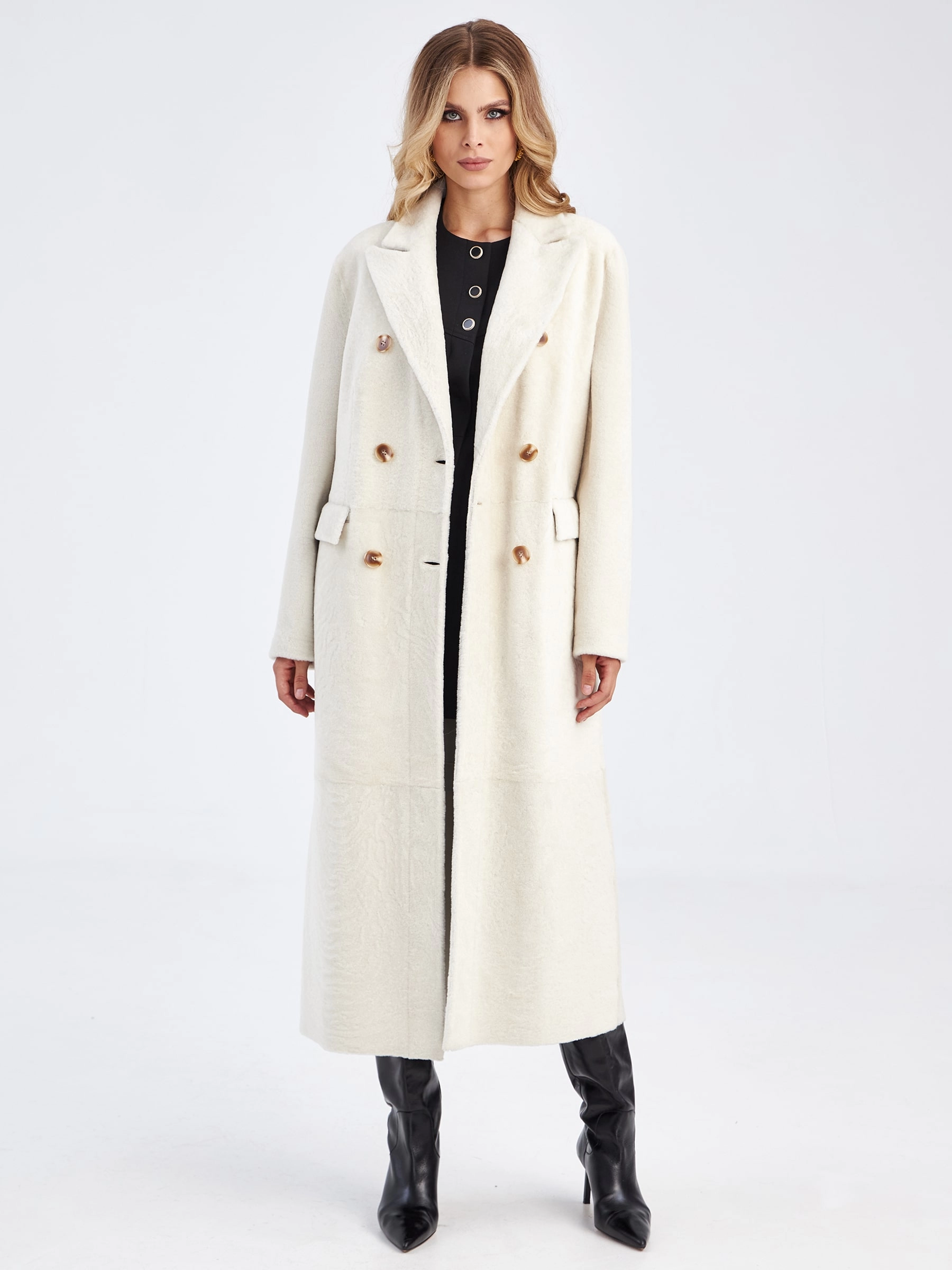 Товар длинная двубортная женская дубленка из астрагана премиум класса 2047, белая, размер 48, артикул 63220 выполнен из астраган с застежкой пуговицы. Рассчитан на сезон: осень-зима. Длина изделия свыше 90 см, силуэт прямой.
