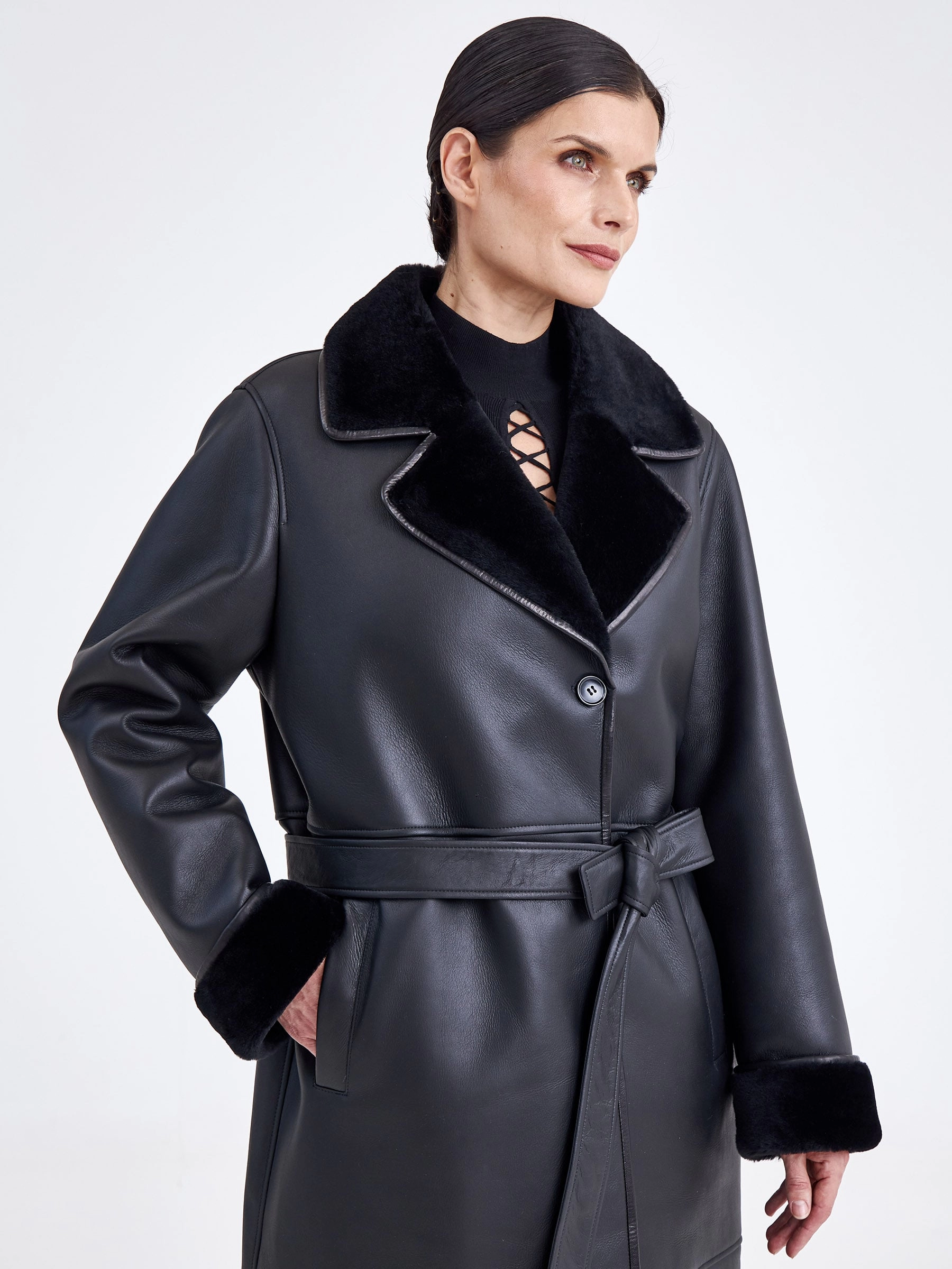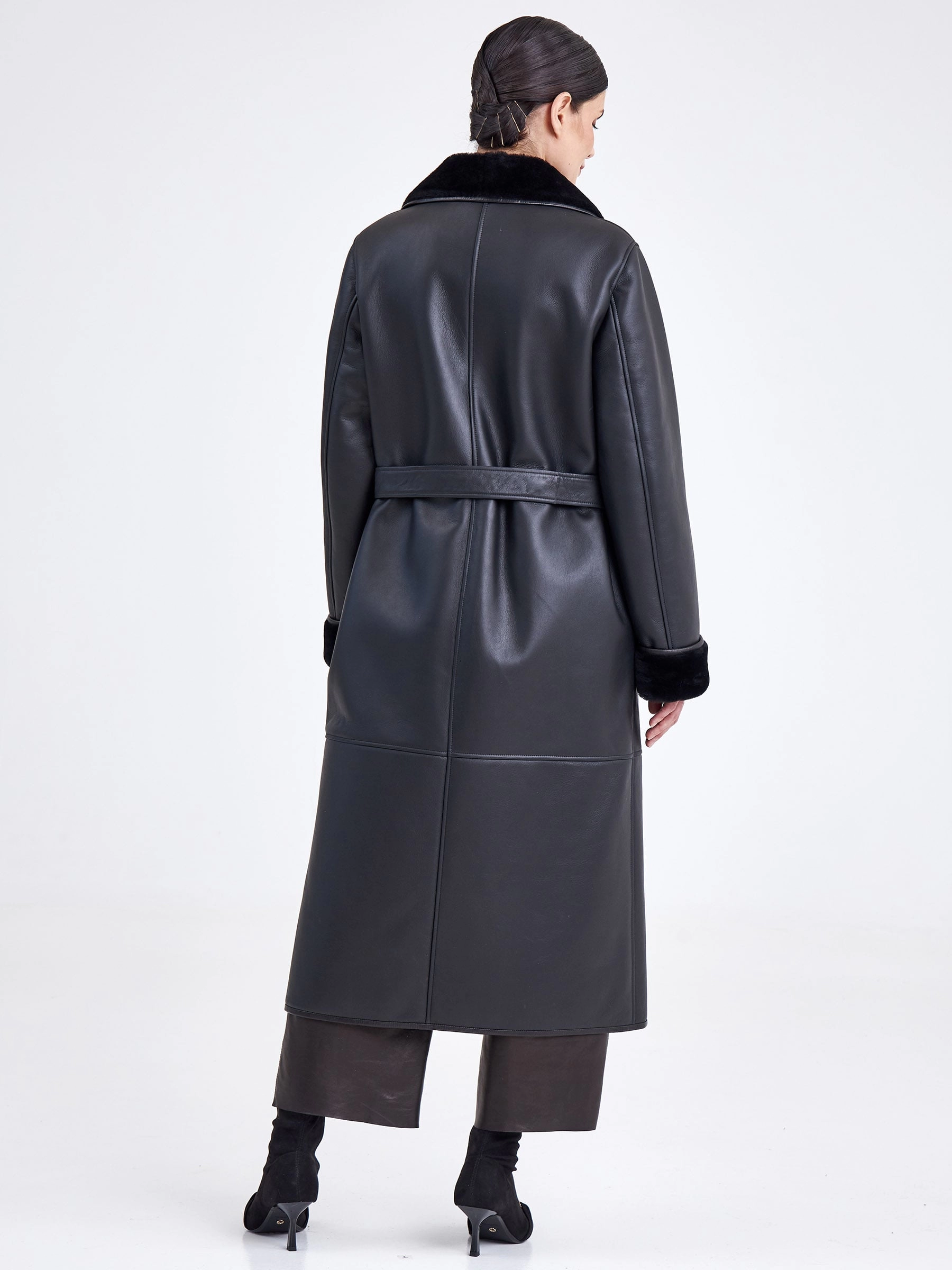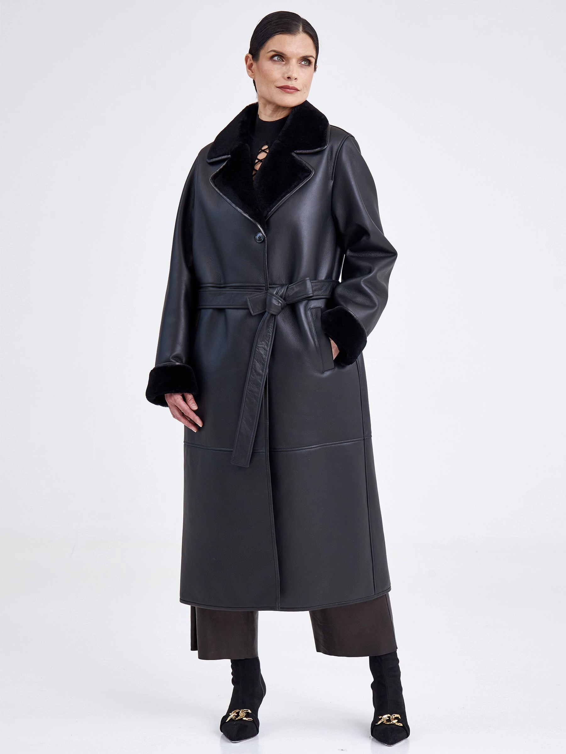 Эта строгая и лаконичная дублёнка длиной свыше 90 см выполнена из нежной овчины ягнят с максимально густым мехом, что гарантирует отличное тепло. Прямой крой и застёжка на пуговицы обеспечивают безупречную посадку, а английский воротник и борт подчёркнуты тонким кожаным кантом — без лишнего декора, чтобы на первый план вышли качество и комфорт. Длинный кожаный пояс позволяет легко менять силуэт. Совет стилиста: эта дублёнка — образец «тихой роскоши»: сочетайте её с кашемировым монокомплектом, шёлковым платьем-футляром или прямыми шерстяными брюками для безупречного делового или вечернего образа, используя пояс, чтобы акцентировать талию, а аксессуары выбирайте сдержанные и безупречного качества — гладкую кожаную сумку, перчатки и ботильоны на тонком каблуке в единой цветовой гамме.