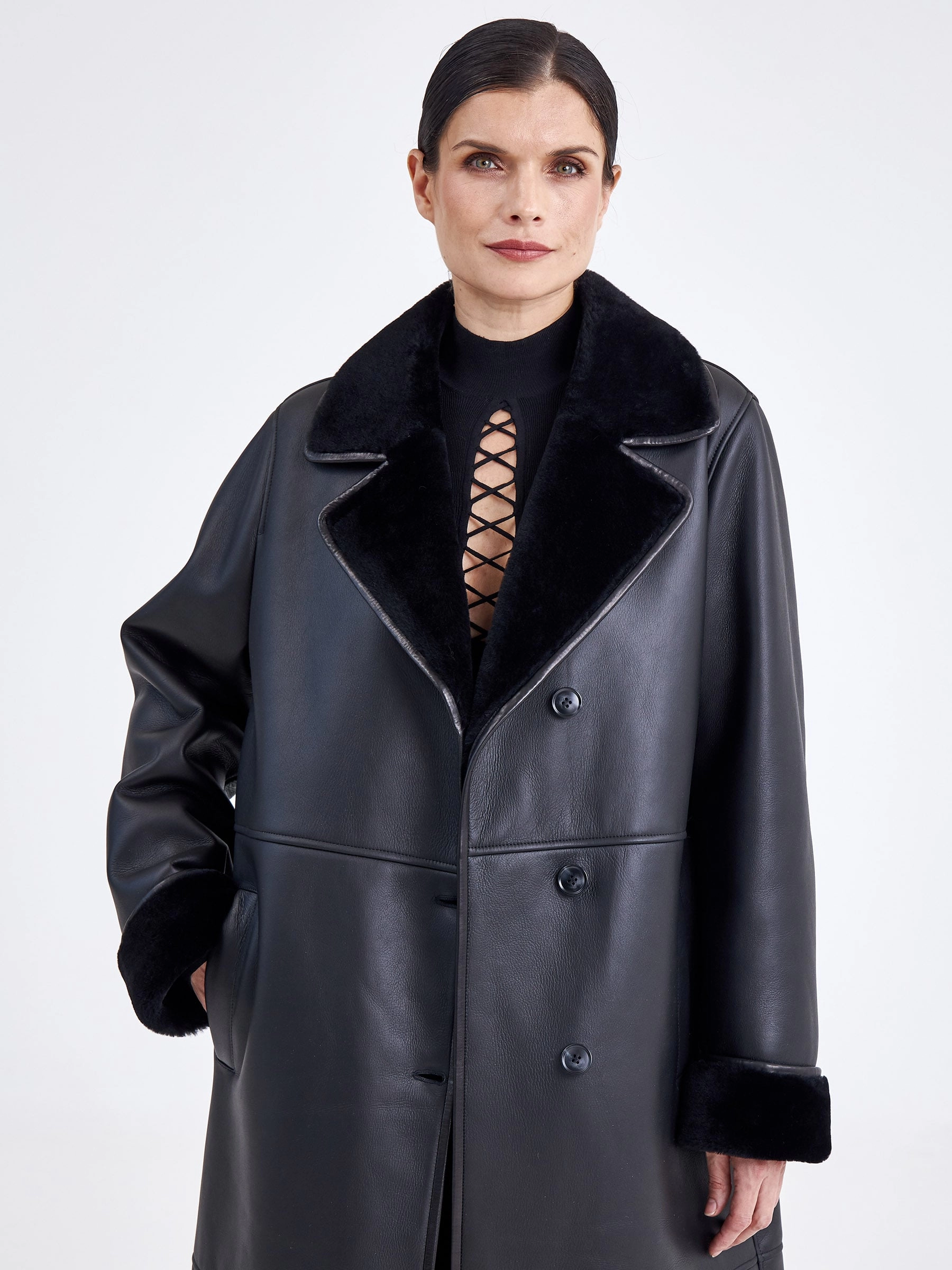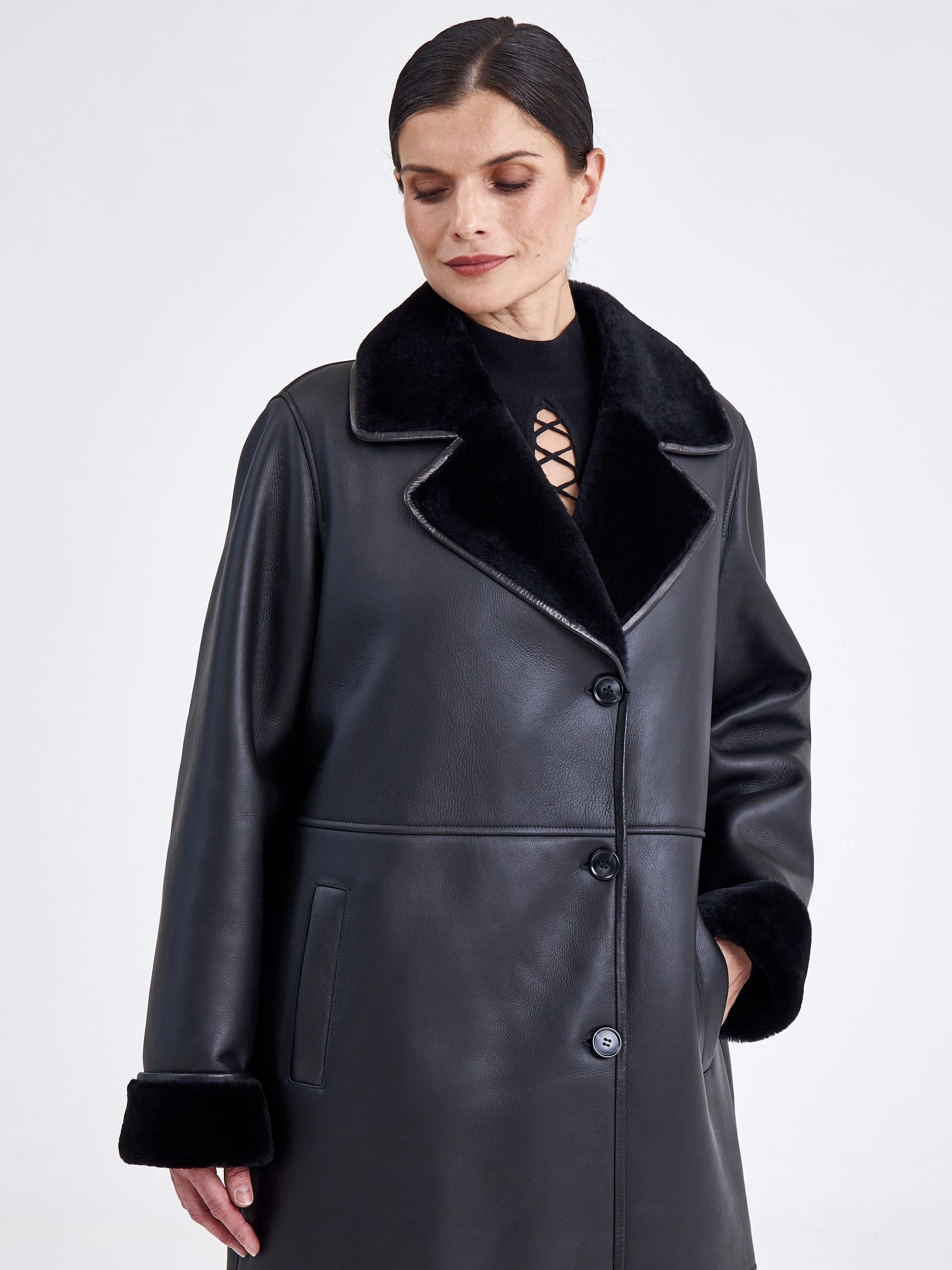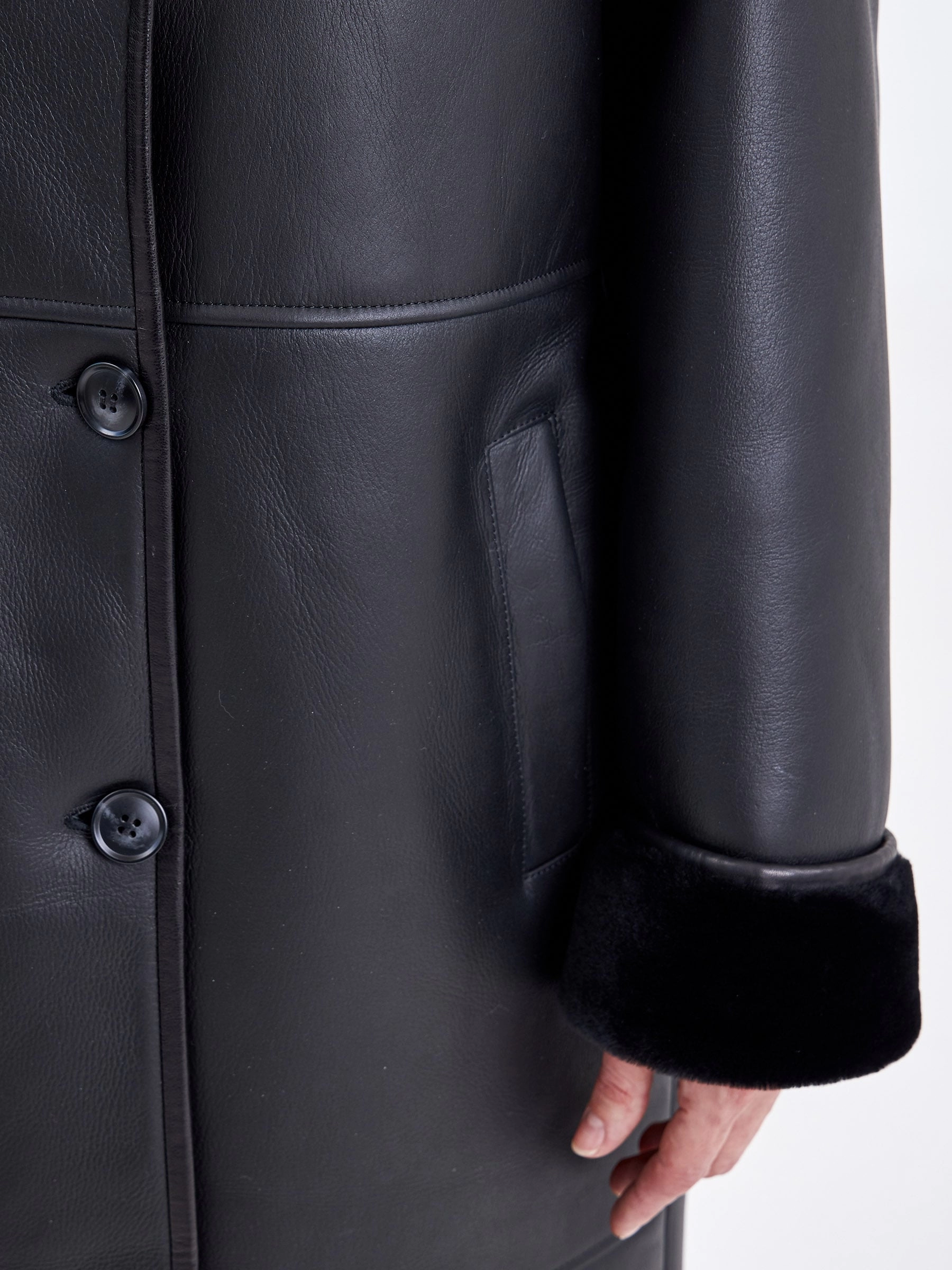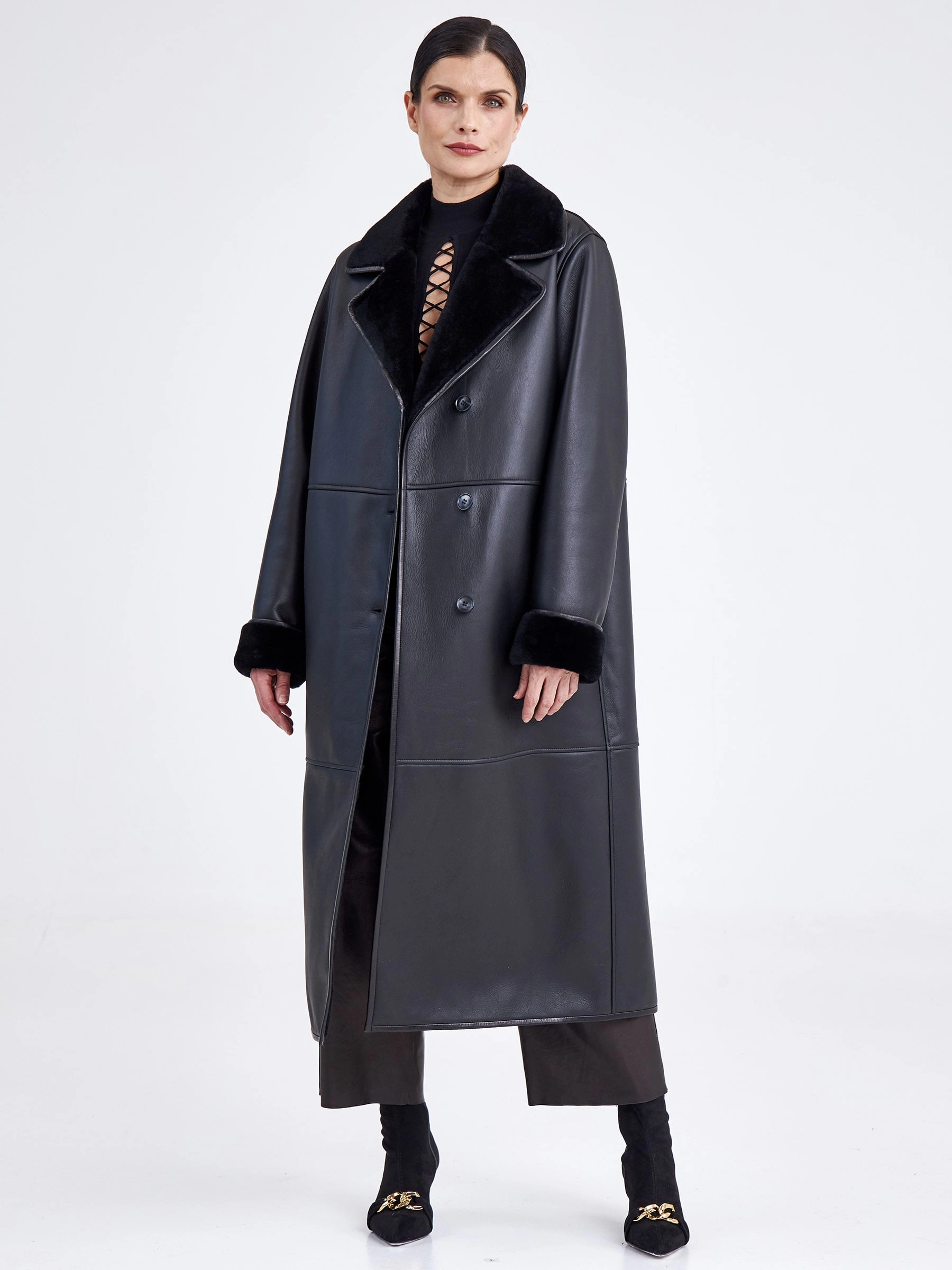 Эта строгая и лаконичная дублёнка длиной свыше 90 см выполнена из нежной овчины ягнят с максимально густым мехом, что гарантирует отличное тепло. Прямой крой и застёжка на пуговицы обеспечивают безупречную посадку, а английский воротник и борт подчёркнуты тонким кожаным кантом — без лишнего декора, чтобы на первый план вышли качество и комфорт. Длинный кожаный пояс позволяет легко менять силуэт. Совет стилиста: эта дублёнка — образец «тихой роскоши»: сочетайте её с кашемировым монокомплектом, шёлковым платьем-футляром или прямыми шерстяными брюками для безупречного делового или вечернего образа, используя пояс, чтобы акцентировать талию, а аксессуары выбирайте сдержанные и безупречного качества — гладкую кожаную сумку, перчатки и ботильоны на тонком каблуке в единой цветовой гамме.