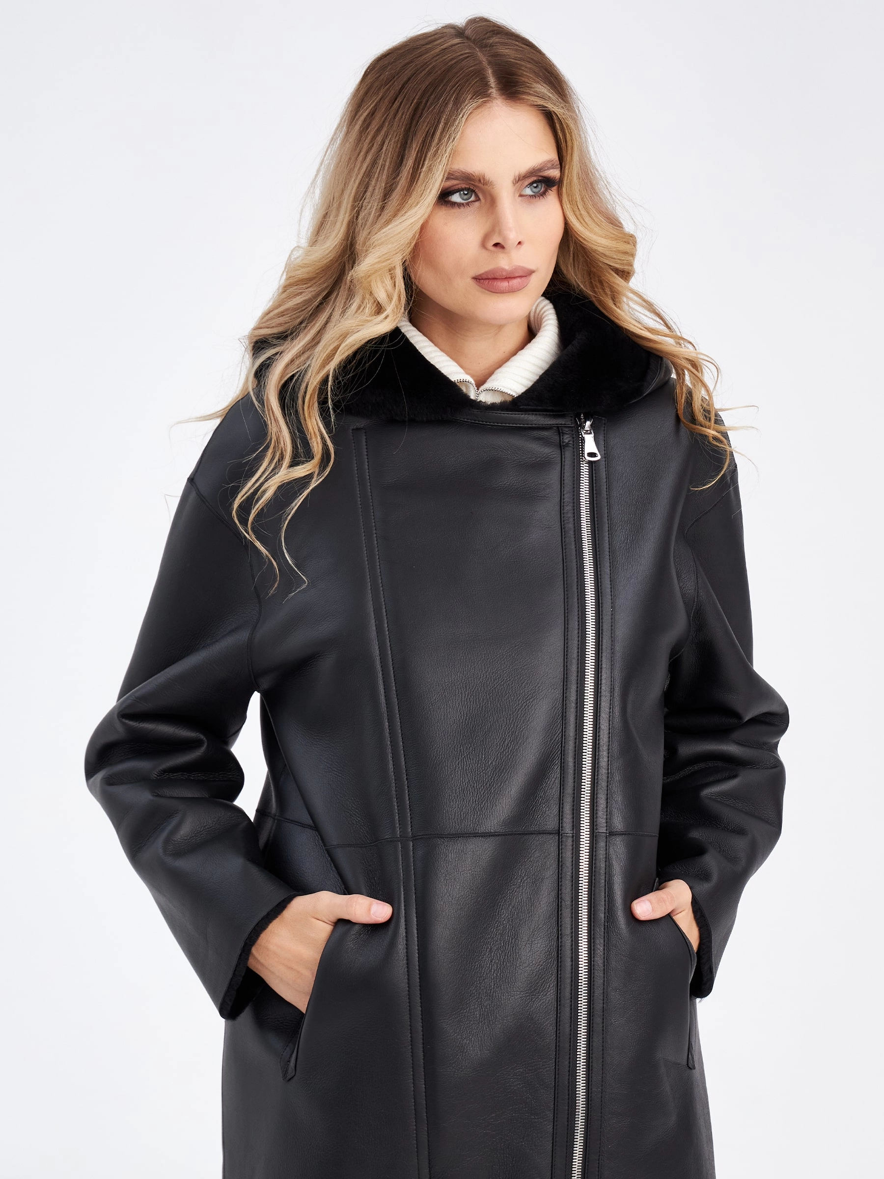 Товар женская двусторонняя дубленка косуха с капюшоном премиум класса 2012н, черная, размер 44, артикул 63200 выполнен из овчина "мерино" с застежкой молния. Рассчитан на сезон: осень-зима. Длина изделия 75-90 см, силуэт прямой.