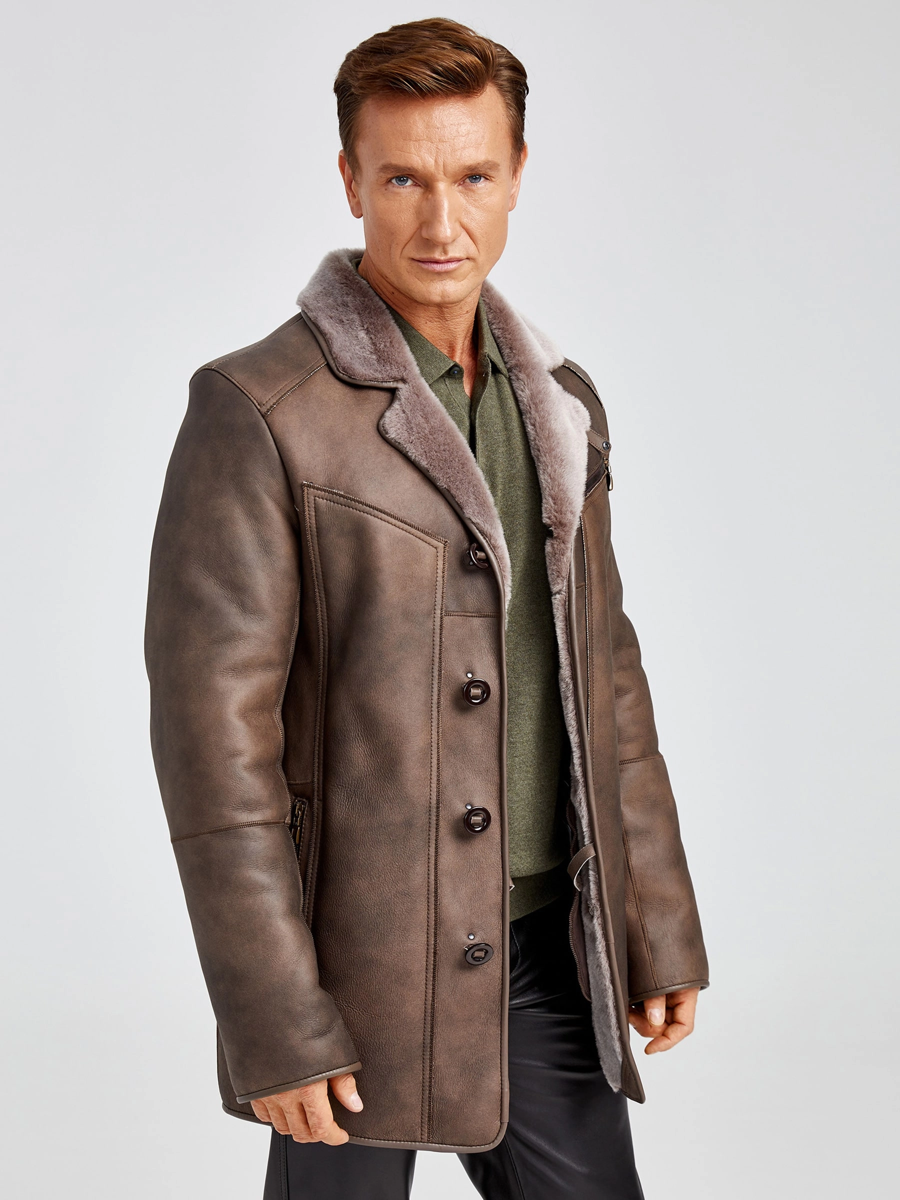 Современная мужская дублёнка, классической длины. Удобные карманы для ключей и документов. Новейшее защитное покрытие. Особо прочные нитки. Приятный на ощупь, максимально густой мех мериносной породы овец. Идеальные швы, продуманные и удобные элементы. Аккуратность во всей работе. Чёткая и очень удобная посадка по фигуре. Великолепная свобода движений. Абсолютный комфорт.