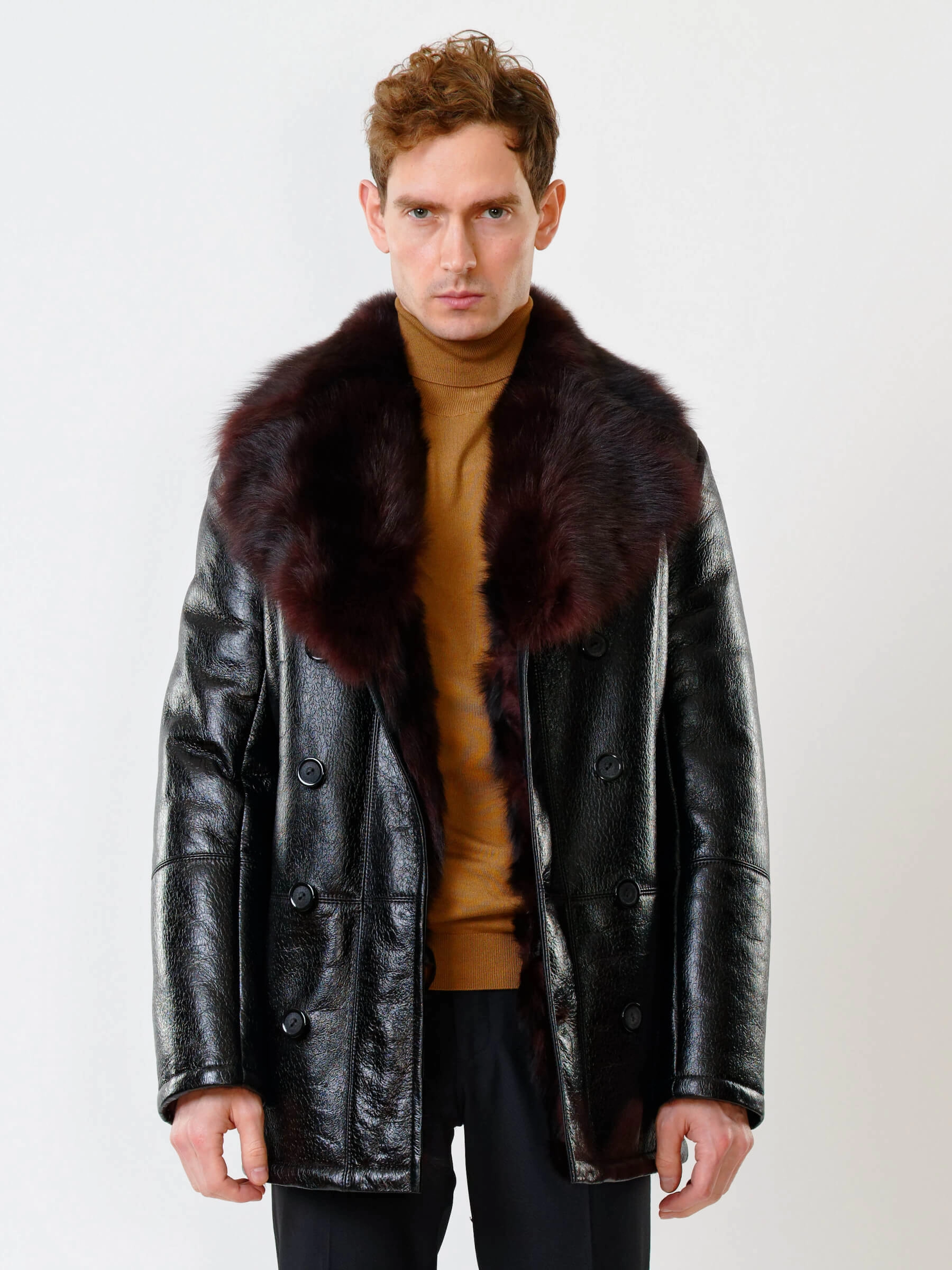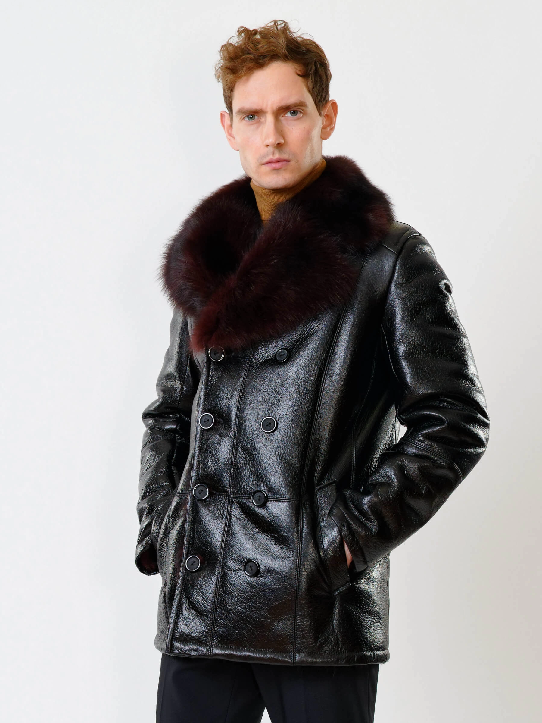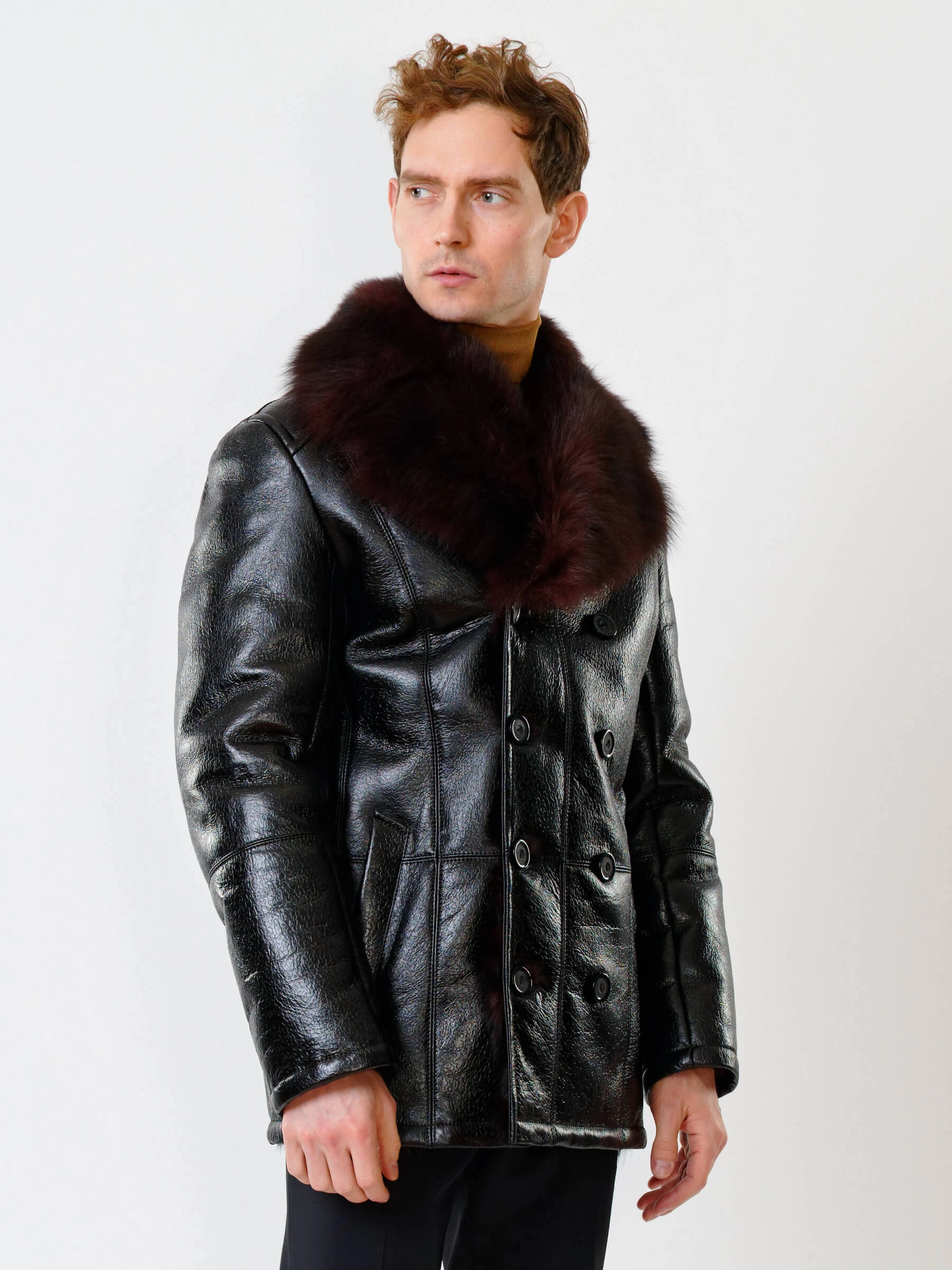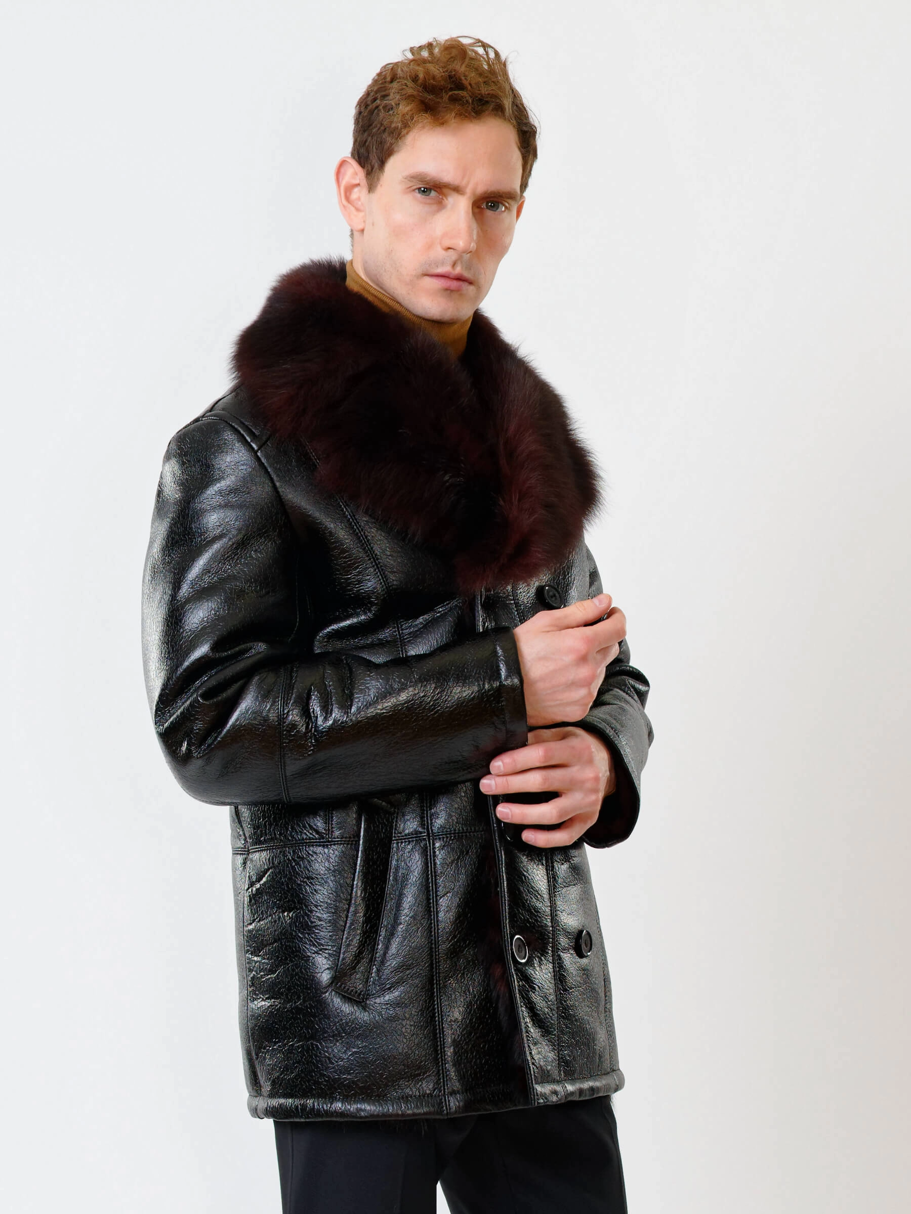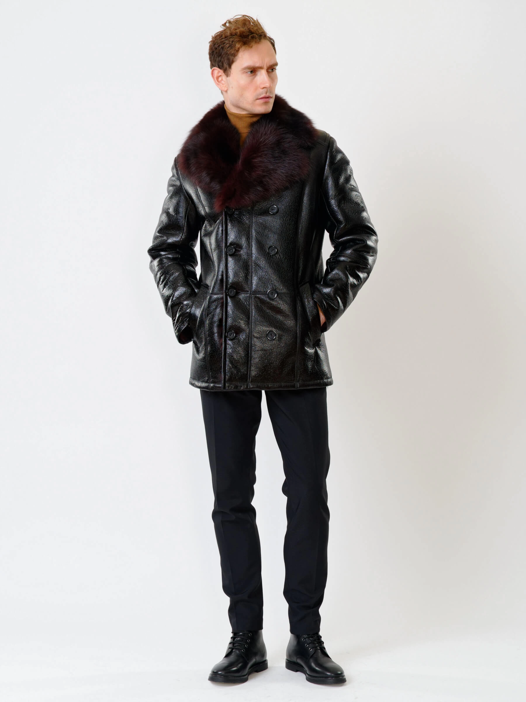 Стильная двубортная мужская дублёнка. Тосканская овчина высшего качества. Высокий, максимально густой мех прекрасно защитит от любого мороза. Новейшее устойчивое защитное покрытие. Английский воротник. Длина рукавов регулируется отворотом манжет. Чёткая, выверенная посадка по фигуре. Безупречная работа наших портных.