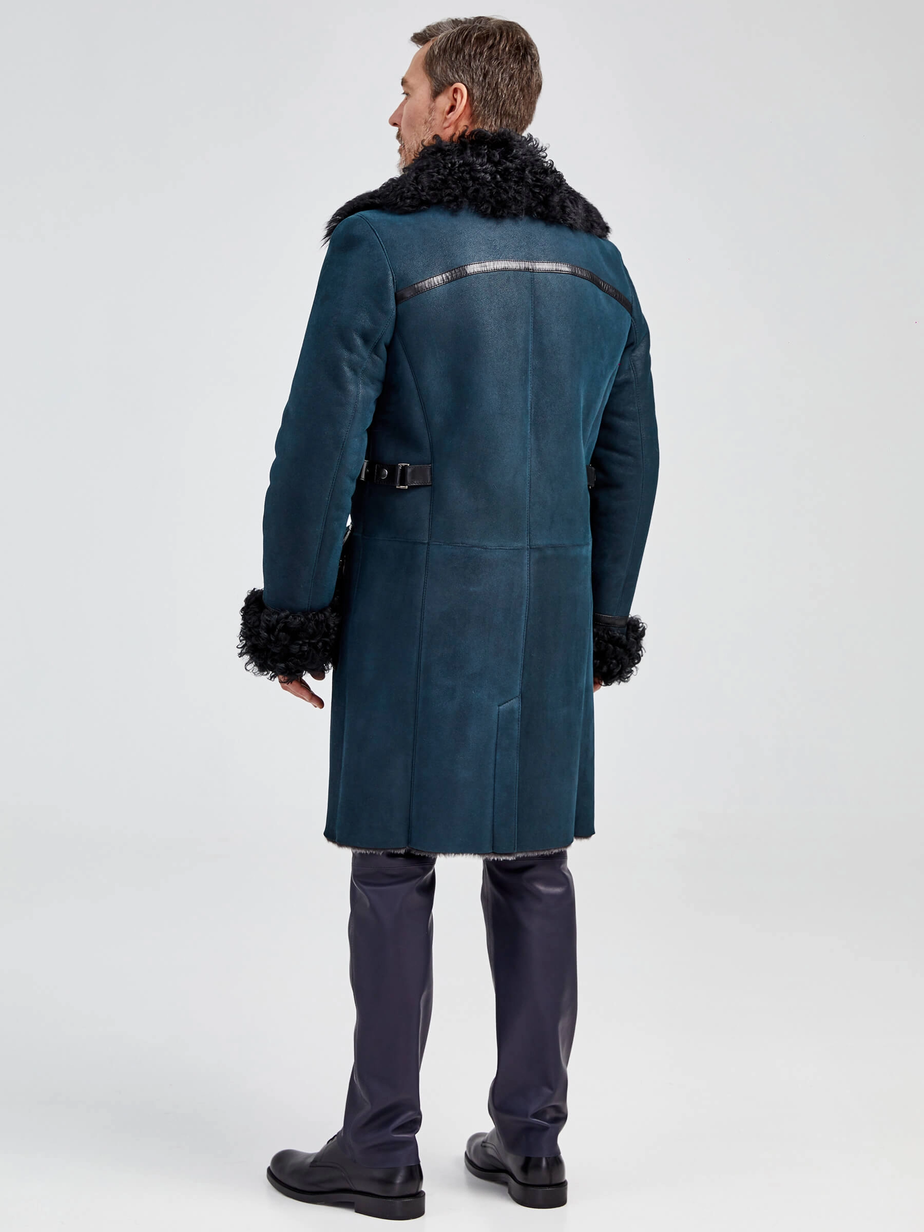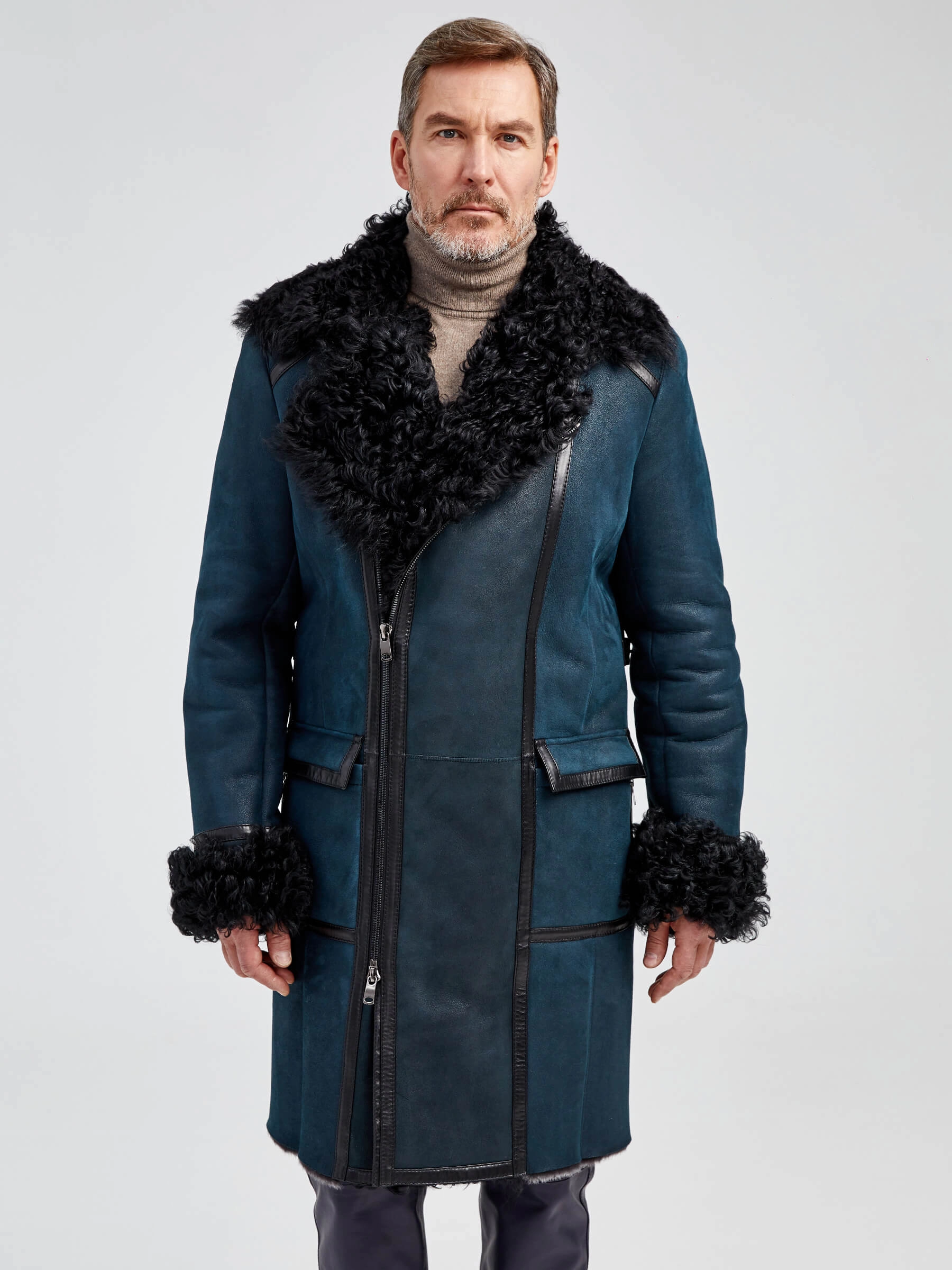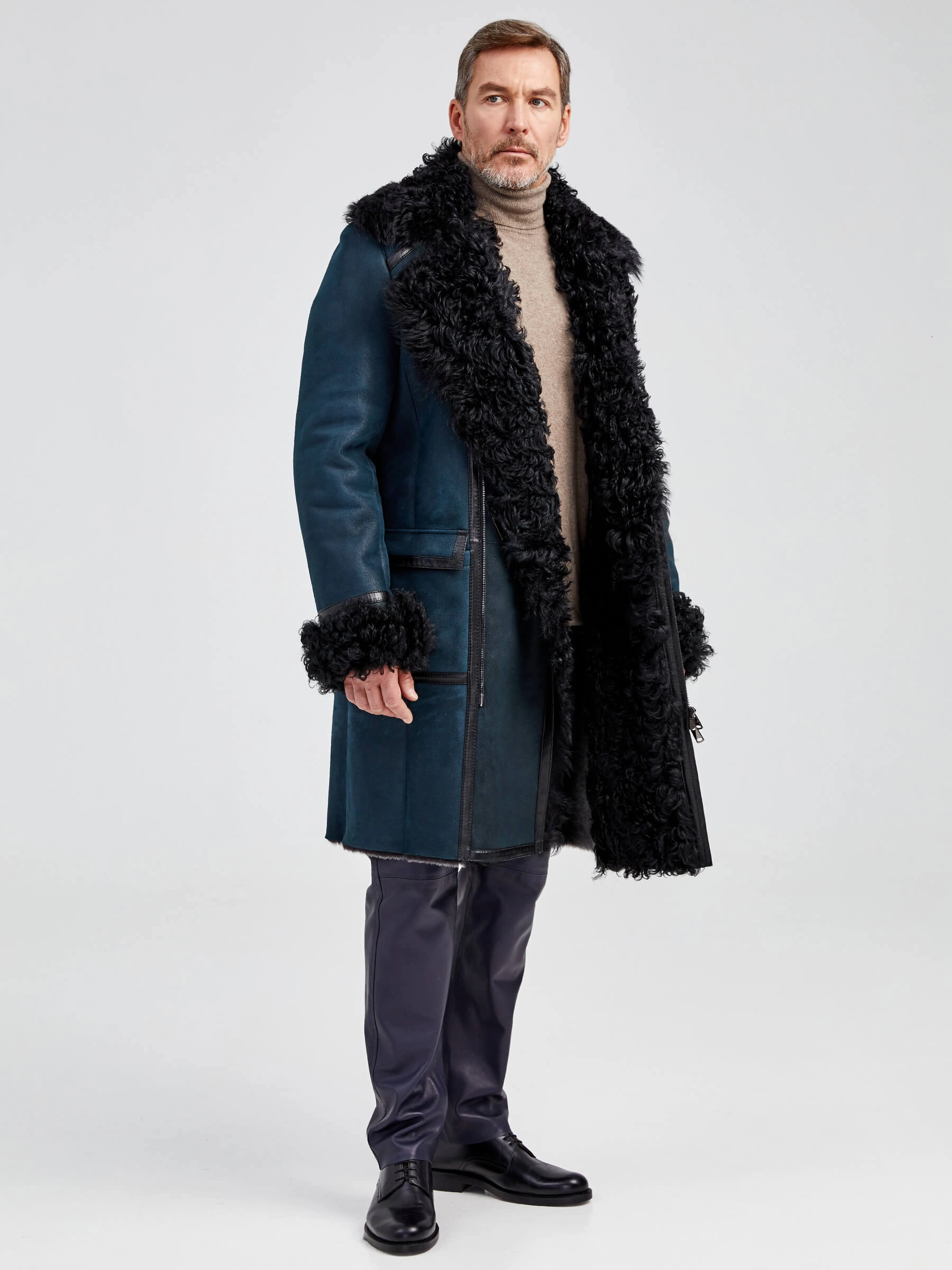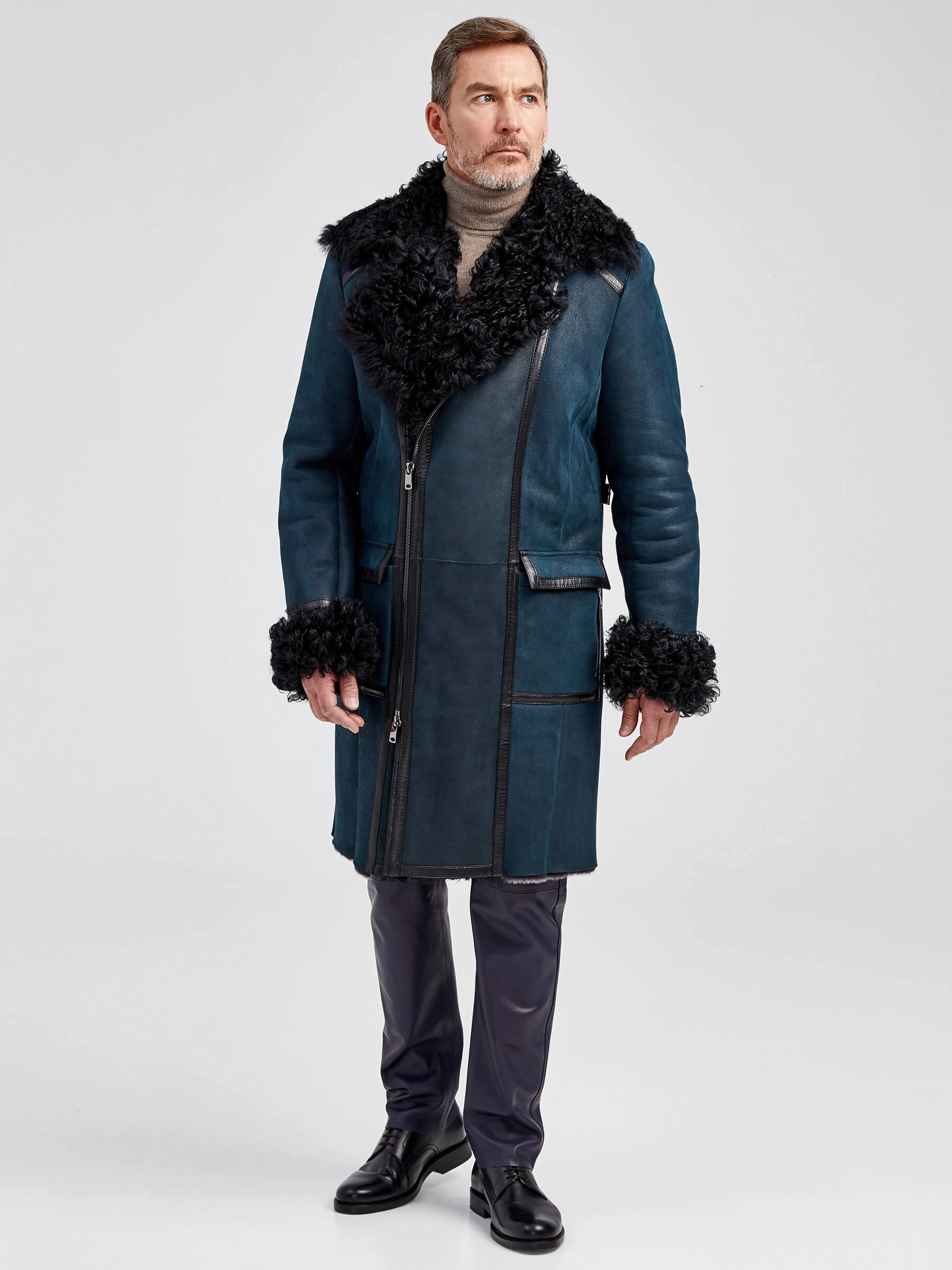 Товар длинная мужская дубленка с мехом тиградо премиум класса 424, синяя, размер 52, артикул 70922 выполнен из овчина "мерино" с застежкой молния. Рассчитан на сезон: осень-зима. Длина изделия 107 см, силуэт полуприлегающий.