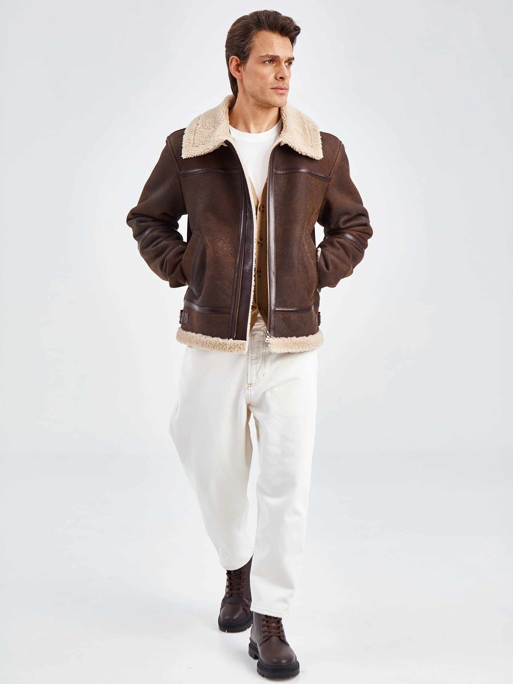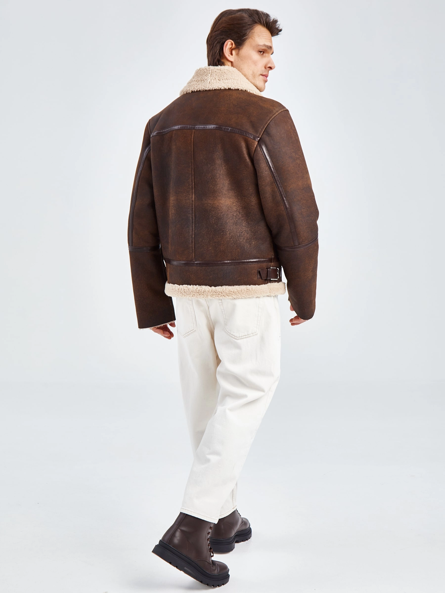 Товар короткая мужская дубленка пилот из овчины керли премиум класса 430, коричневая, размер 48, артикул 70571 выполнен из овчина "мерино" с застежкой молния. Рассчитан на сезон: осень-зима. Длина изделия 70 см, силуэт прямой.