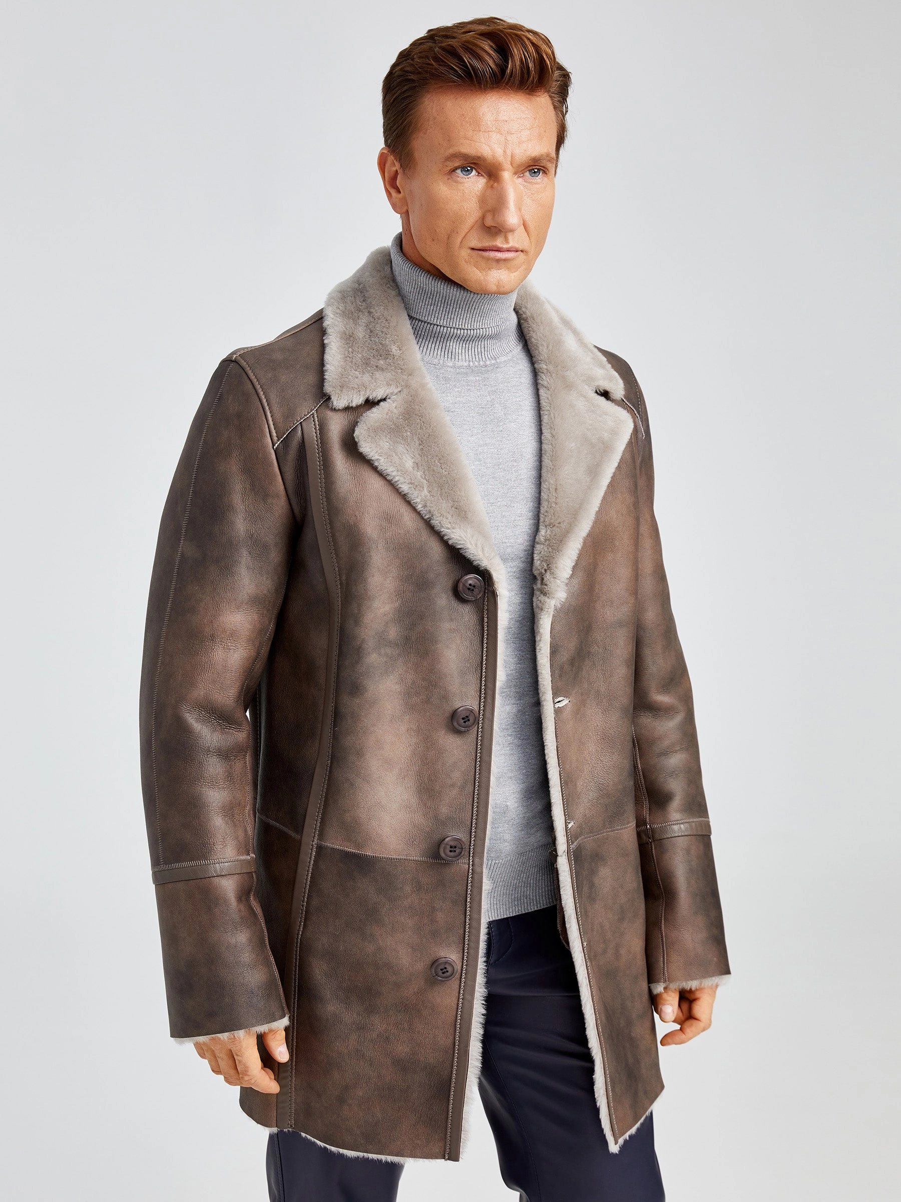 Современная мужская дублёнка классической длины. Удобные карманы для ключей и документов. Новейшее защитное покрытие. Особо прочные нитки. Приятный на ощупь, максимально густой мех мериносной породы овец. Идеальные швы, продуманные и удобные элементы. Аккуратность во всей работе. Чёткая и очень удобная посадка по фигуре. Великолепная свобода движений. Абсолютный комфорт.