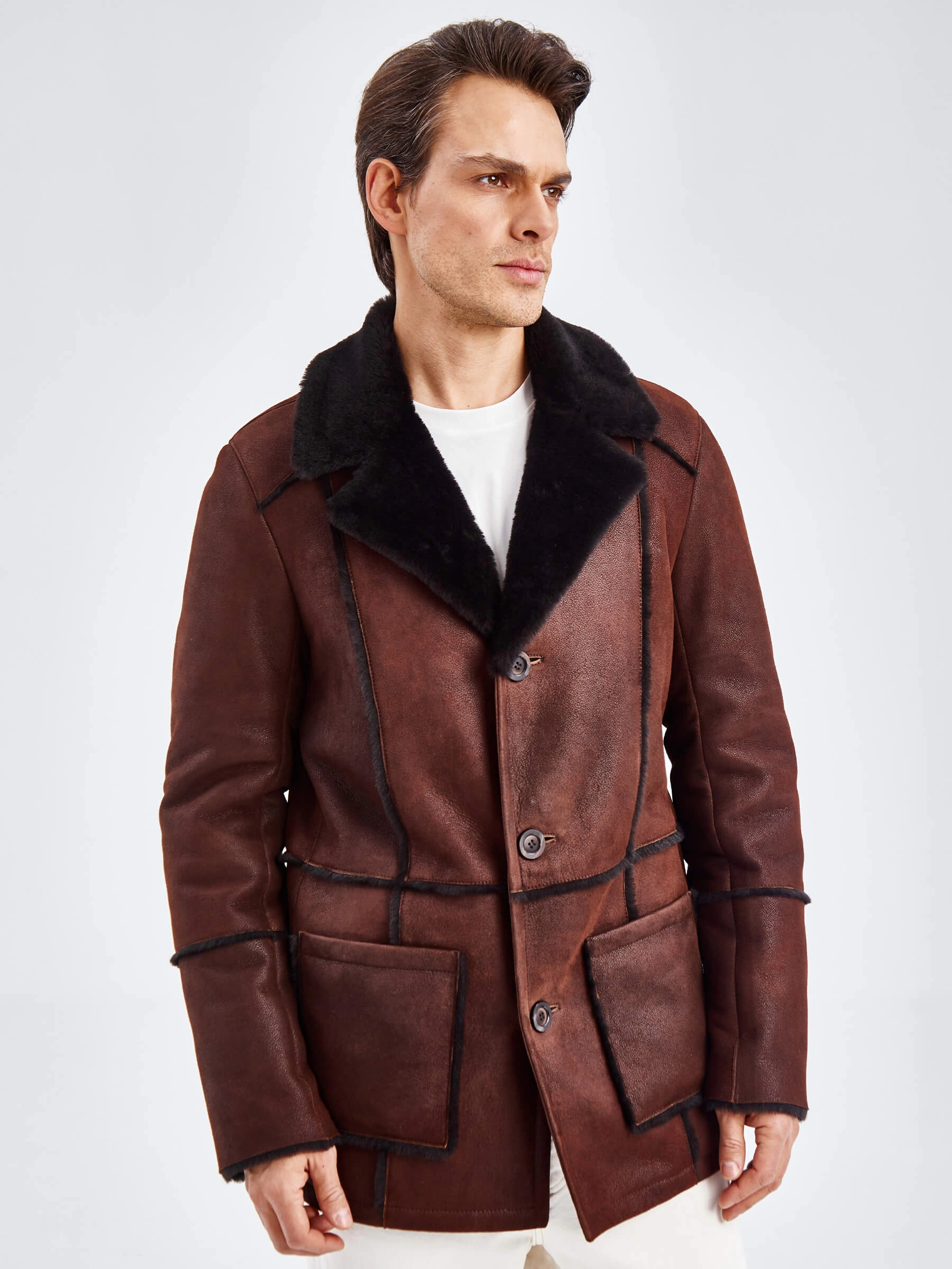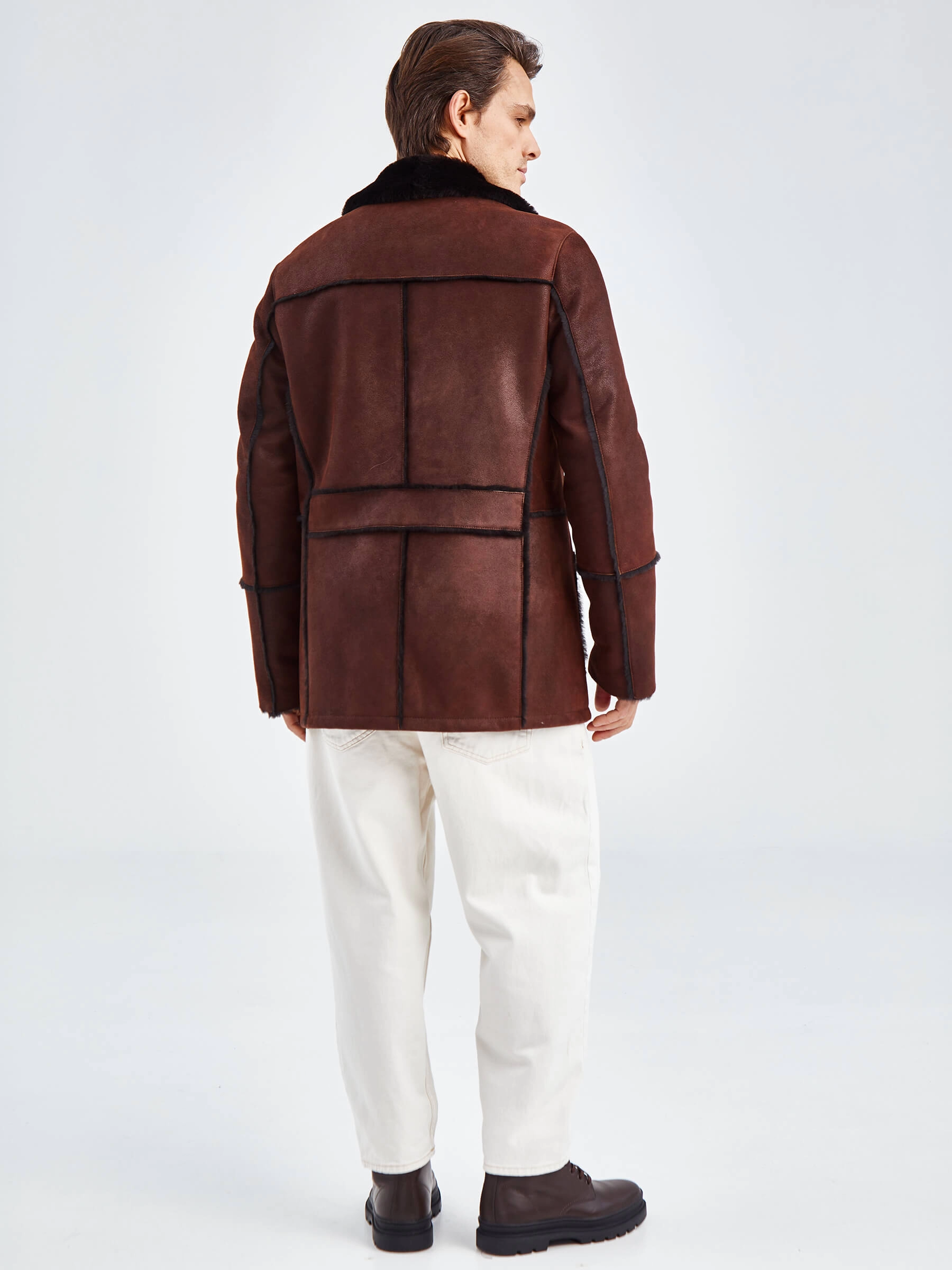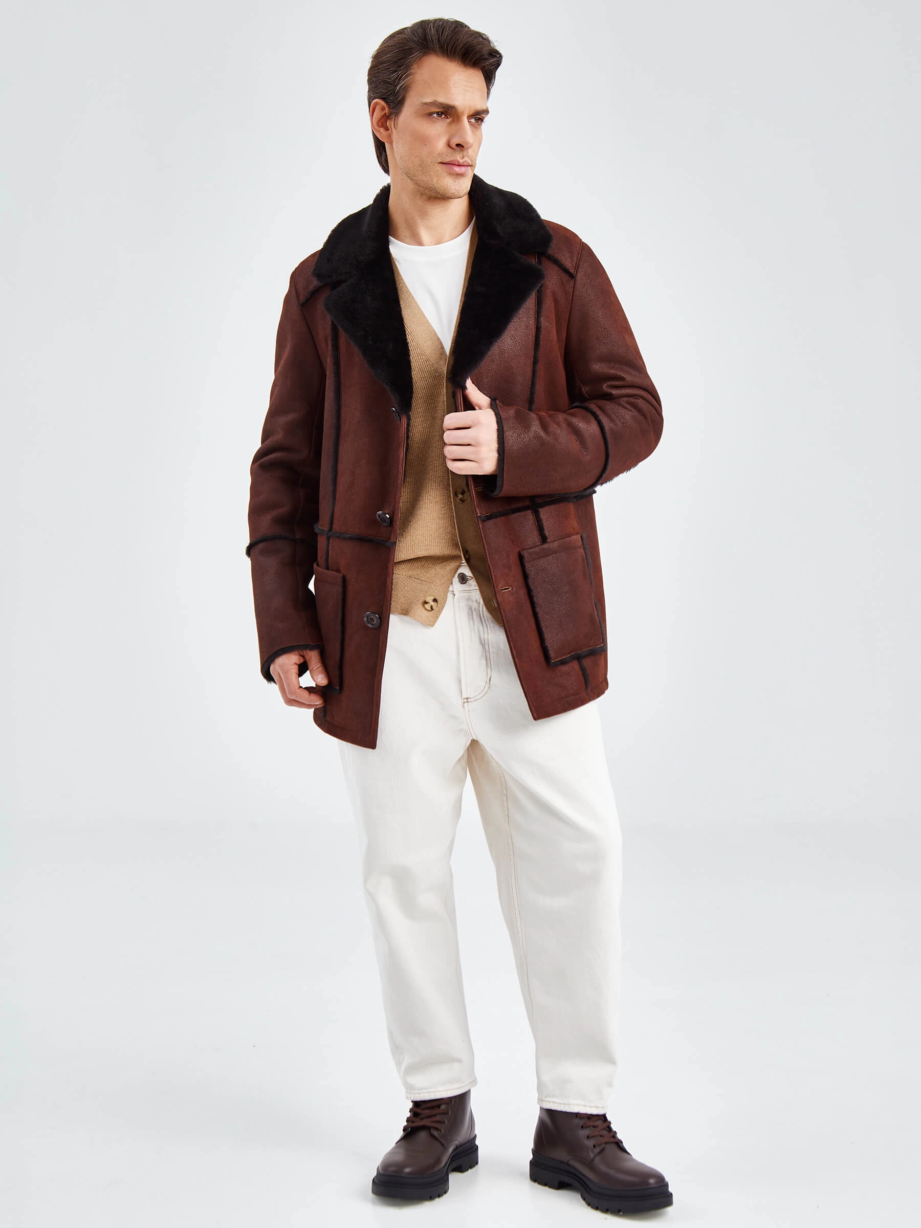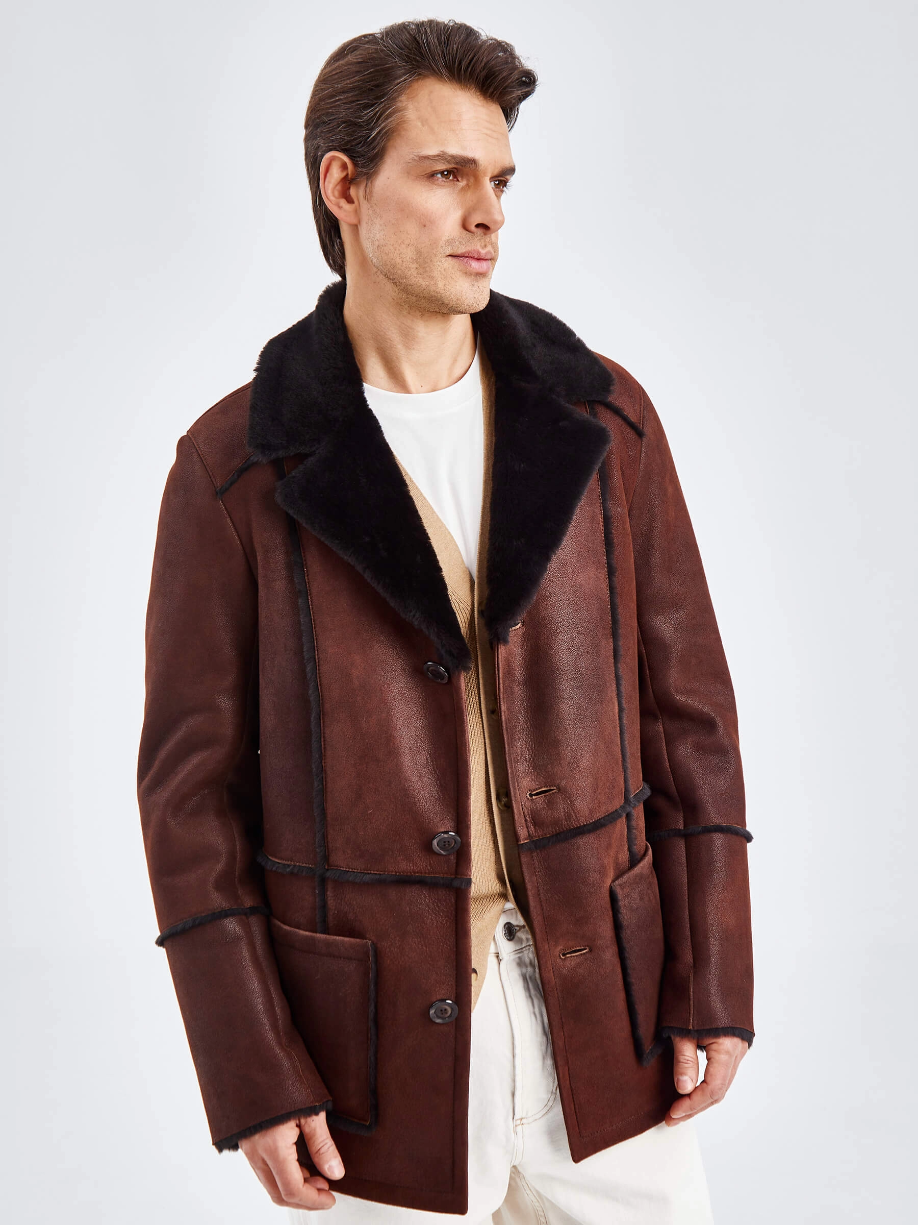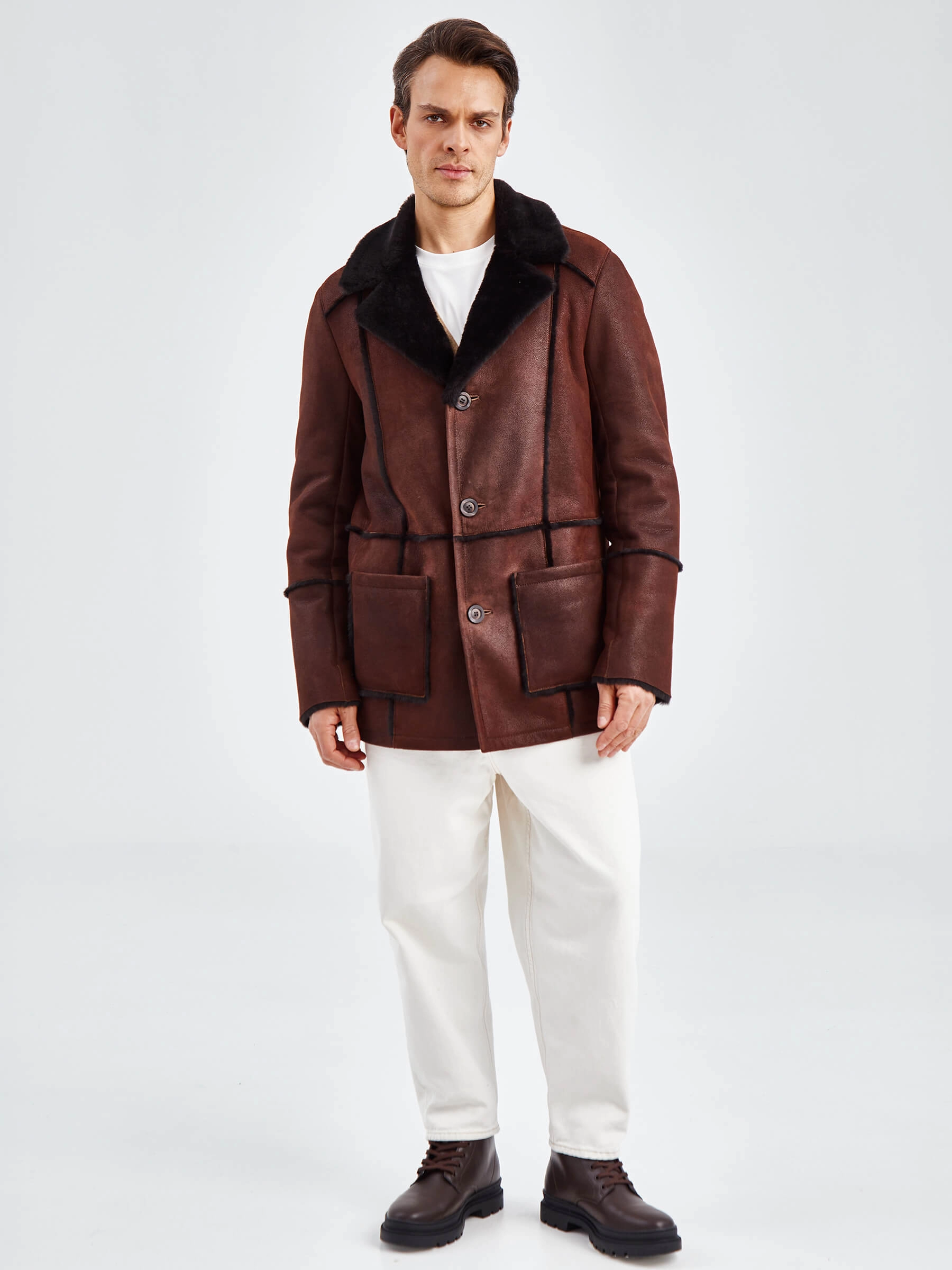Товар дубленка пиджак с выпущенным мехом для мужчин премиум класса 434, виски, размер 48, артикул 71440 выполнен из овчина "мерино" с застежкой пуговицы. Рассчитан на сезон: осень-зима. Длина изделия 81 см, силуэт прямой.