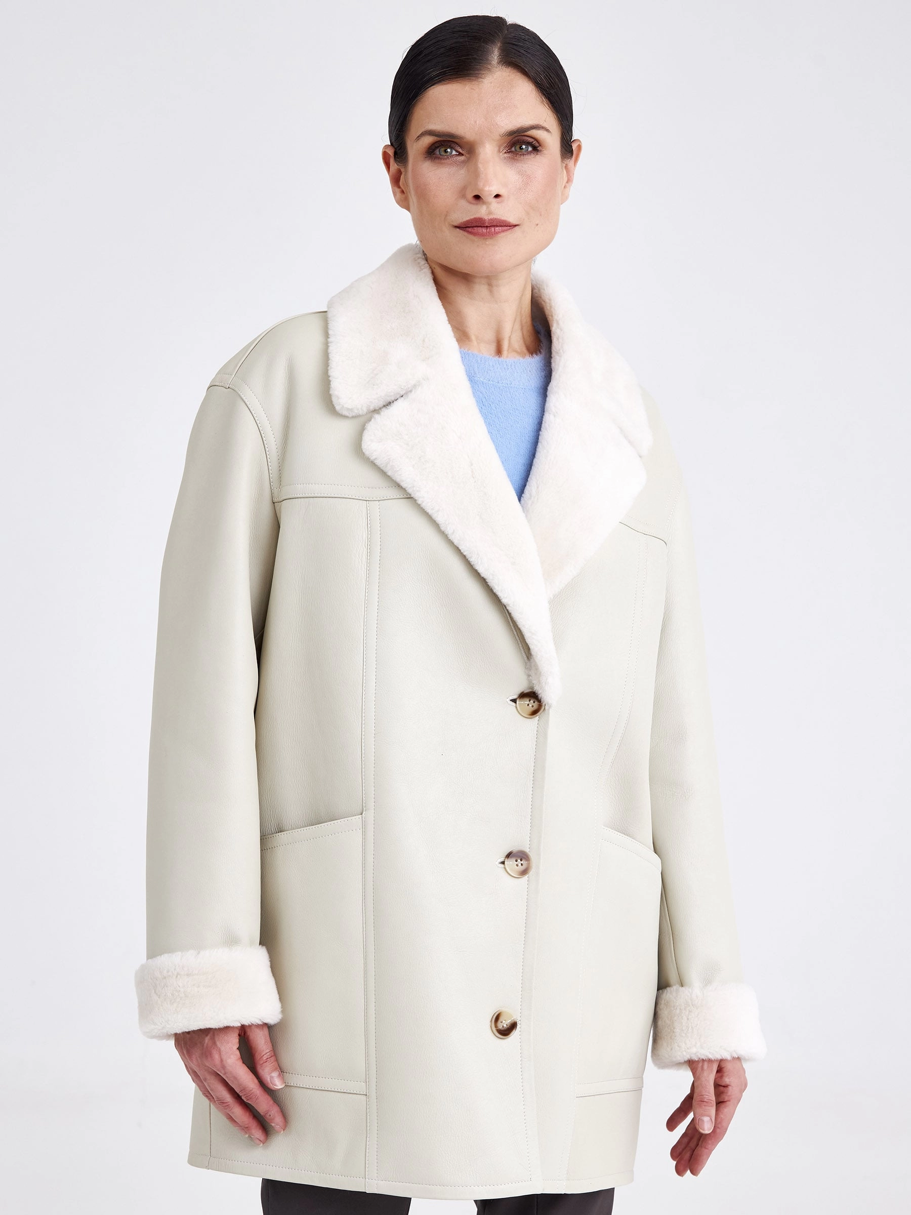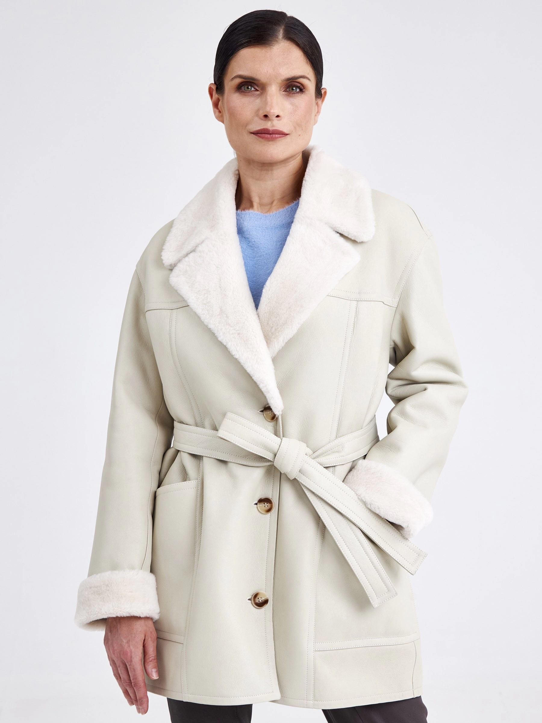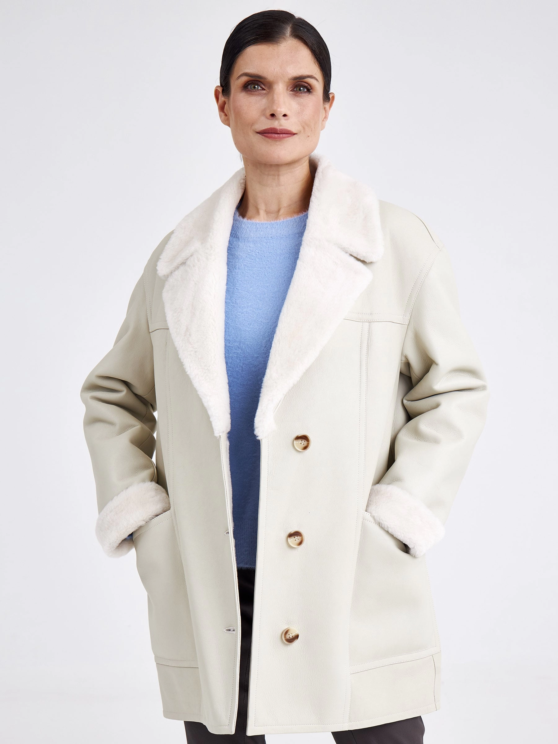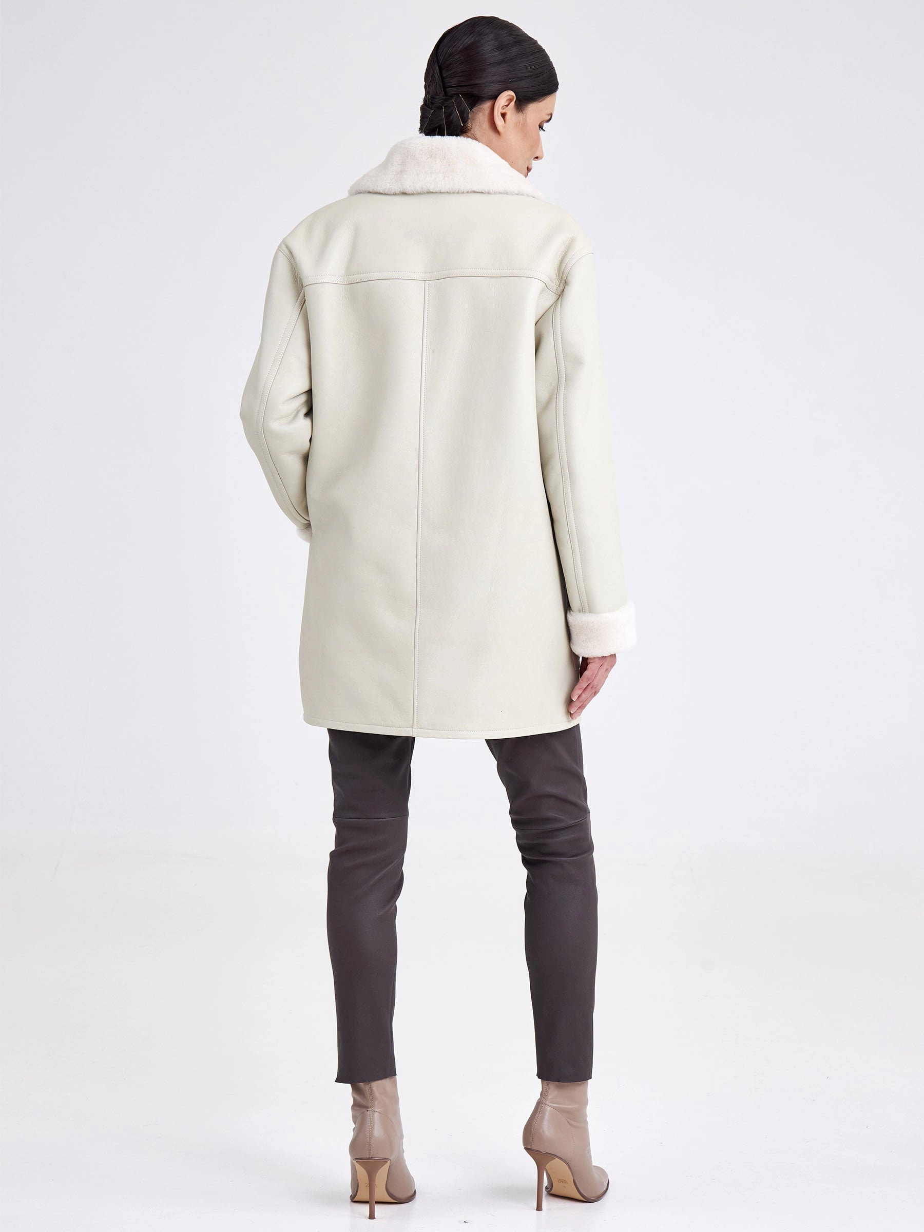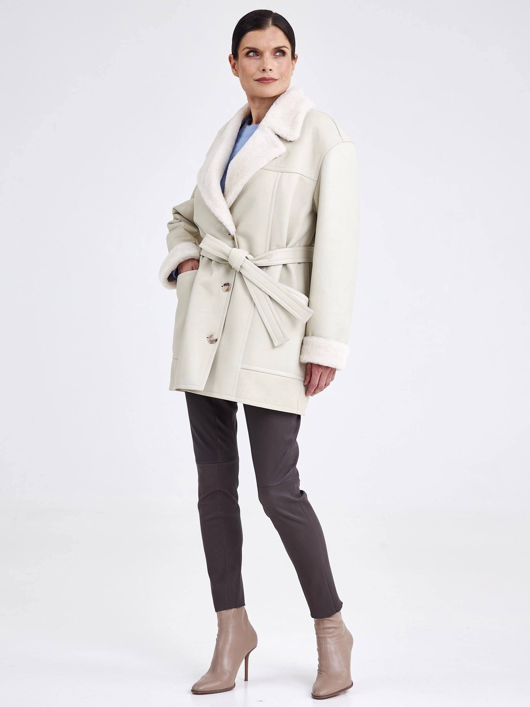 Эта модель — идеальный симбиоз классического кроя пиджака и уютной фактуры дублёнки. Она выполнена из эластичной овчины «мерино» бережной выделки, которая обеспечивает комфорт, лёгкость и превосходную терморегуляцию. Её прямой силуэт с аккуратной спущенной линией плеч и английским воротником создаёт образ умной повседневности, а застёжка на пуговицы и отсутствие капюшона подчёркивают лаконичность фасона. Длина до середины бедра (около 75–90 см) делает её универсальным вариантом для межсезонья и мягкой зимы. Дублёнка не имеет традиционной подкладки — её внутренняя сторона представляет собой обработанный мягкий мех овчины, который приятен на ощупь и отлично сохраняет тепло. Практичности добавляют два вместительных кармана, а широкий пояс в комплекте позволяет менять восприятие силуэта, добавляя ему строгости или лёгкой небрежности. Совет от стилиста: носите её как элегантную альтернативу пиджаку с брюками и водолазкой или как верхний слой поверх объёмного свитера — пояс поможет сохранить чёткий силуэт и заверши