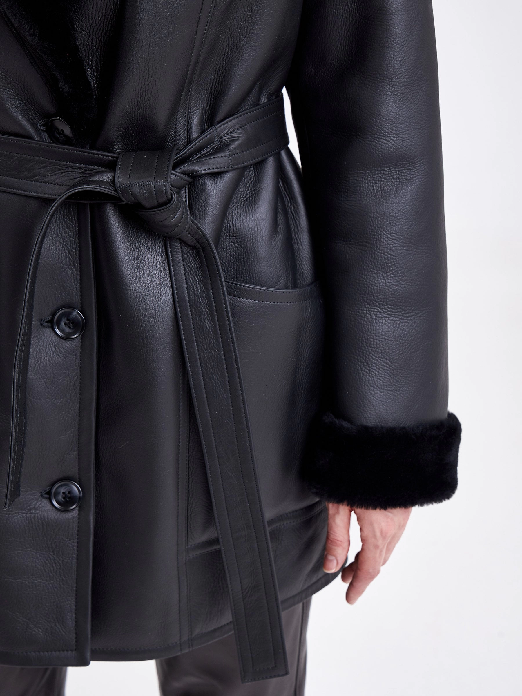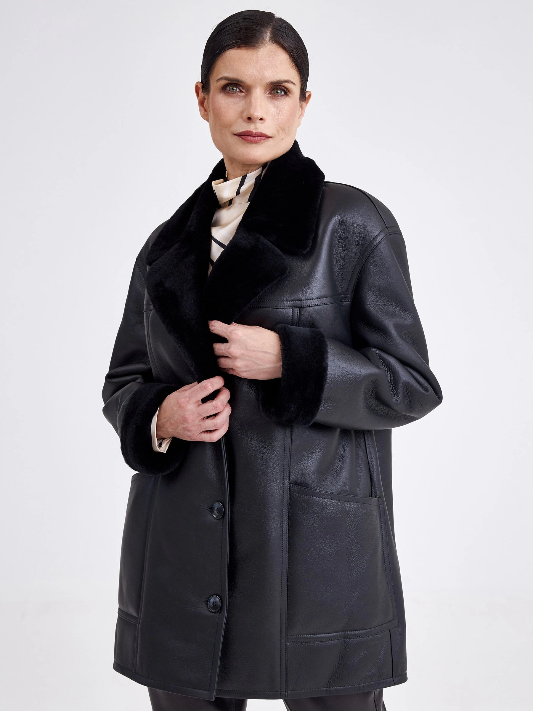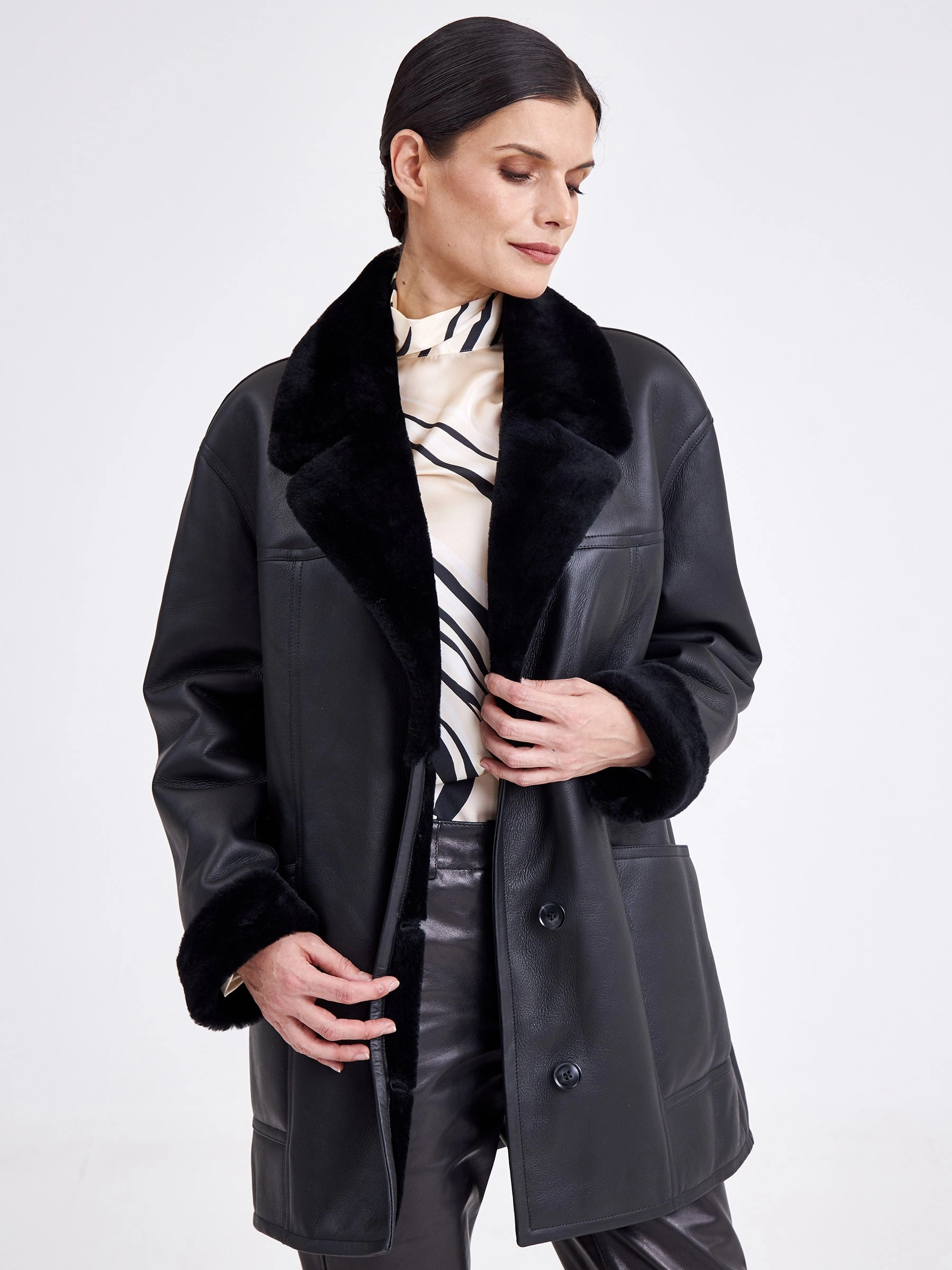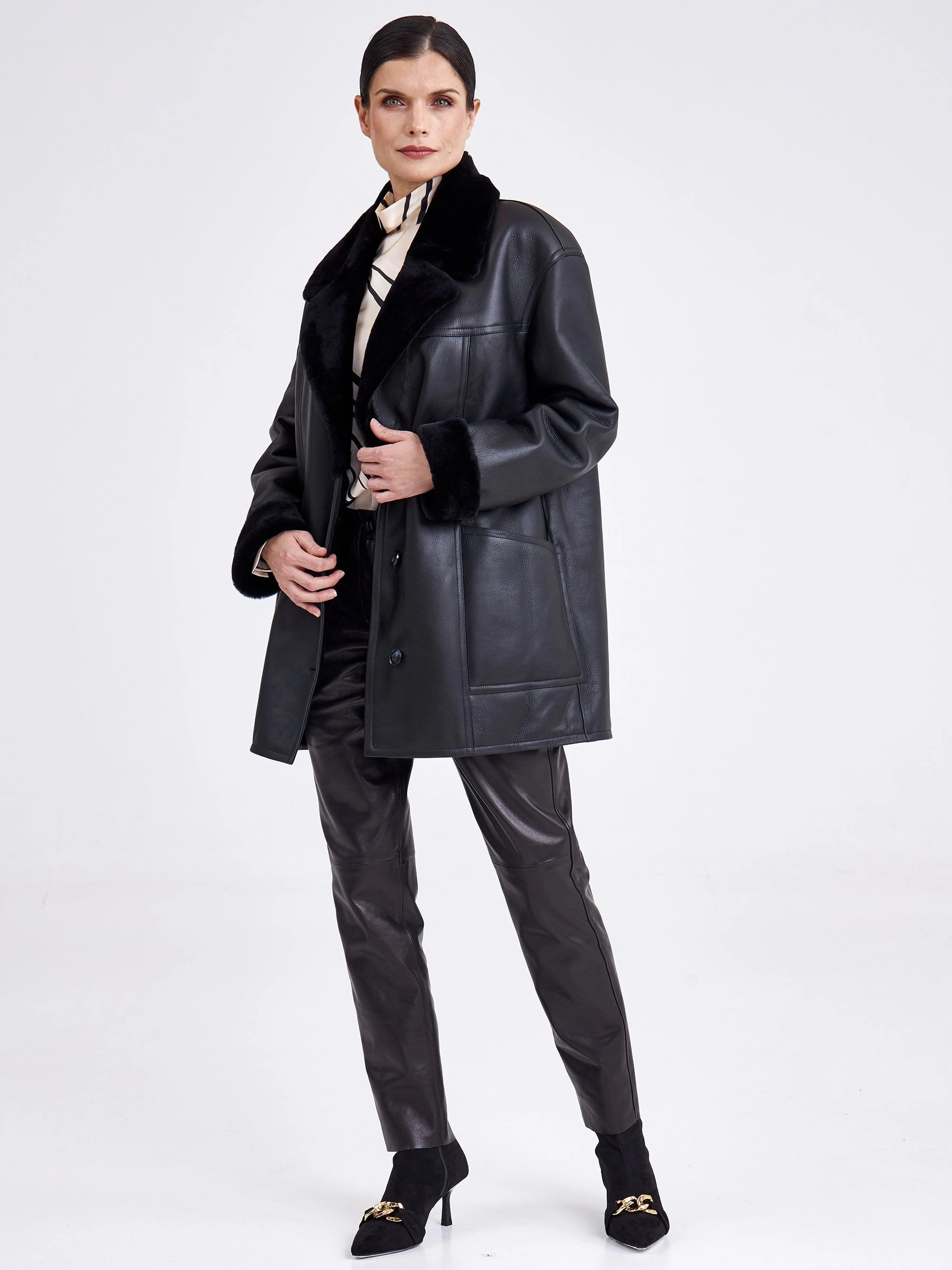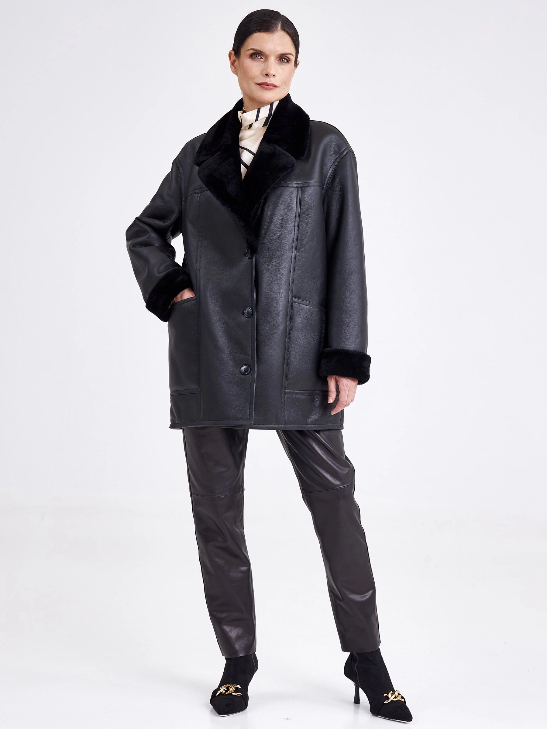 Эта модель — идеальный симбиоз классического кроя пиджака и уютной фактуры дублёнки. Она выполнена из эластичной овчины «мерино» бережной выделки, которая обеспечивает комфорт, лёгкость и превосходную терморегуляцию. Её прямой силуэт с аккуратной спущенной линией плеч и английским воротником создаёт образ умной повседневности, а застёжка на пуговицы и отсутствие капюшона подчёркивают лаконичность фасона. Длина до середины бедра (около 75–90 см) делает её универсальным вариантом для межсезонья и мягкой зимы. Дублёнка не имеет традиционной подкладки — её внутренняя сторона представляет собой обработанный мягкий мех овчины, который приятен на ощупь и отлично сохраняет тепло. Практичности добавляют два вместительных кармана, а широкий пояс в комплекте позволяет менять восприятие силуэта, добавляя ему строгости или лёгкой небрежности. Совет от стилиста: носите её как элегантную альтернативу пиджаку с брюками и водолазкой или как верхний слой поверх объёмного свитера — пояс поможет сохранить чёткий силуэт и заверши