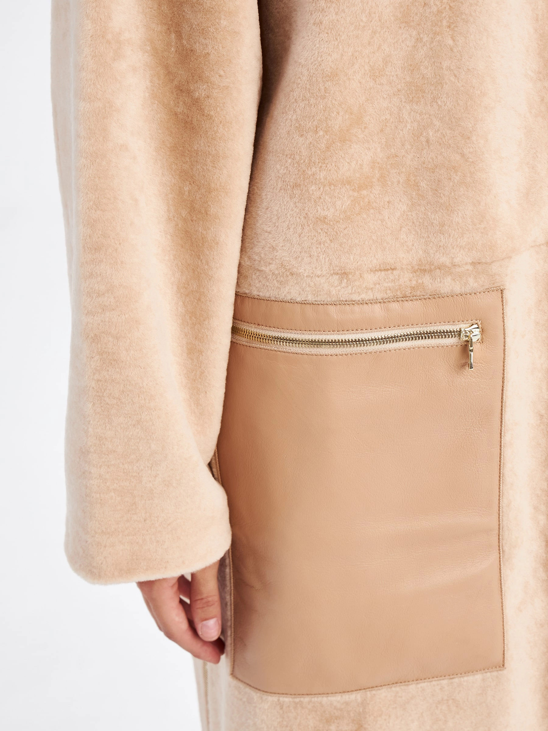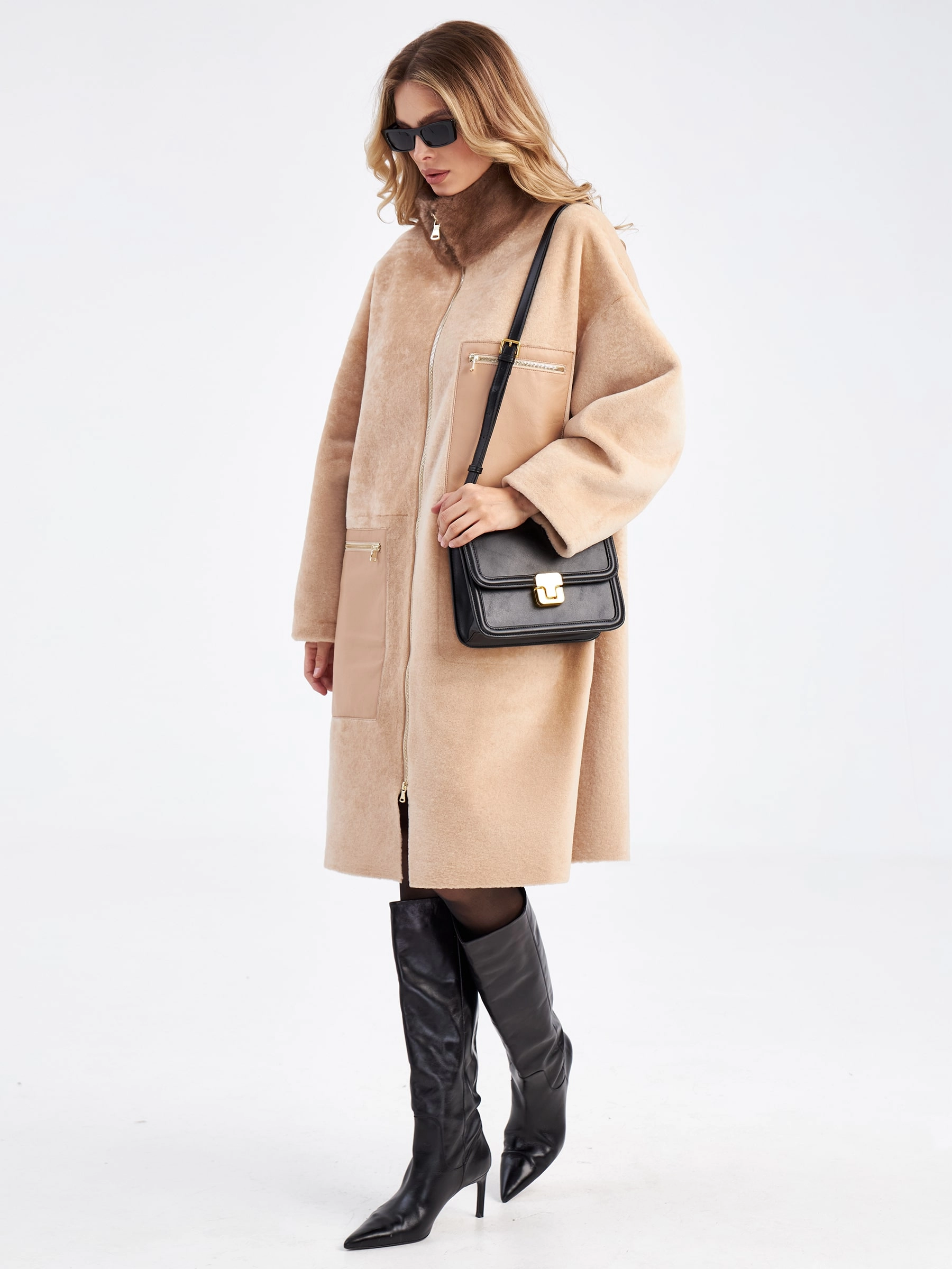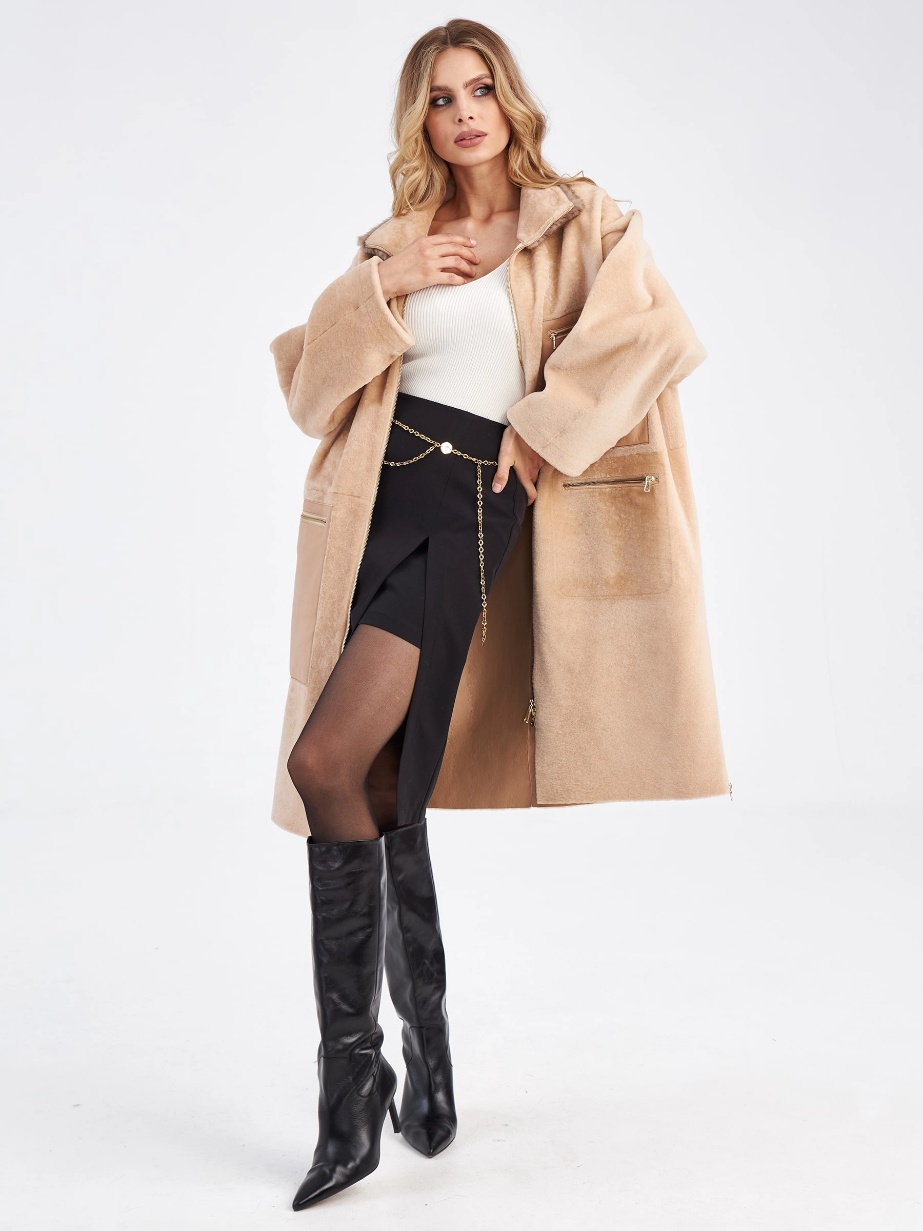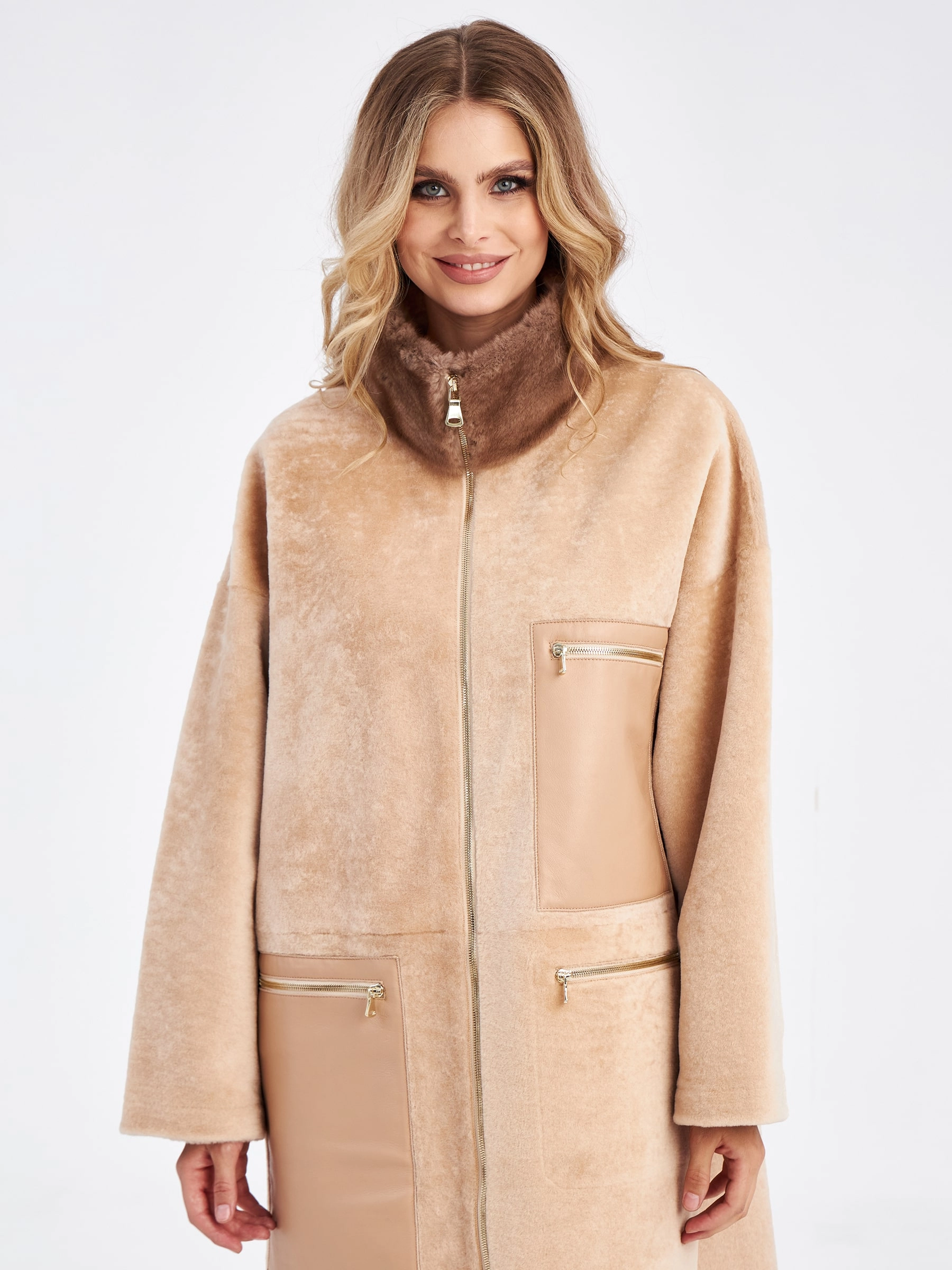 Эту модель мастера выполнили для дам, которые привыкли ценить комфорт и функционал. Для пошива использовали нежную стриженную овчину-астраган с гладкой фактурой с одной стороны и плотным мехом с другой. Прямой крой. Застежка - двухзамковая молния. Для защиты от холода послужит воротник - стойка, дополненный густой низковорсовой норкой. За декор взяли два асимметричных накладных кармана в гладкой коже. Боковые разрезы как и само изделие-застегиваются крупной молнией в цвете-золото.