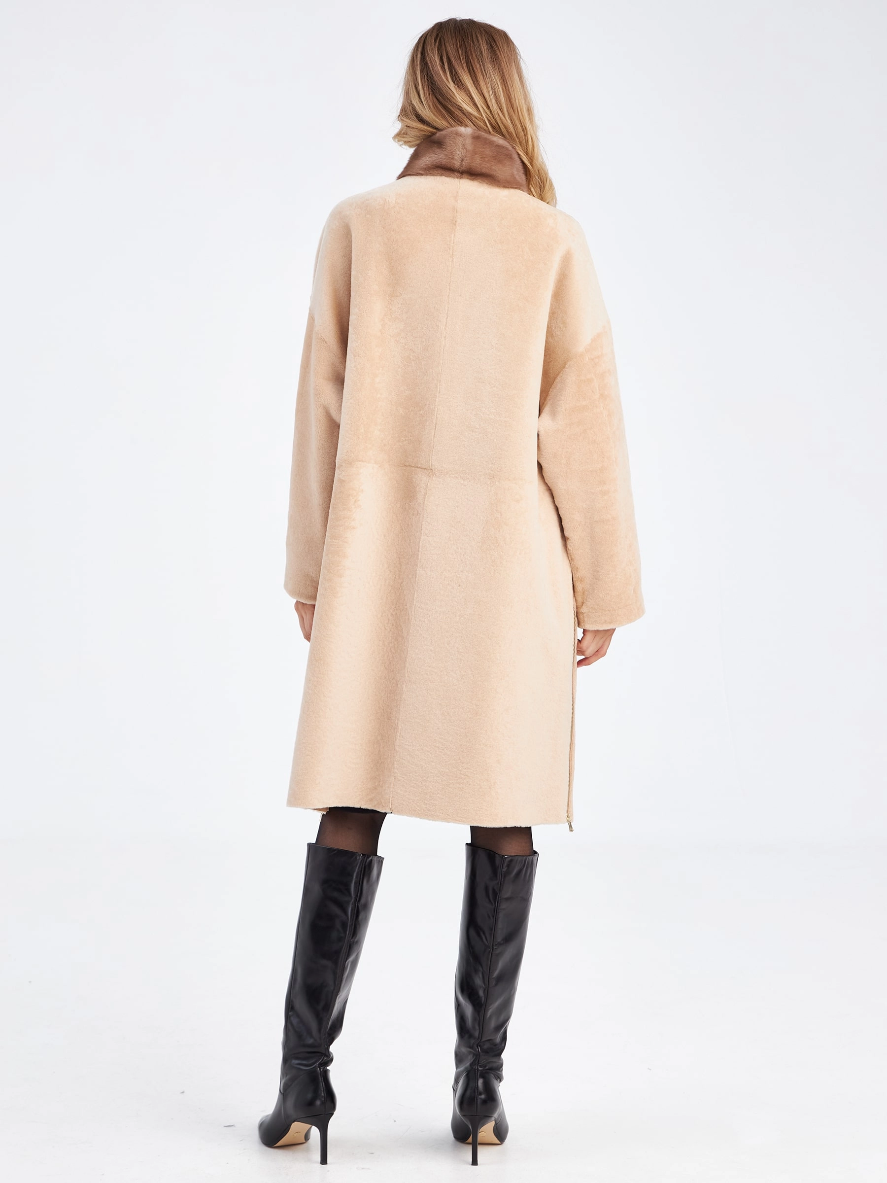 Товар длинная молодежная женская дубленка с норковым воротником премиум класса 2041, бежевая, размер 46, артикул 63130 выполнен из овчина "мерино" с застежкой молния. Рассчитан на сезон: осень-зима. Длина изделия 110 см, силуэт прямой.