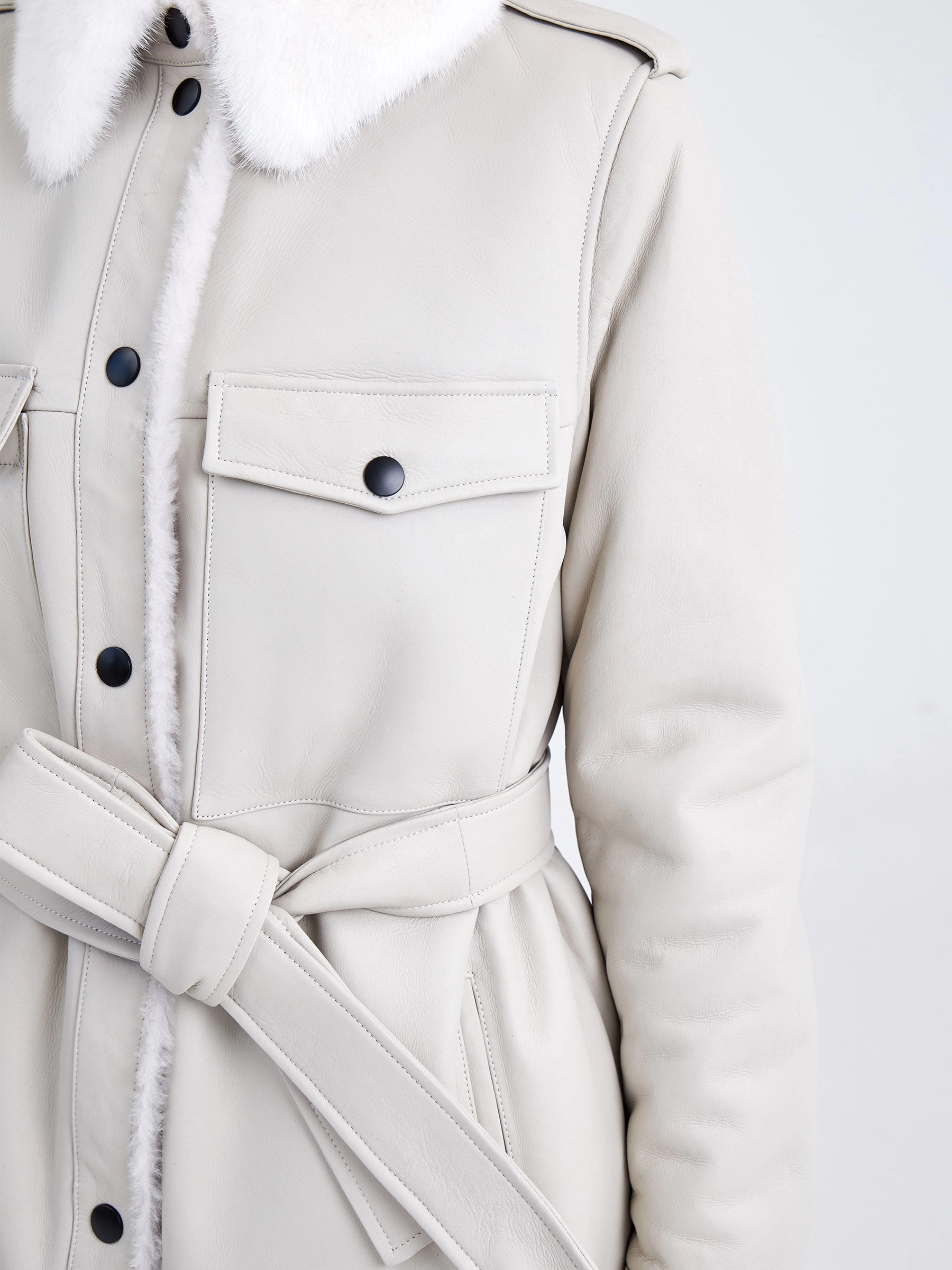 Товар женская дубленка рубашка с воротником из меха норки премиум класса 2016, белая, размер 48, артикул 62740 выполнен из овчина "мерино" с застежкой кнопки. Рассчитан на сезон: осень-зима. Длина изделия свыше 90 см, силуэт прямой.