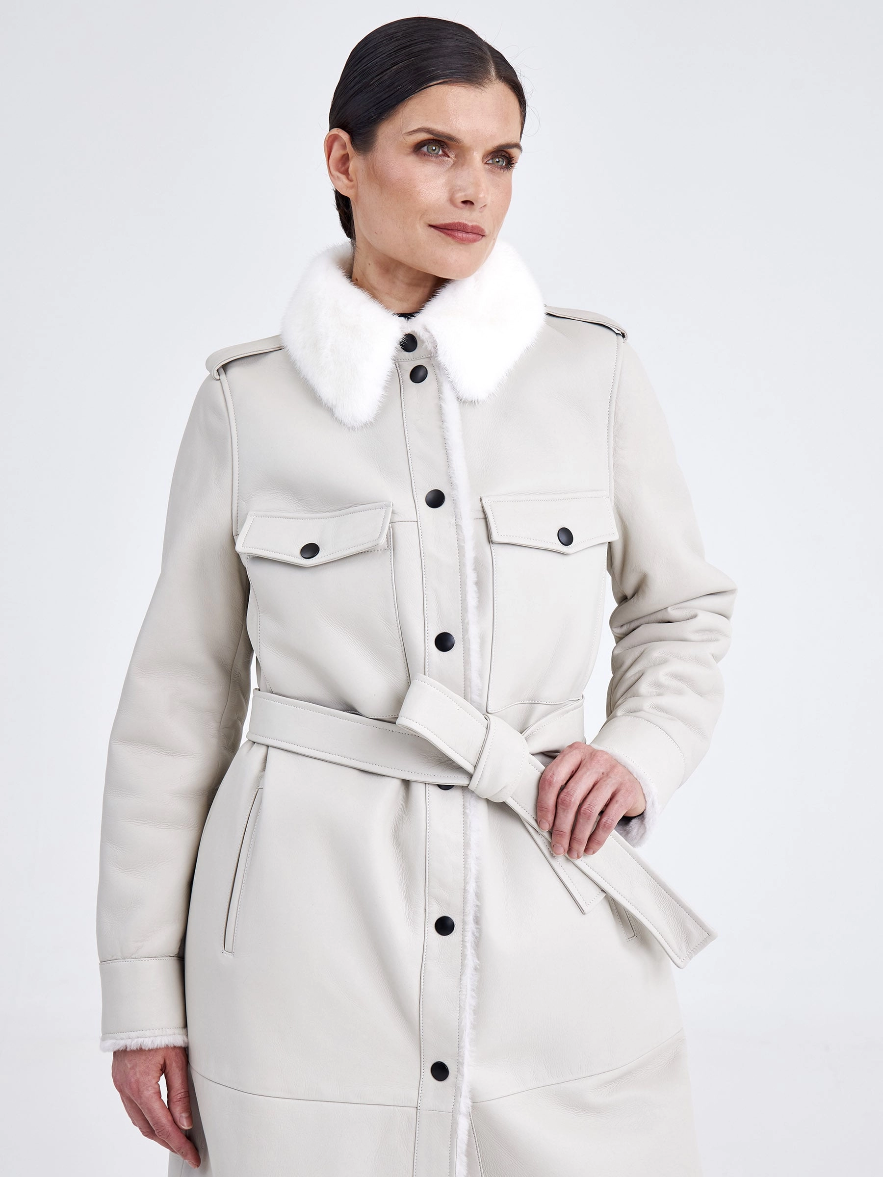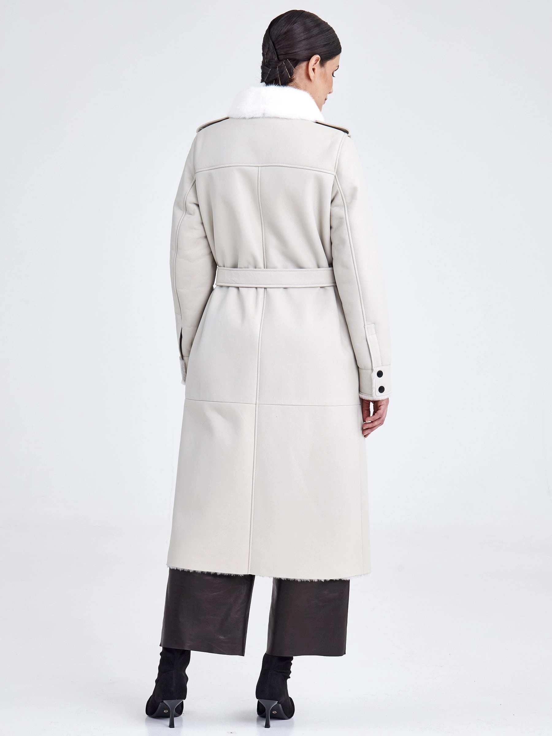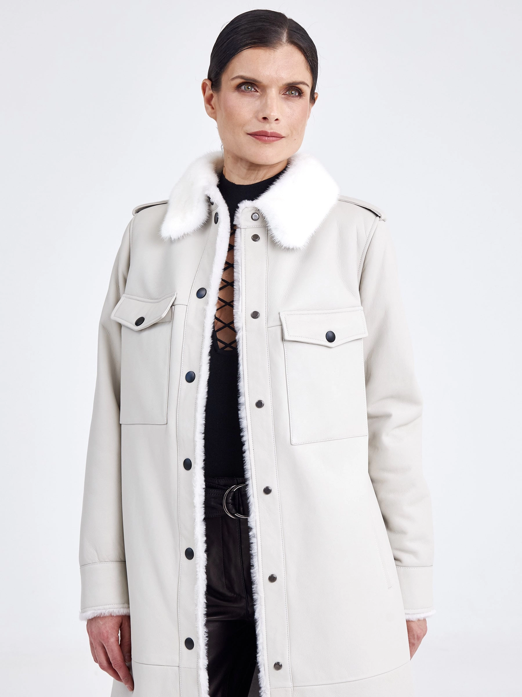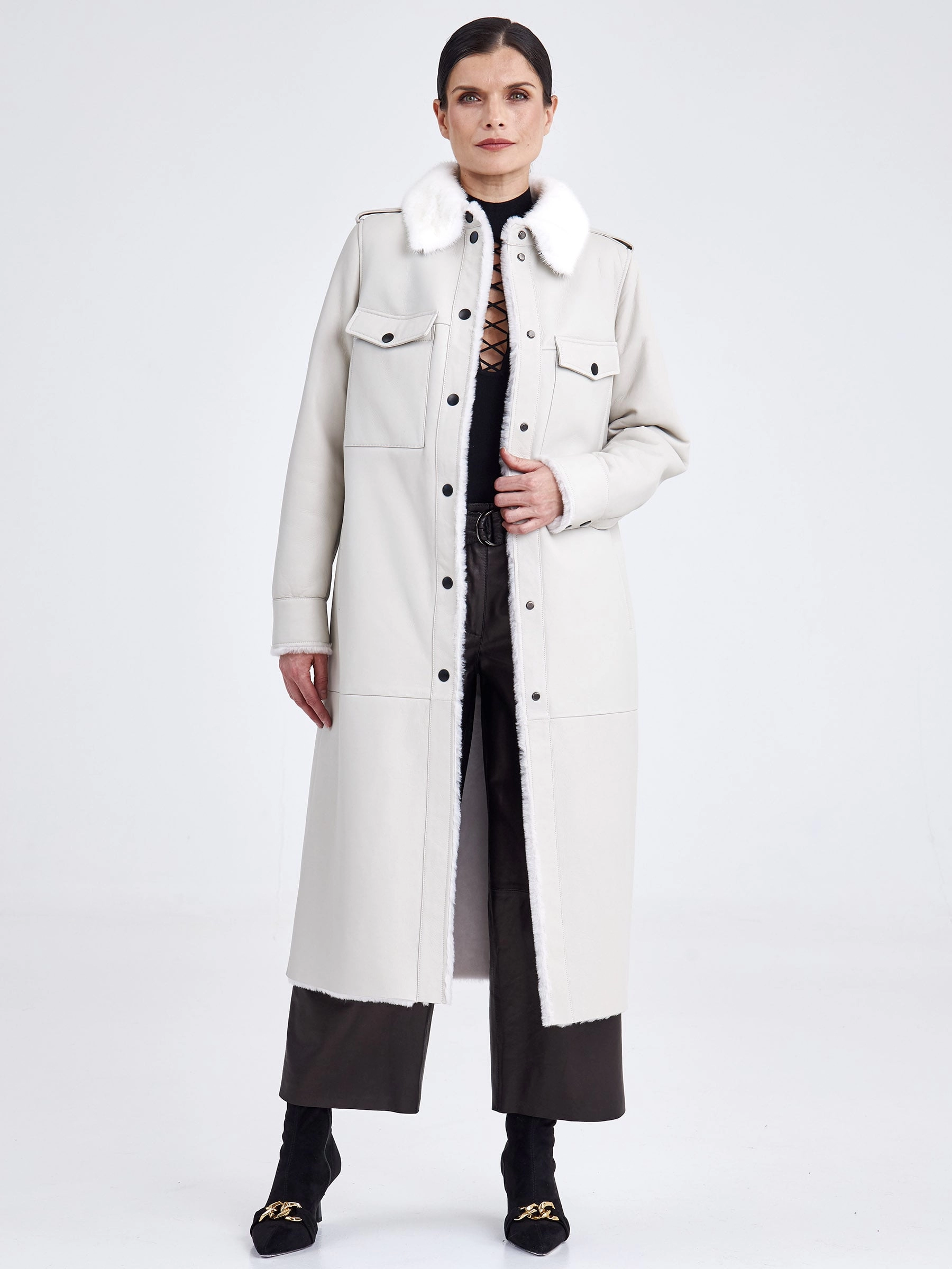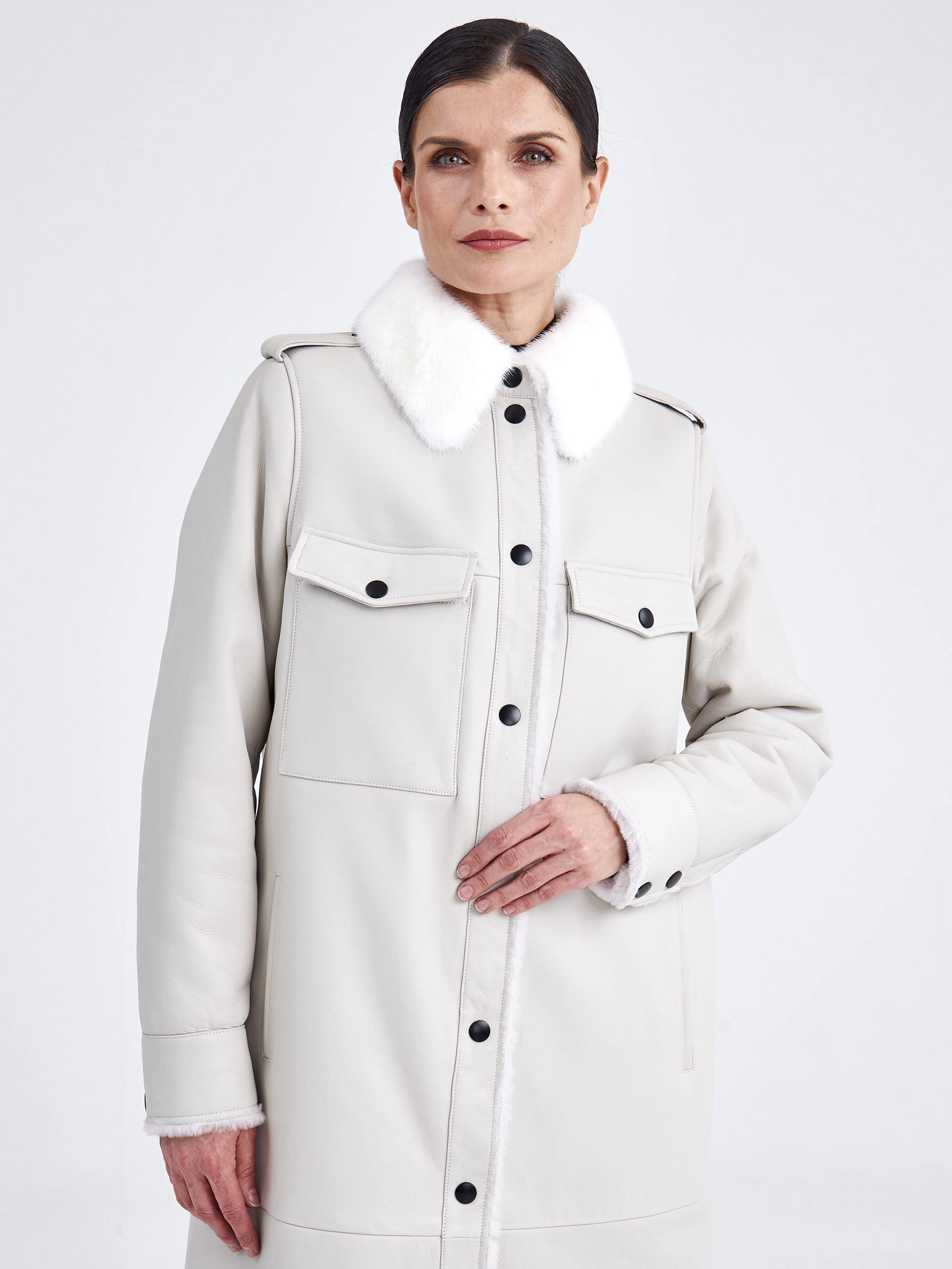 Эта удлинённая дублёнка (свыше 90 см) — современная интерпретация джинсовой рубашки, выполненная из мягкой и плотной овчины «мерино». Она идеально подходит для повседневной носки осенью и зимой. Модель с прямым силуэтом и втачными плечами имеет расслабленную, но аккуратную посадку. Внешняя сторона выполнена из гладкой кожи, а внутренняя — из тёплого меха той же овчины, что обеспечивает отличную терморегуляцию без использования подкладки. Ключевые детали, позаимствованные у рубашки: отложной воротник, отделанный нежной густой норкой, манжеты на рукавах, а также нагрудные и боковые карманы для практичности. Застёжка на кнопки делает носку удобной, а универсальный крой позволяет легко сочетать модель с любой одеждой и обувью — от джинсов до платьев.