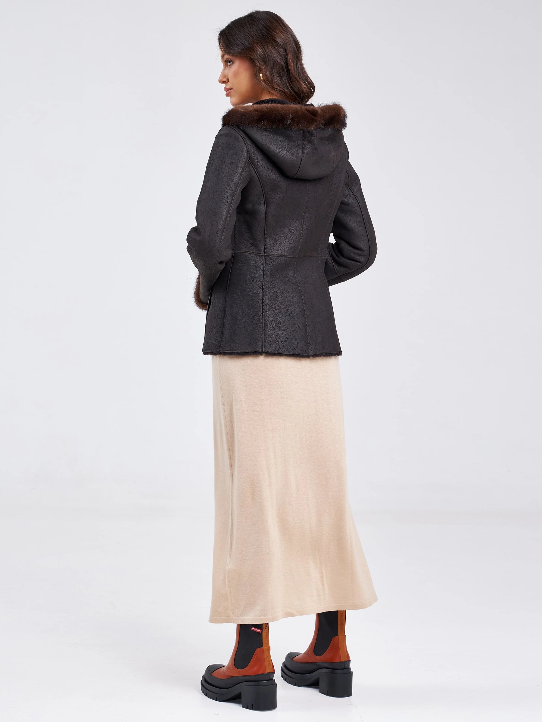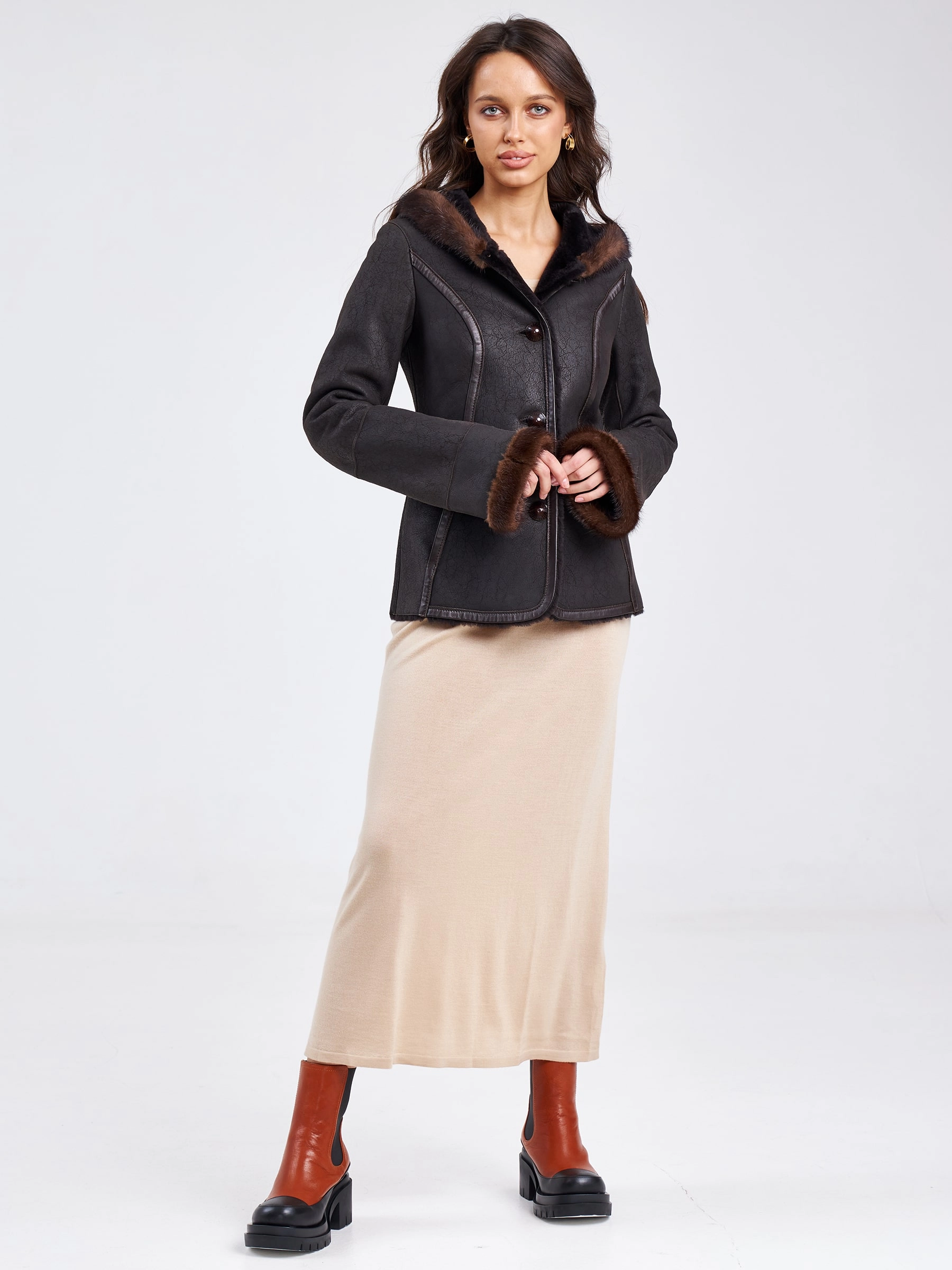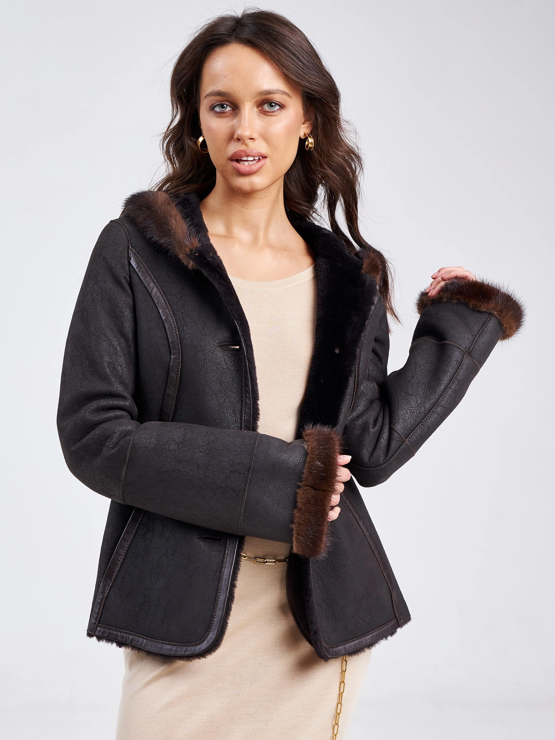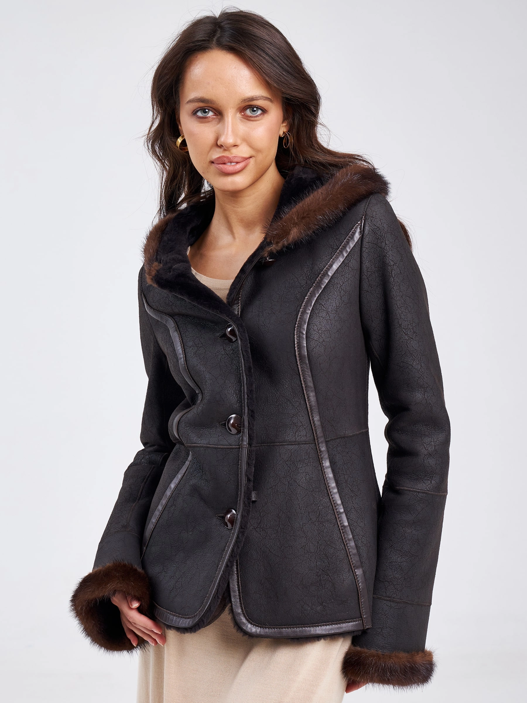 Товар короткая женская дубленка с капюшоном и мехом норки 240, коричневая, размер 40, артикул 62870 выполнен из овчина "тоскана" с застежкой пуговицы. Рассчитан на сезон: осень-зима. Длина изделия 65 см, силуэт полуприлегающий.